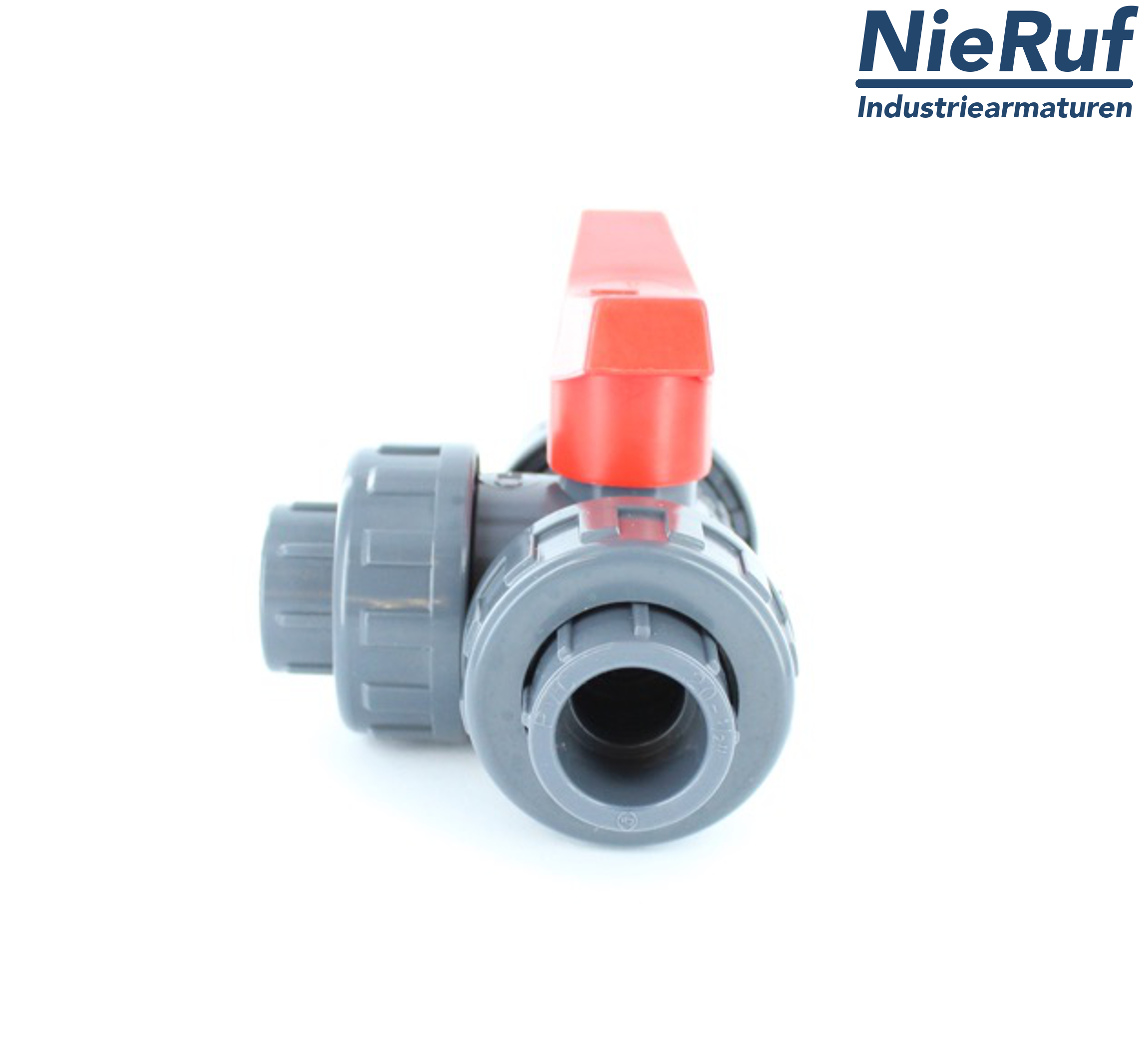 3 drożny zawór kulowy z PVC-U d 20 KK03 z tuleją samoprzylepną, uszczelnienie z PTFE/EPDM, z dźwignią ręczną i otworem L do płynnych i gazowych mediów