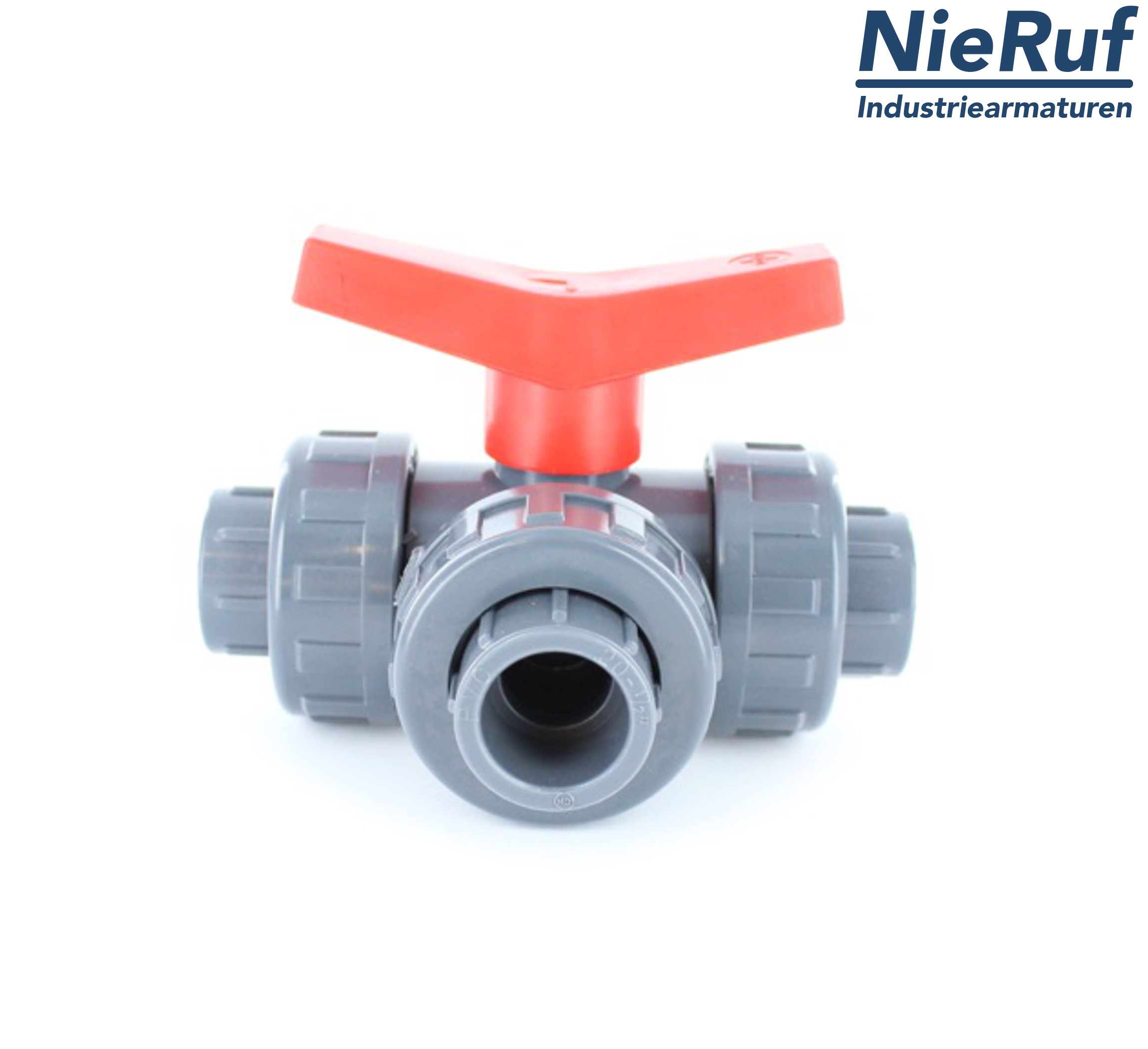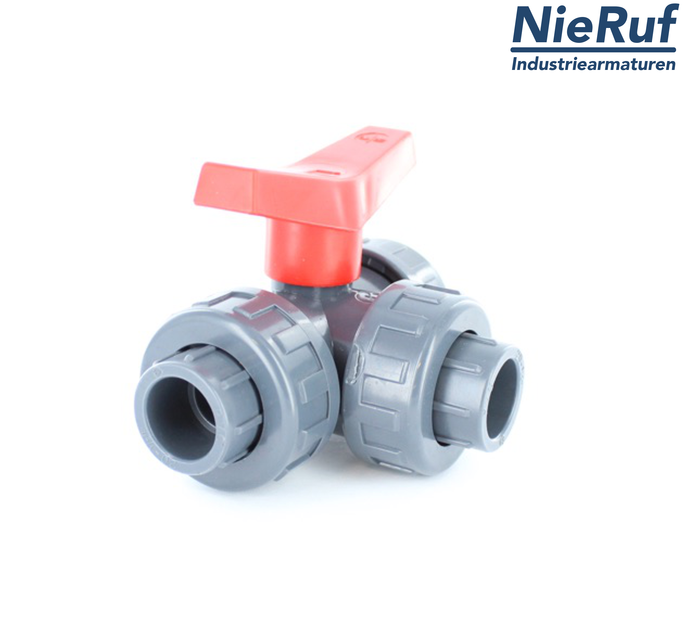 3-drożny zawór kulowy PVC z tuleją samoprzylepną i dźwignią o kompaktowej konstrukcji. Do odcinania systemów. Z otworem L.