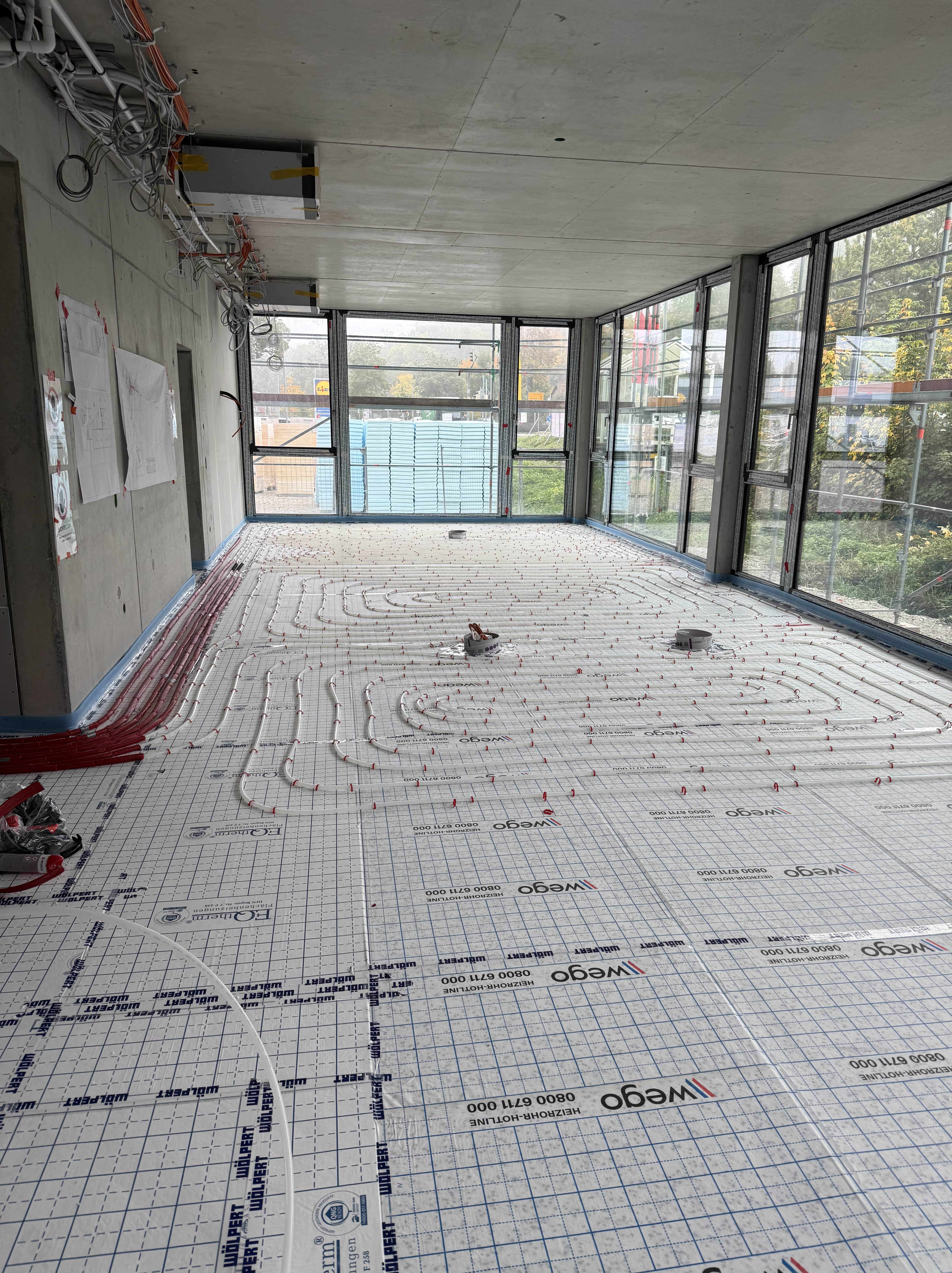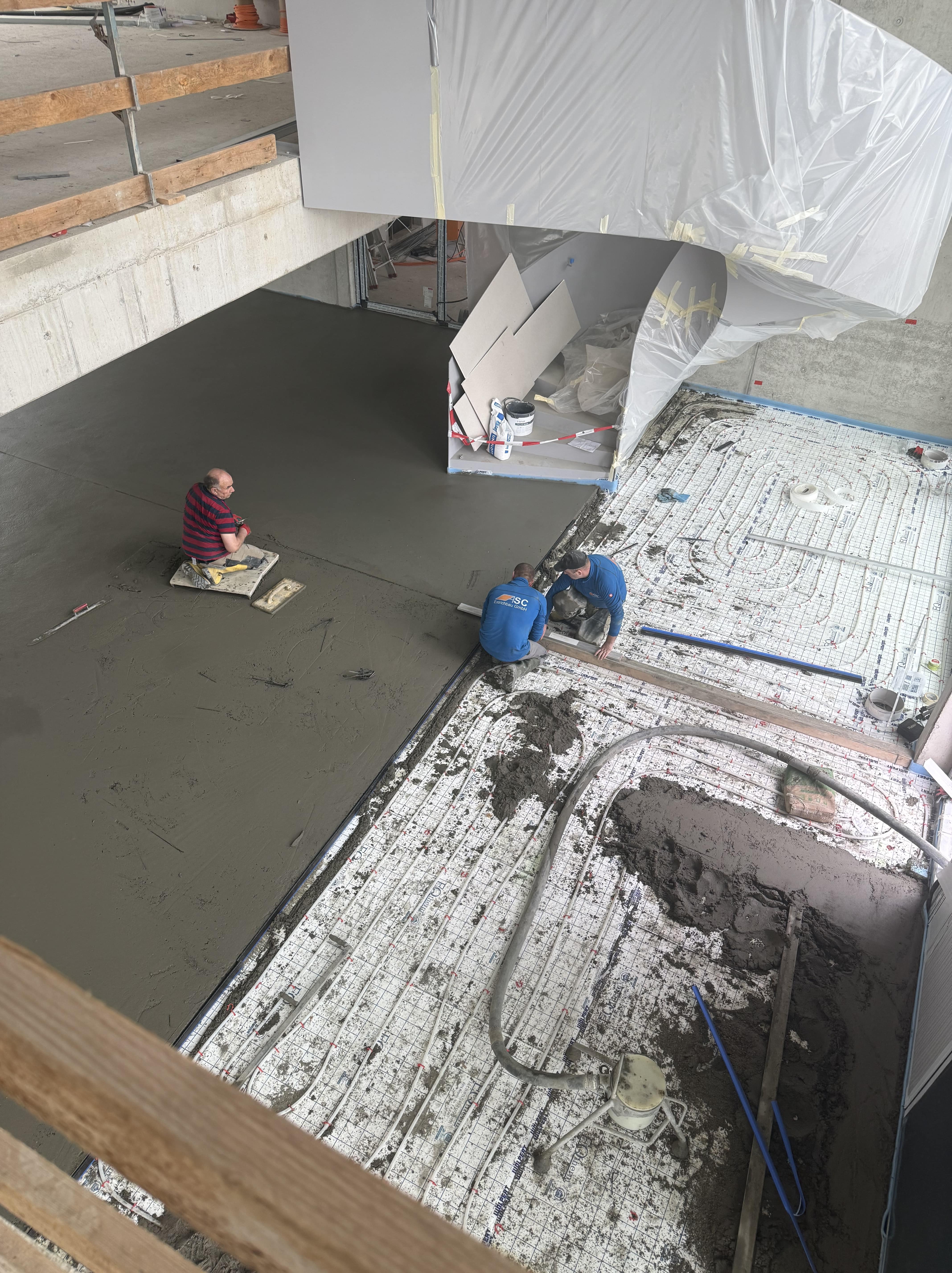 Ponadto zostały ułożone rury ogrzewania podłogowego i wykonano pierwszą wylewkę. Krok po kroku powstaje wnętrze budynku, które wkrótce zapewni przyjemne ciepło i nowoczesny komfort.