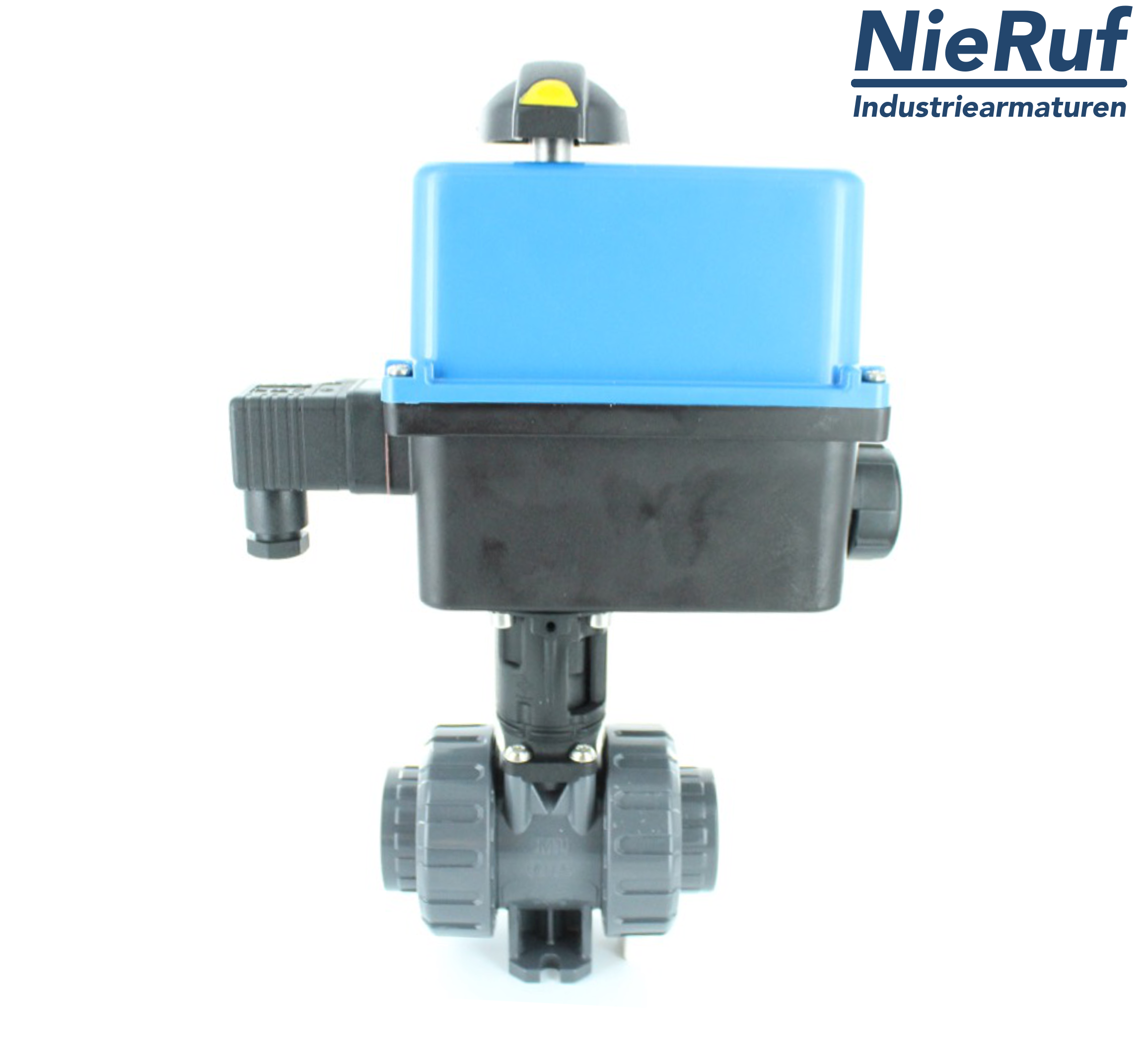 Elektryczny zawór kulowy z PVC-U DN10 - 3/8" cala KK05 tuleją z gwintem, uszczelnienie z EPDM, napęd elektryczny 90-240 V do płynnych i gazowych mediów
