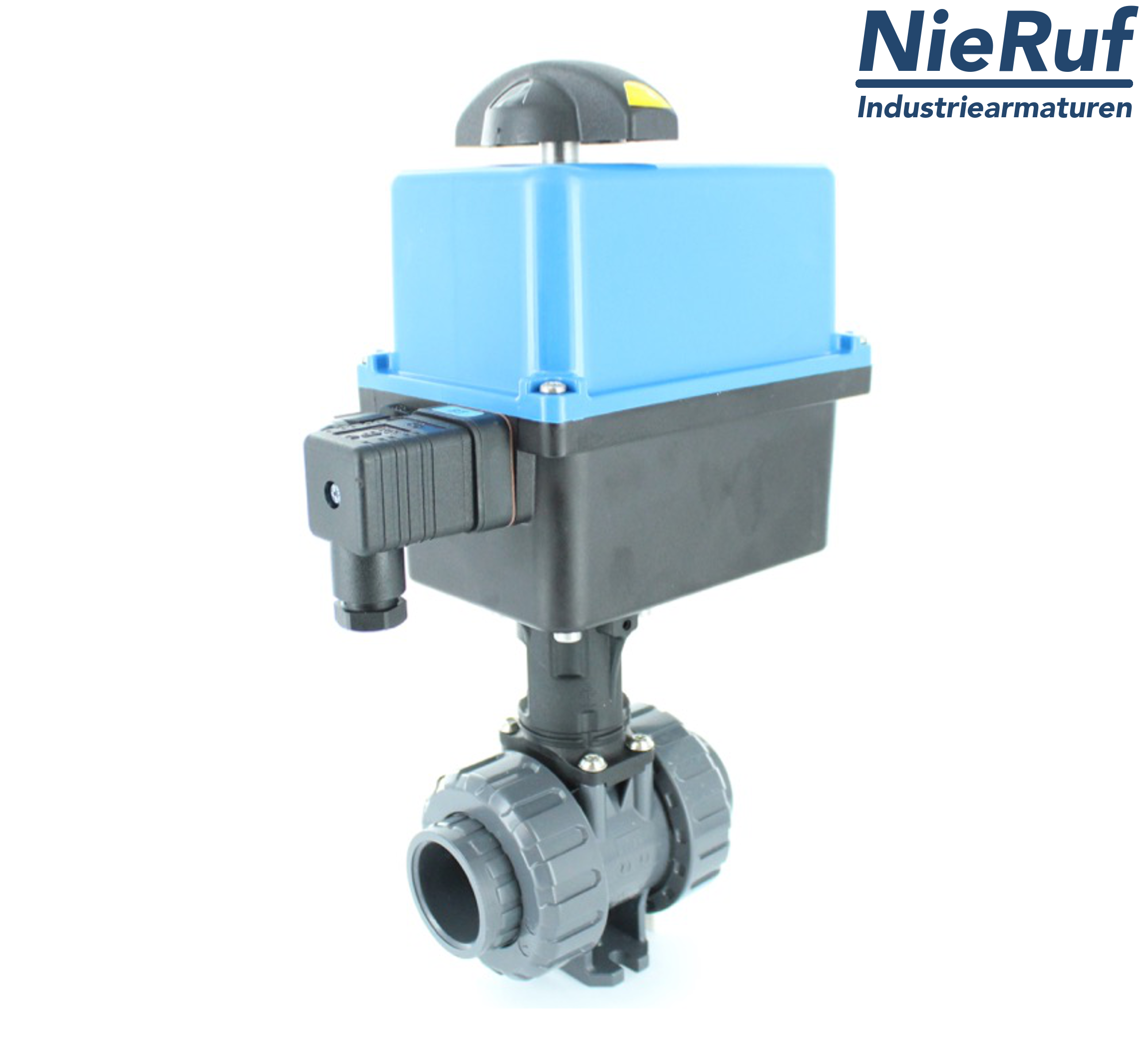 Elektryczny zawór kulowy z PVC-U DN20 - 3/4" cala KK05 tuleją z gwintem, uszczelnienie z EPDM, napęd elektryczny 24 V do płynnych i gazowych mediów