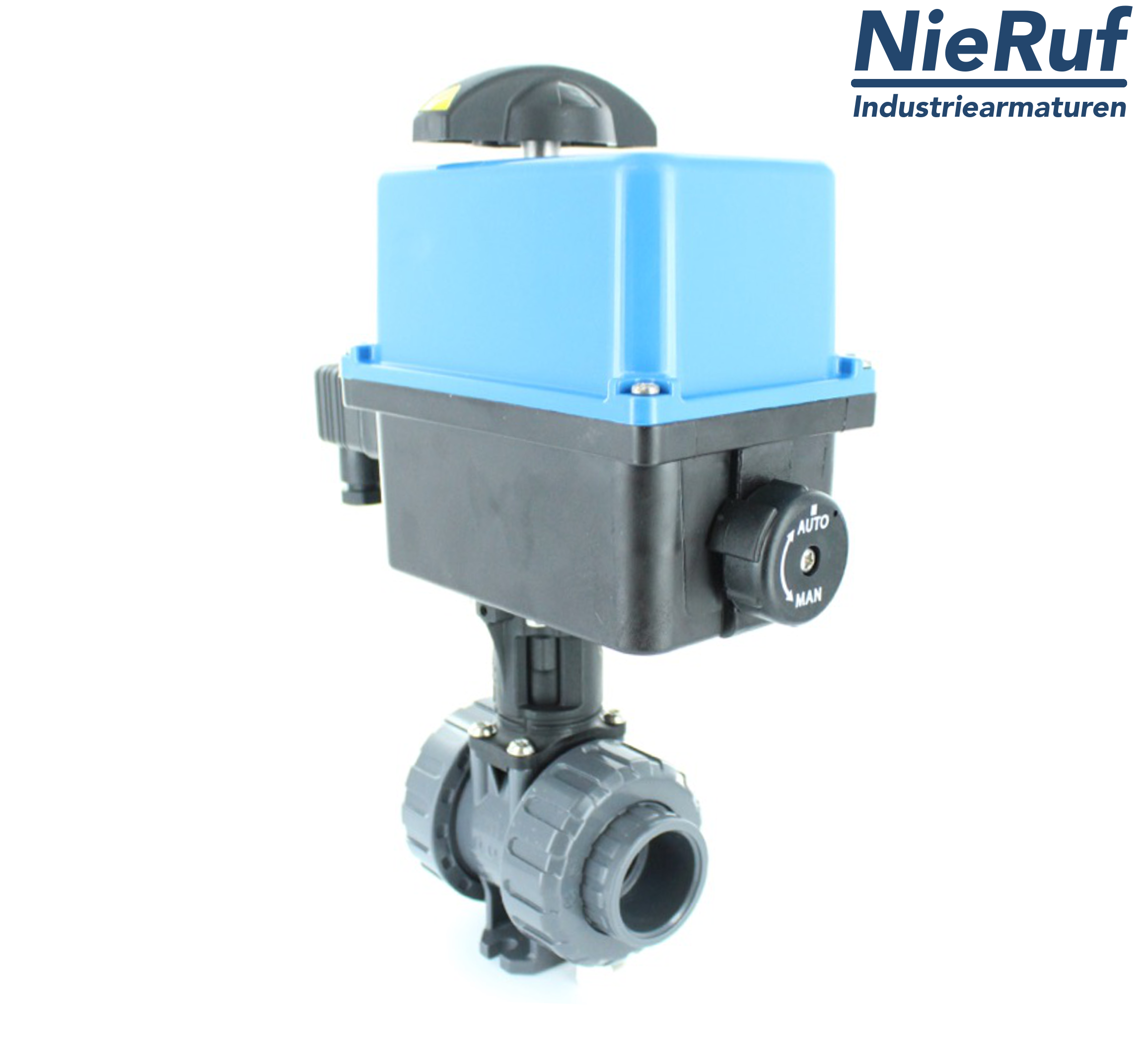 Elektryczny zawór kulowy z PVC-U DN25 - 1" cal KK05 tuleją z gwintem, uszczelnienie z EPDM, napęd elektryczny 90-240 V do płynnych i gazowych mediów