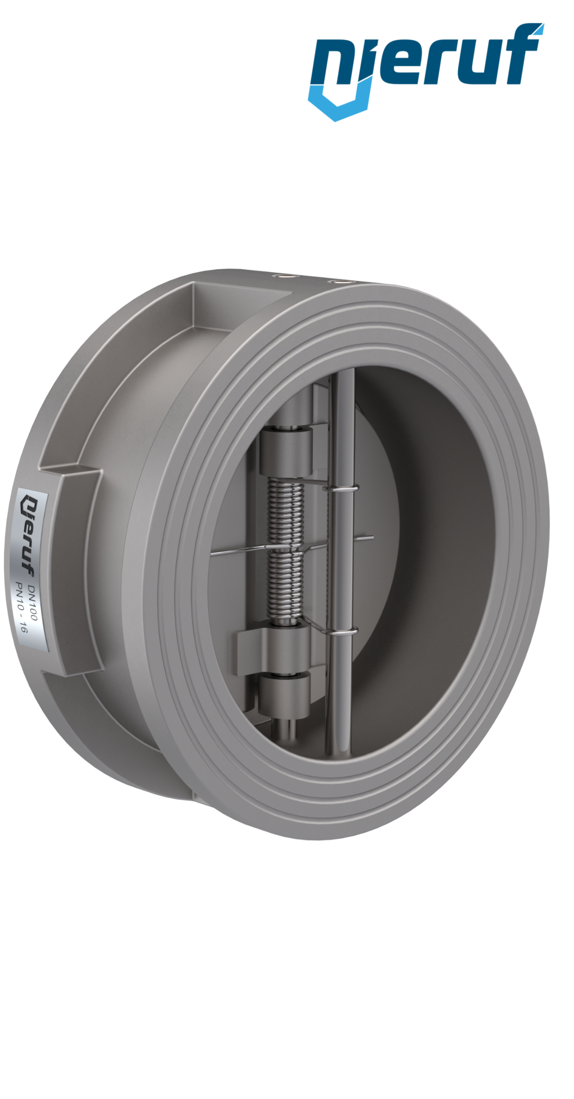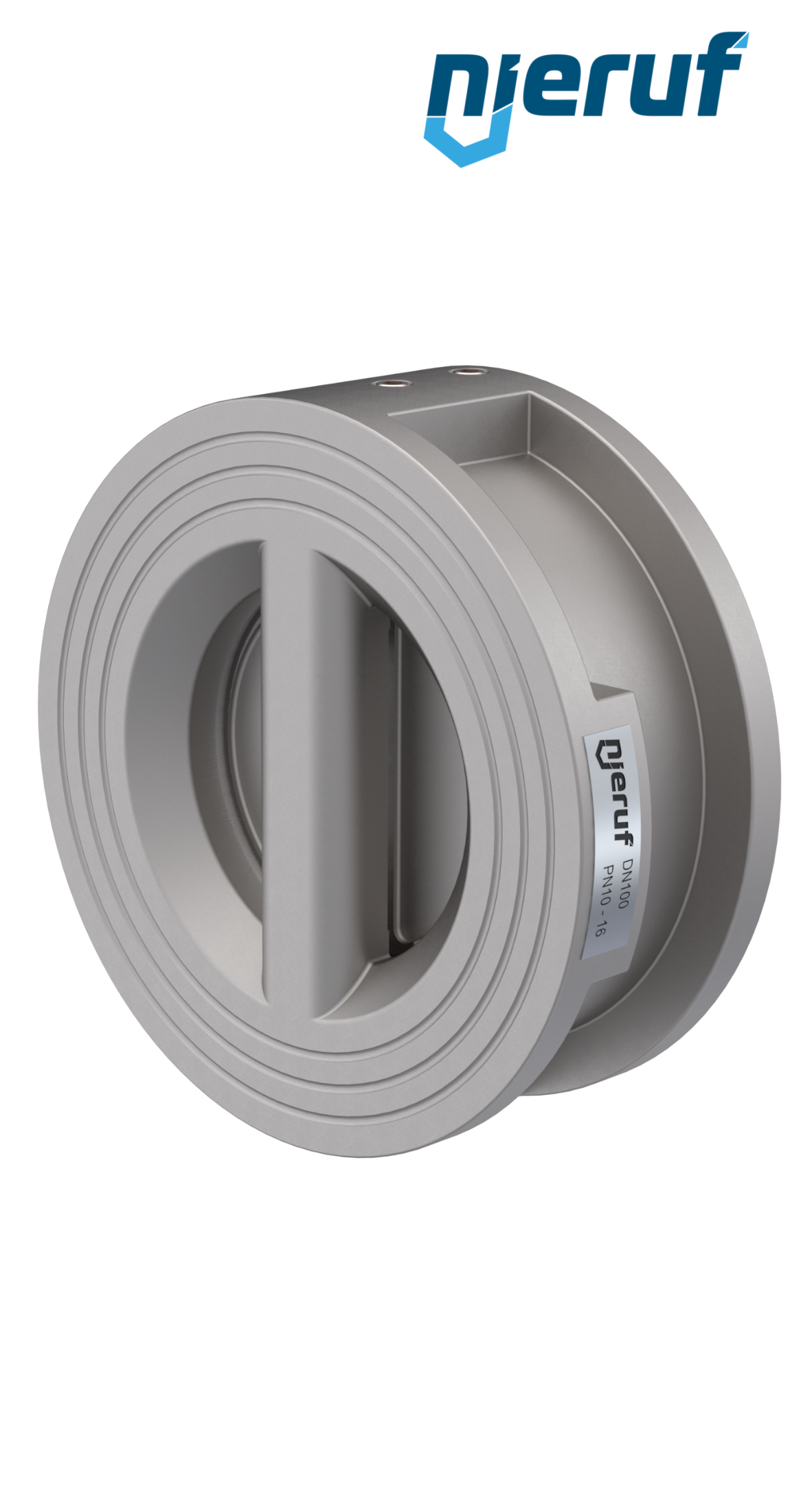 Klapa zwrotna dwuskrzydłowa DN100 uszczelnienie FKM (Viton) PN 10/16 DIN EN 1092-1 Forma B, korpus i skrzydła ze Stal nierdzewna 1.4408