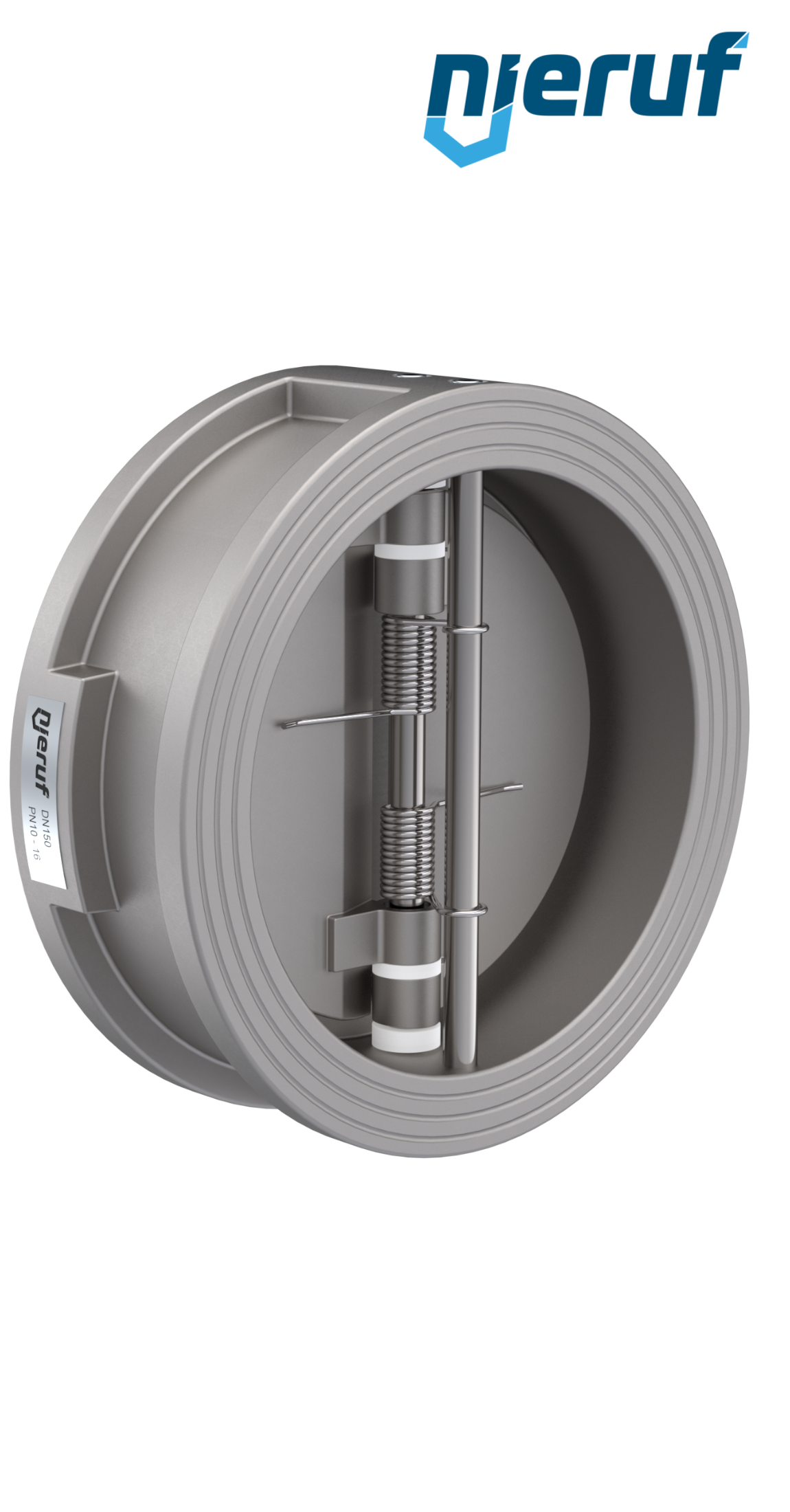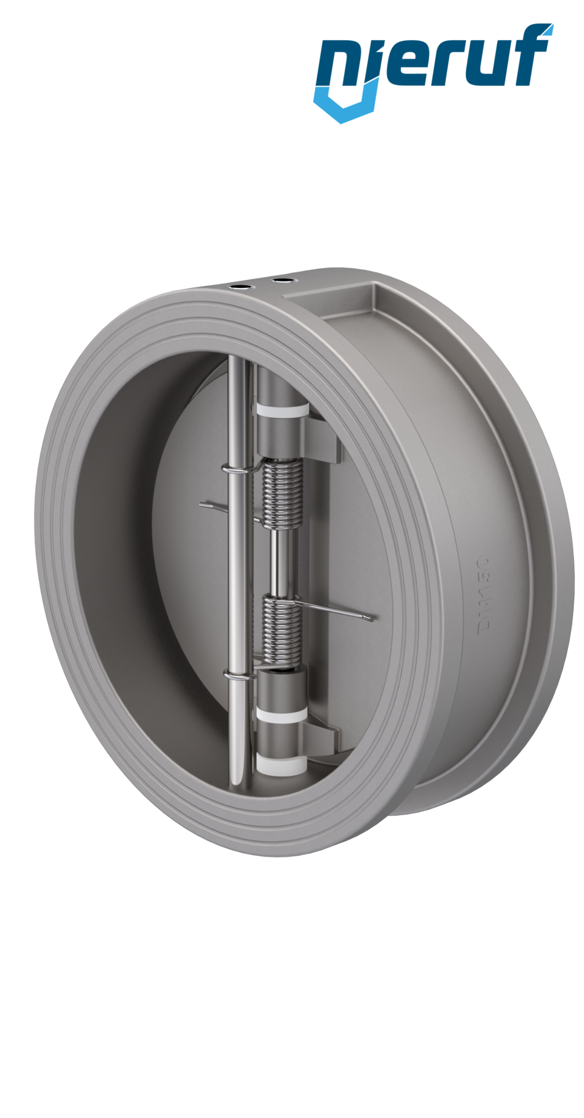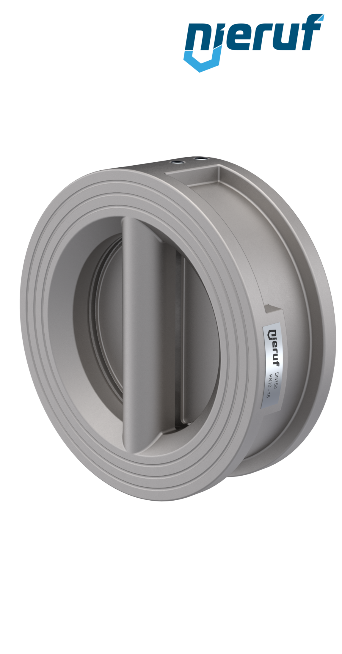 Klapa zwrotna dwuskrzydłowa DN150 uszczelnienie FKM (Viton) PN 10/16 DIN EN 1092-1 Forma B, korpus i skrzydła ze Stal nierdzewna 1.4408