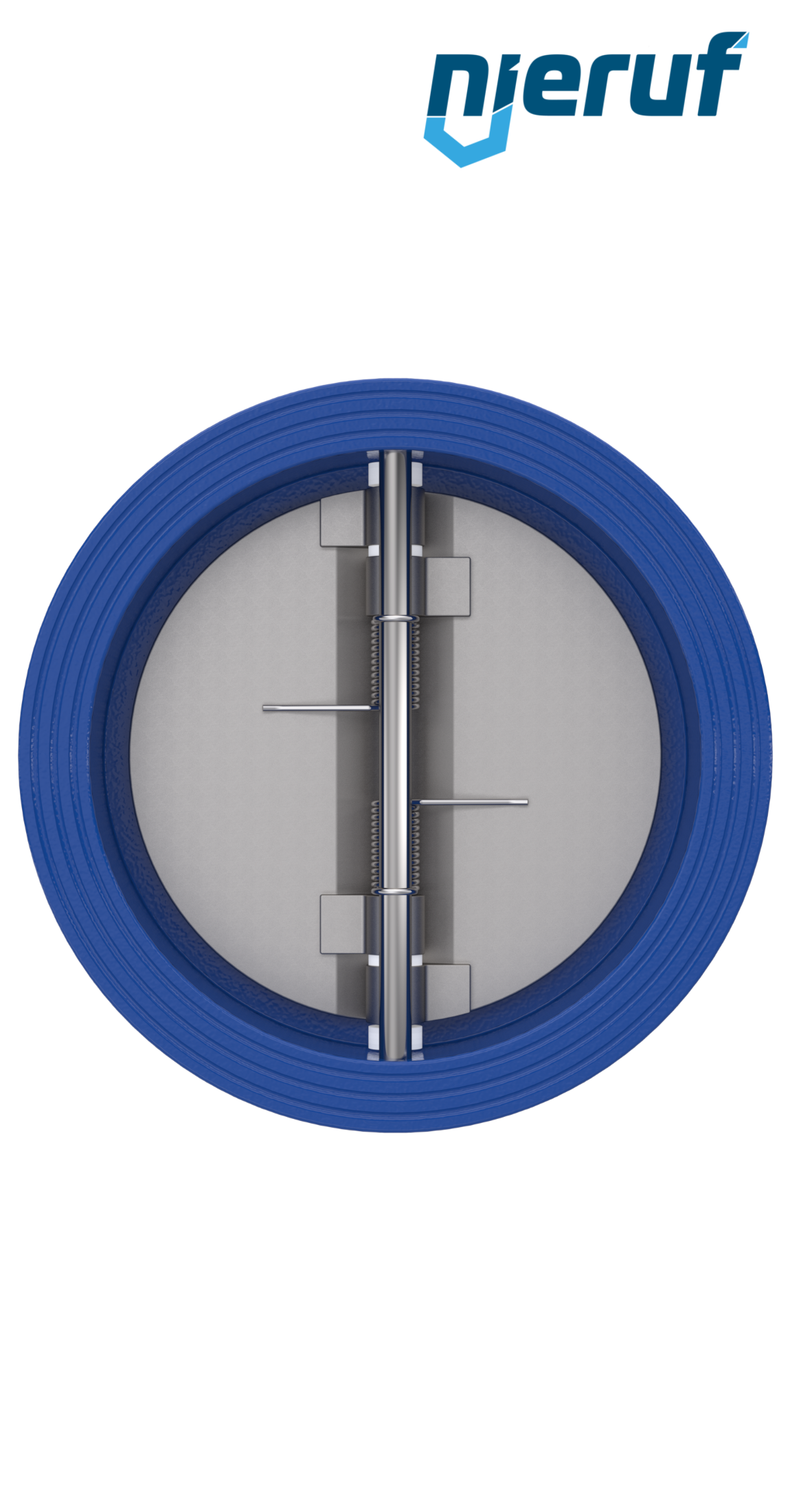 Klapa zwrotna dwuskrzydłowa DN200 uszczelnienie FKM (Viton) PN 10/16 DIN EN 1092-1 Forma B, korpus z GGG40 z niebieską powłoką epoksydową 180µm