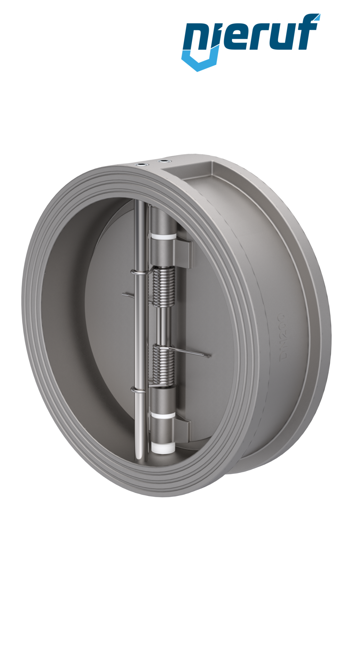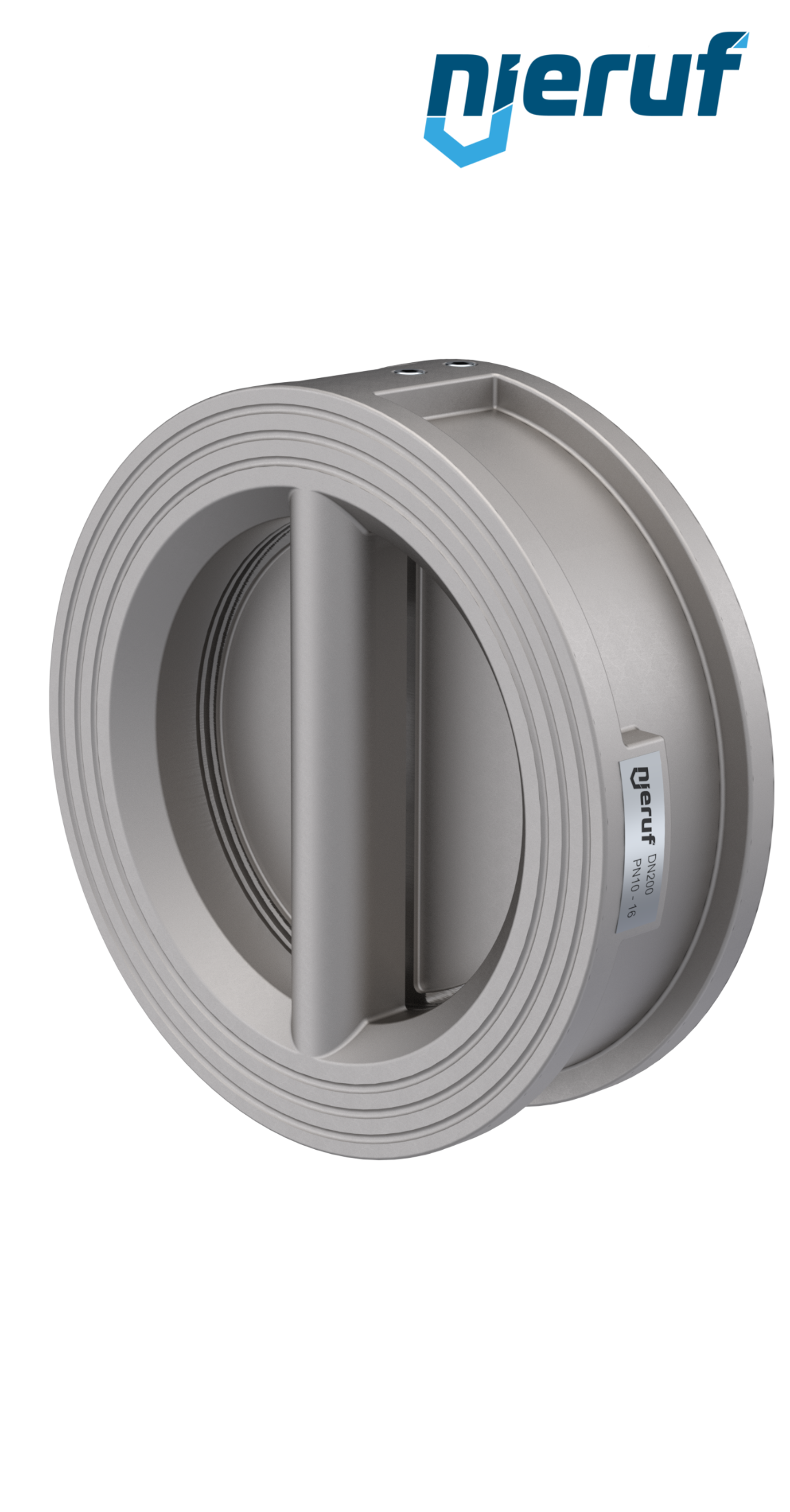 Klapa zwrotna dwuskrzydłowa DN200 uszczelnienie FKM (Viton) PN 10/16 DIN EN 1092-1 Forma B, korpus i skrzydła ze Stal nierdzewna 1.4408