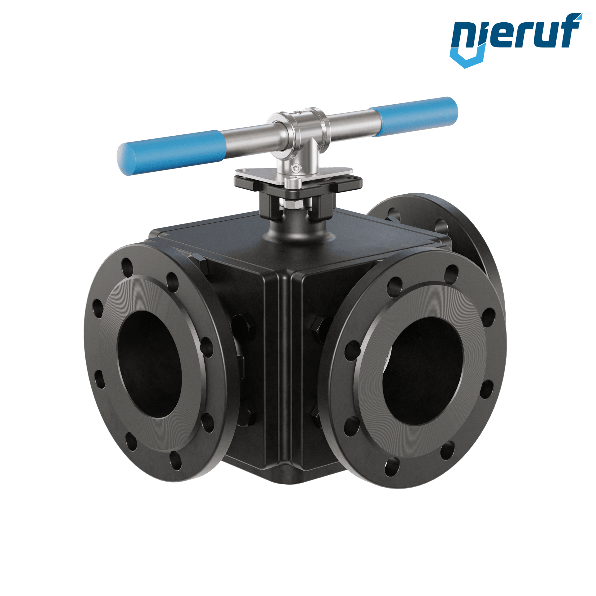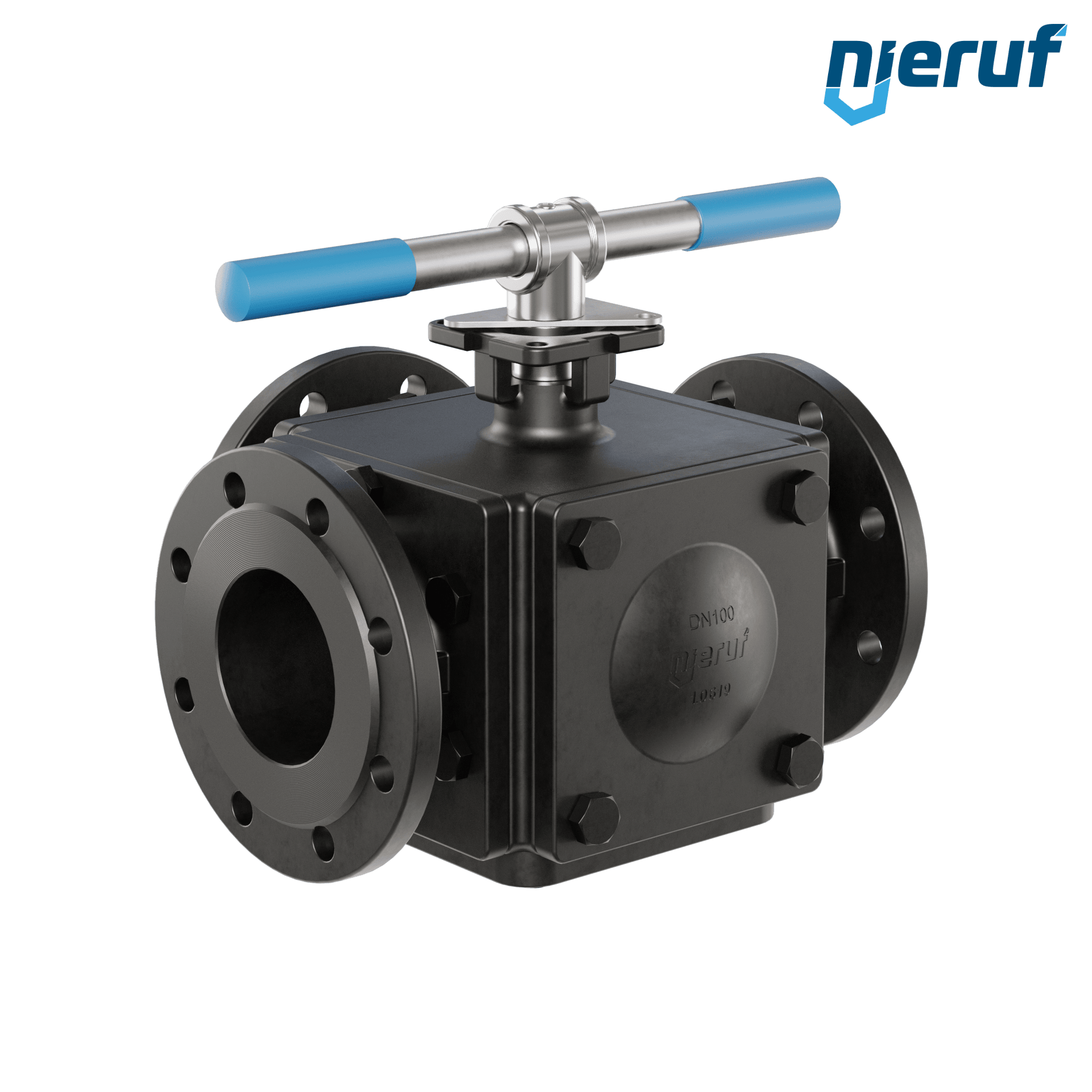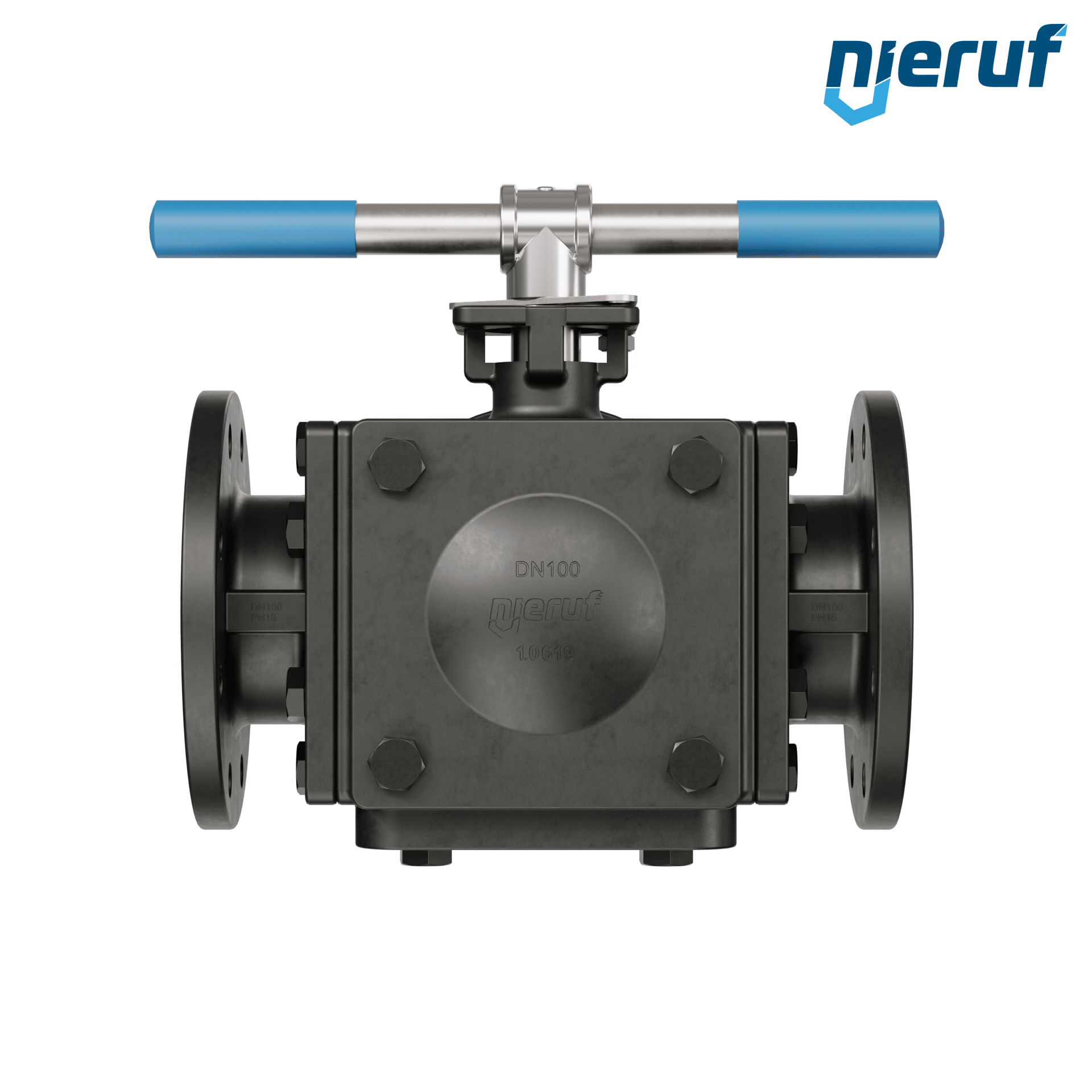 3 drożny kołnierzowy zawór kulowy DN100 PN16 FK08, korpus ze staliwa 1.0619, kula ze staliwa 1.4308, uszczelka TFM 1600/PTFE z otworem L