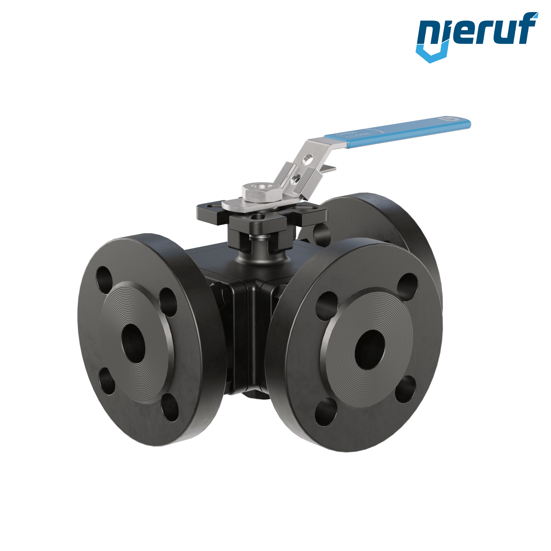 | Cechy charakterystyczne produktu | Ten wysokiej jakości 3-drożny kołnierzowy zawór kulowy wykonany z odlewu stalowego z ujemną zakładką i kołnierzem montażowym zgodnie z normą DIN ISO 5211 posiada następujące atesty: PED 97/23/EC, kategoria 3 moduł H, TA-Luft 2002. Ten zawór posiada otwór L (L=1) |