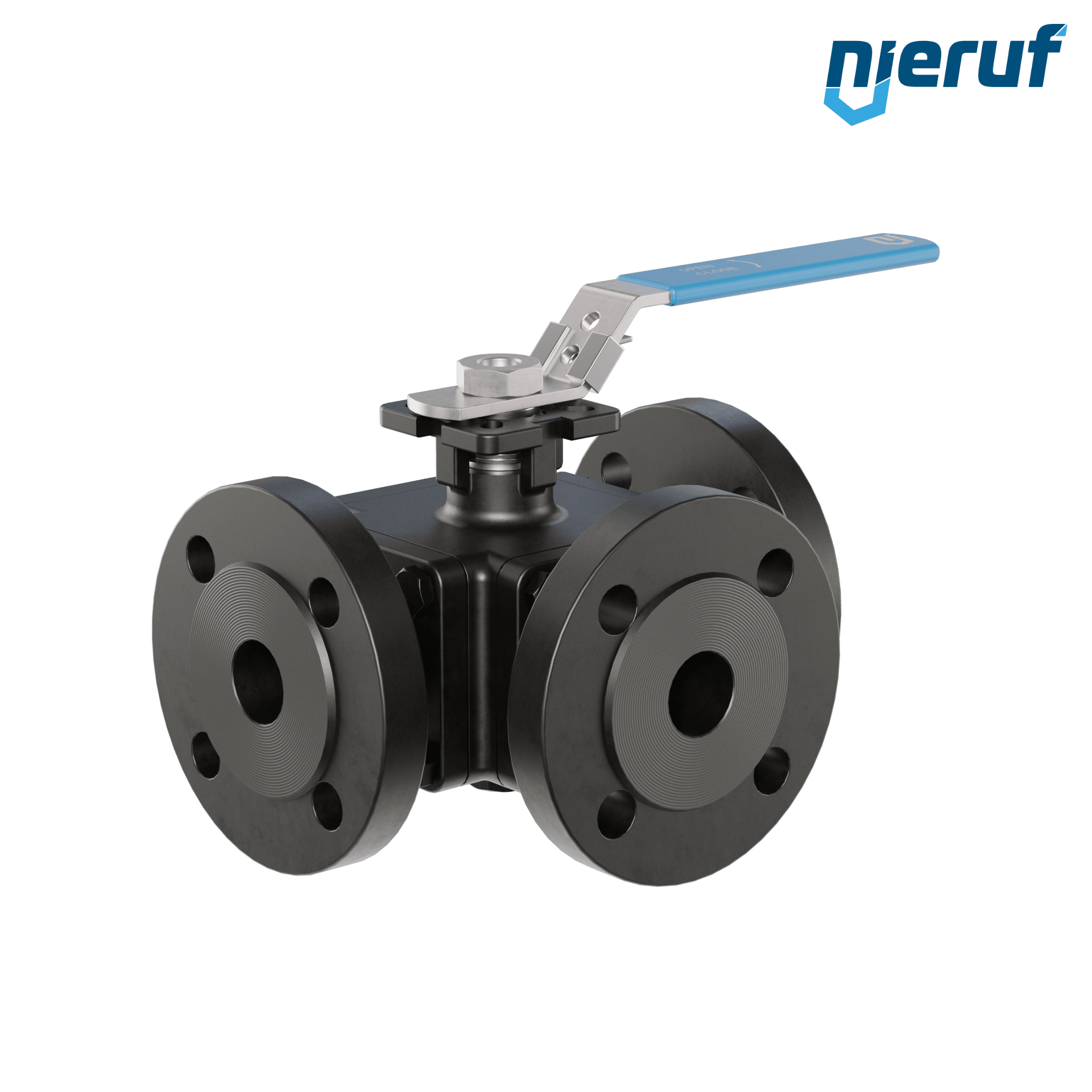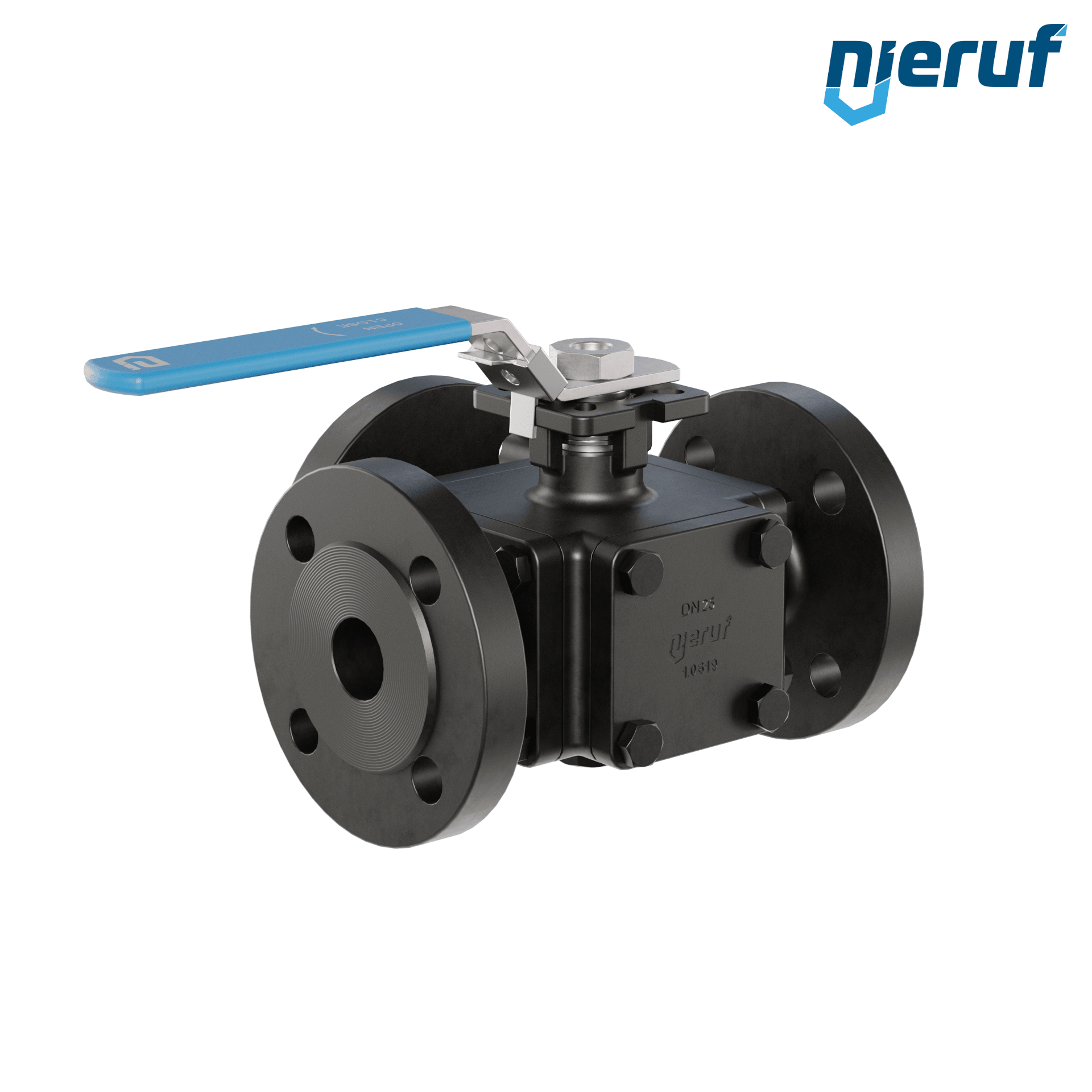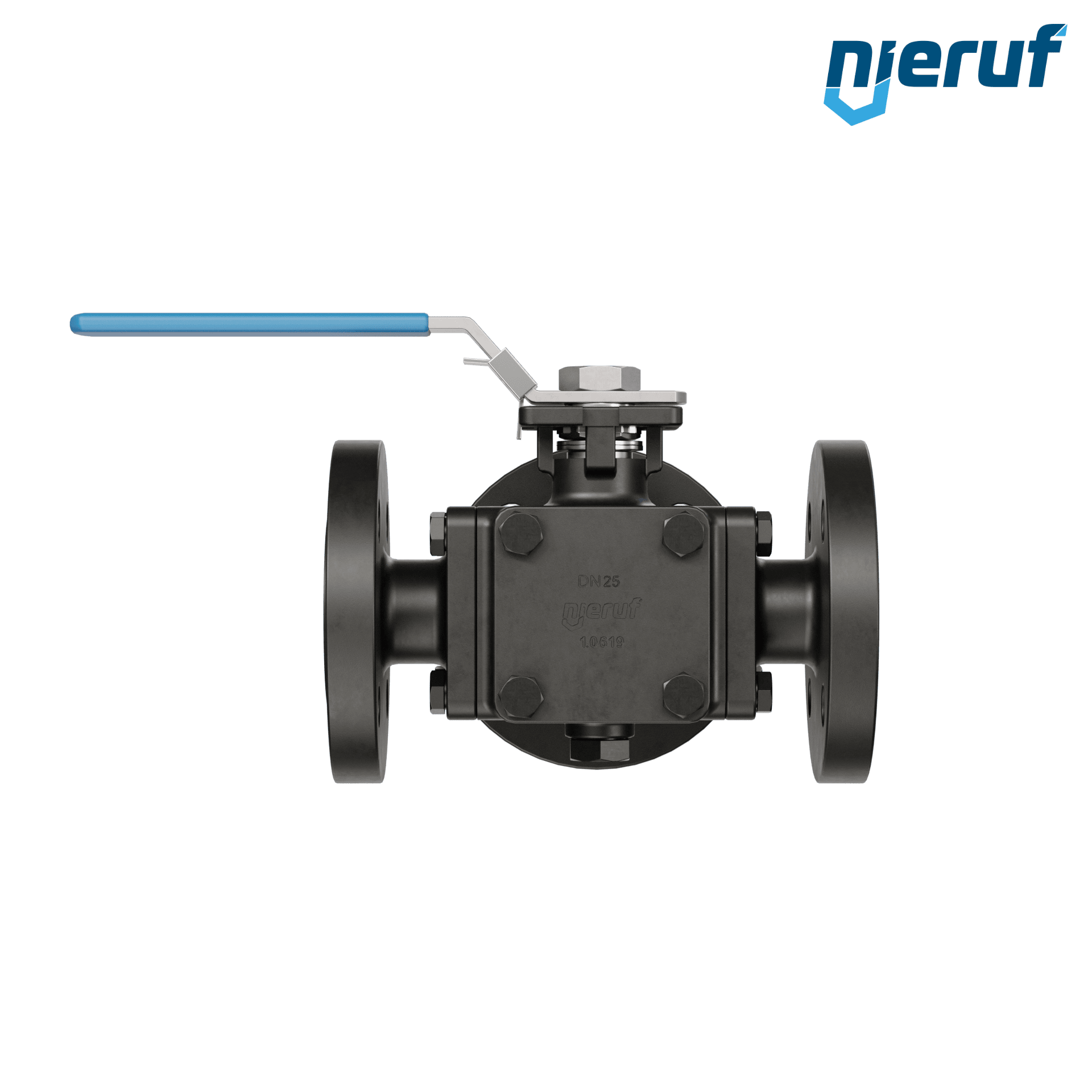 3 drożny kołnierzowy zawór kulowy DN25 PN16/40 FK08, korpus ze staliwa 1.0619, kula ze staliwa 1.4308, uszczelka TFM 1600/PTFE z otworem T