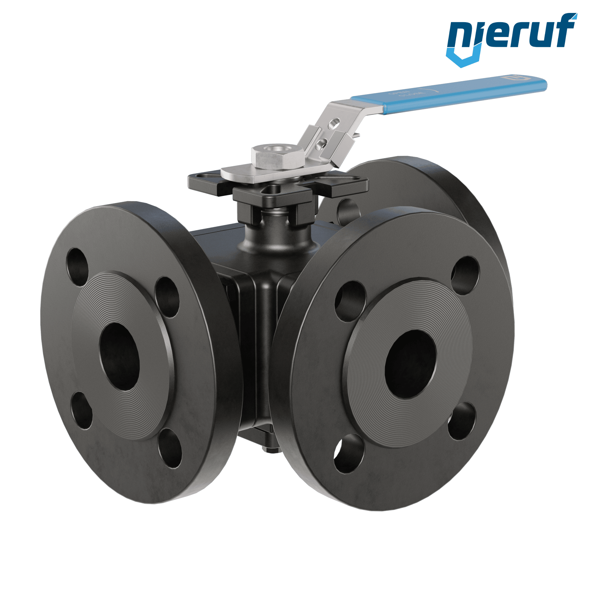 | Cechy charakterystyczne produktu | Ten wysokiej jakości 3-drożny kołnierzowy zawór kulowy wykonany z odlewu stalowego z ujemną zakładką i kołnierzem montażowym zgodnie z normą DIN ISO 5211 posiada następujące atesty: PED 97/23/EC, kategoria 3 moduł H, TA-Luft 2002. Ten zawór posiada otwór L (L=1) |