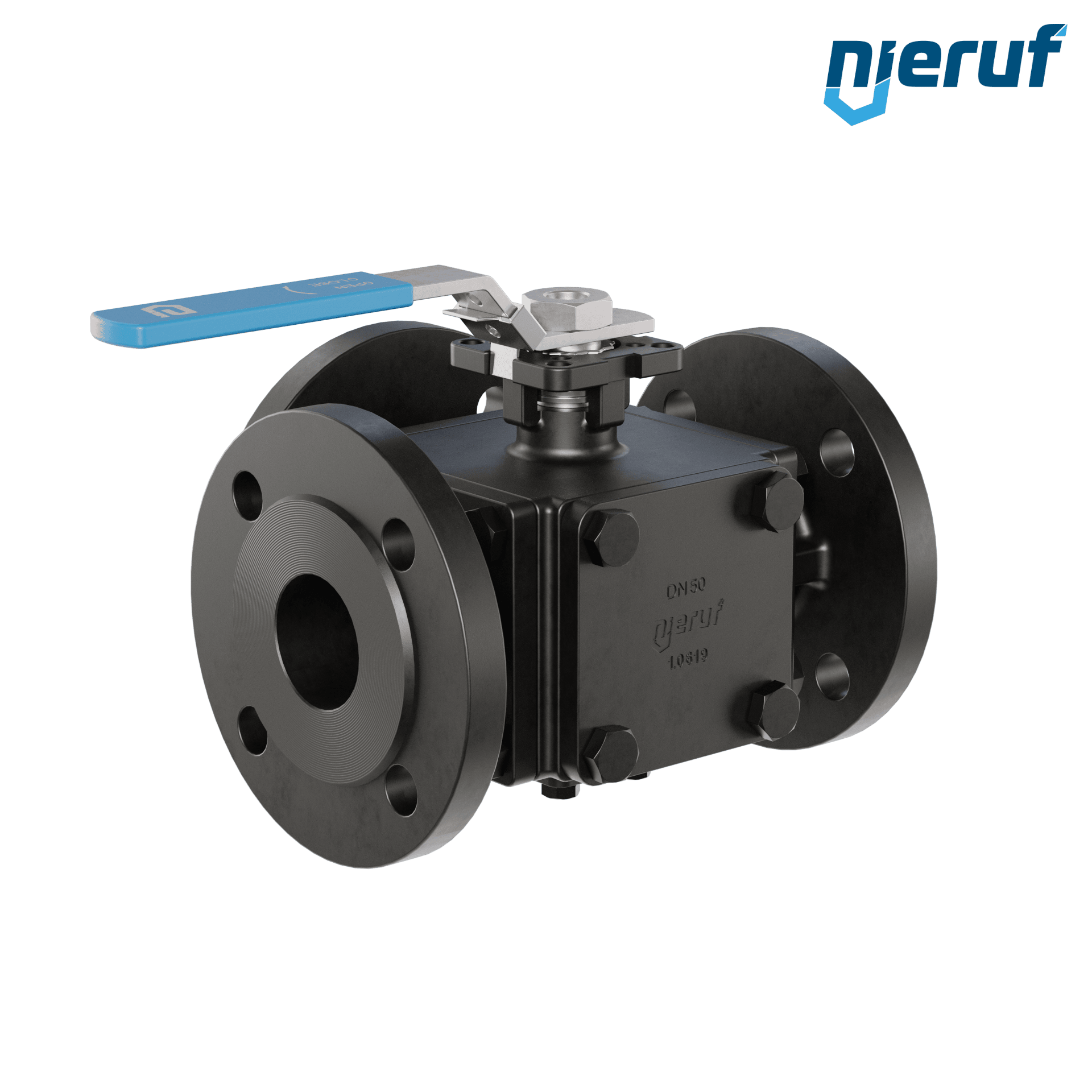 3 drożny kołnierzowy zawór kulowy DN50 PN16/40 FK08, korpus ze staliwa 1.0619, kula ze staliwa 1.4308, uszczelka TFM 1600/PTFE z otworem L