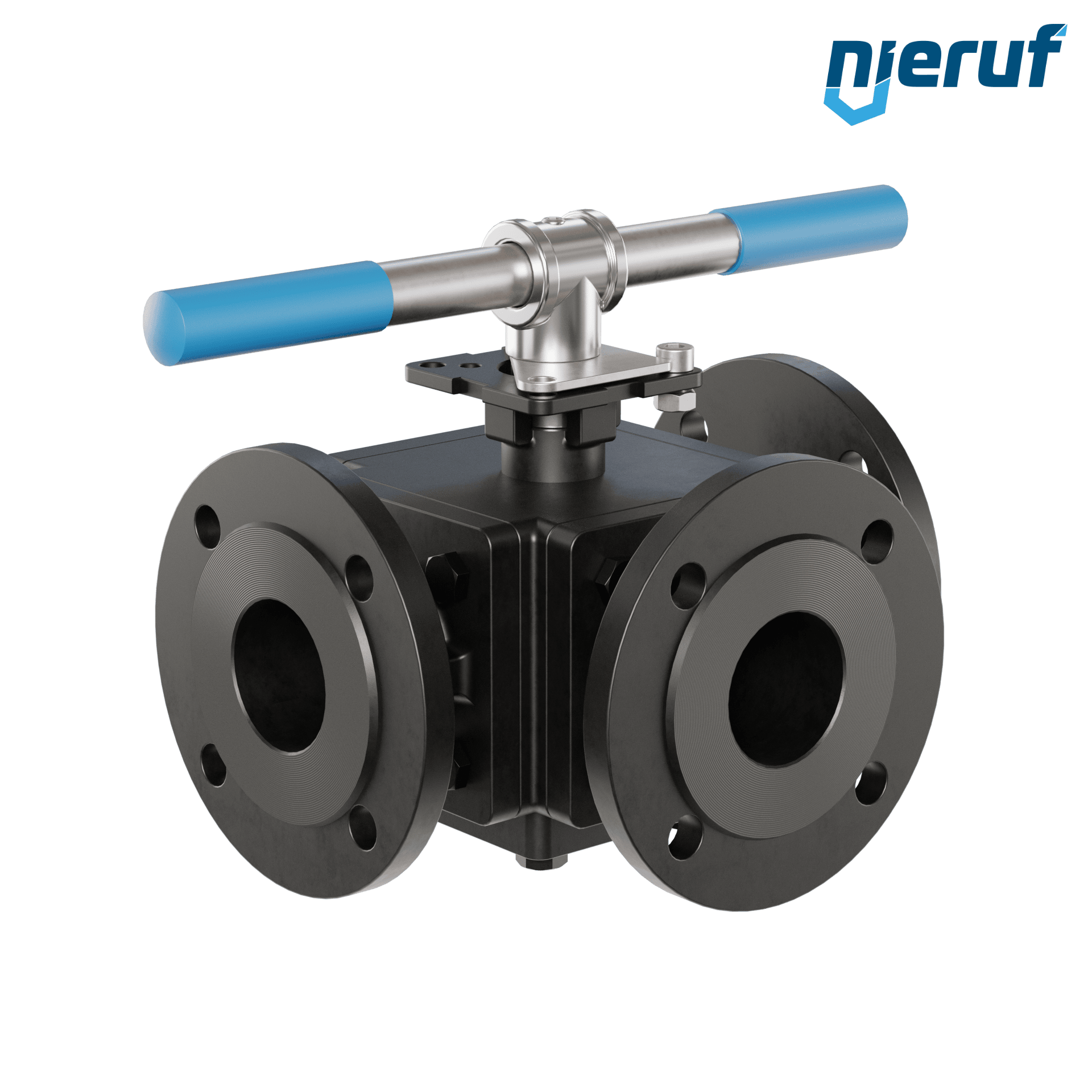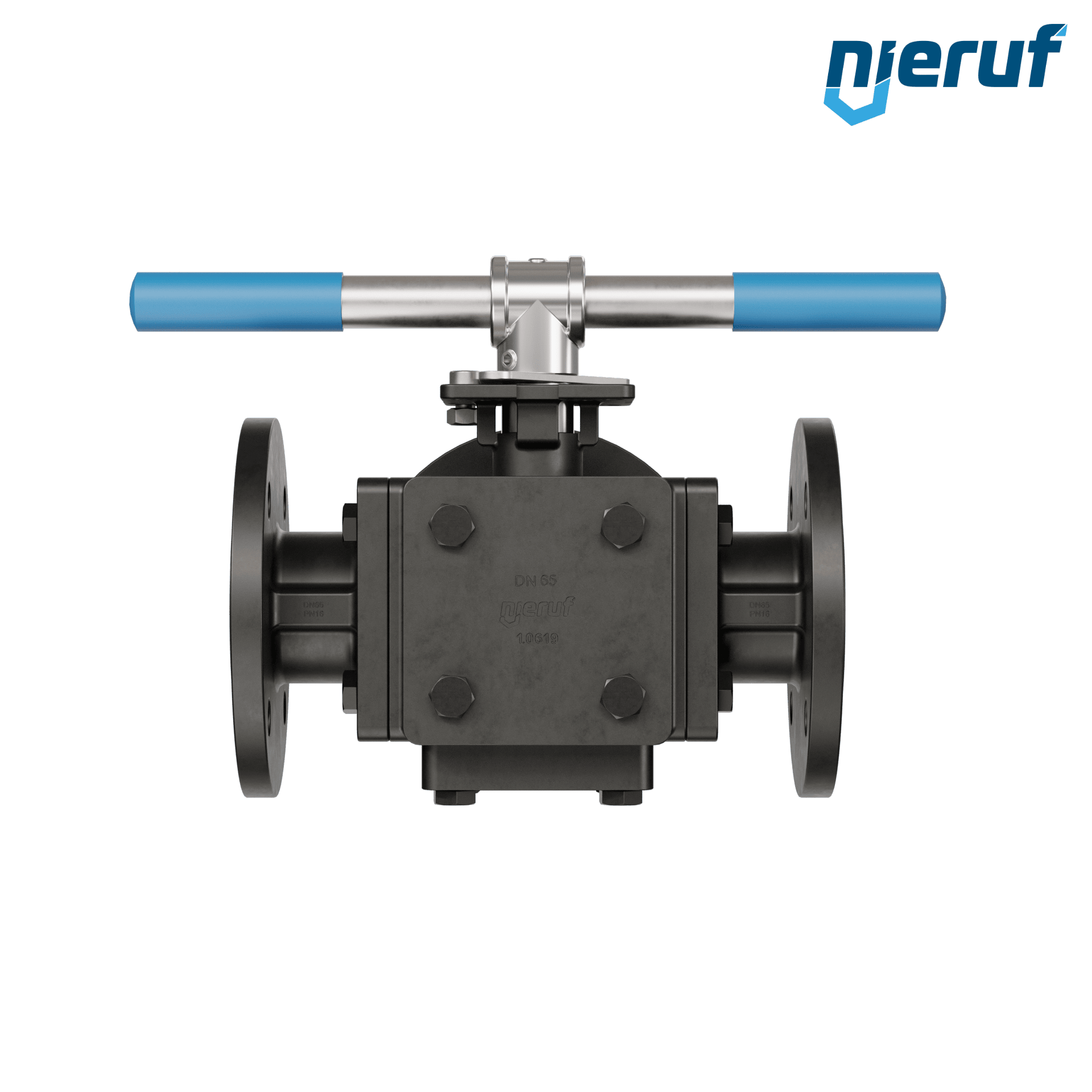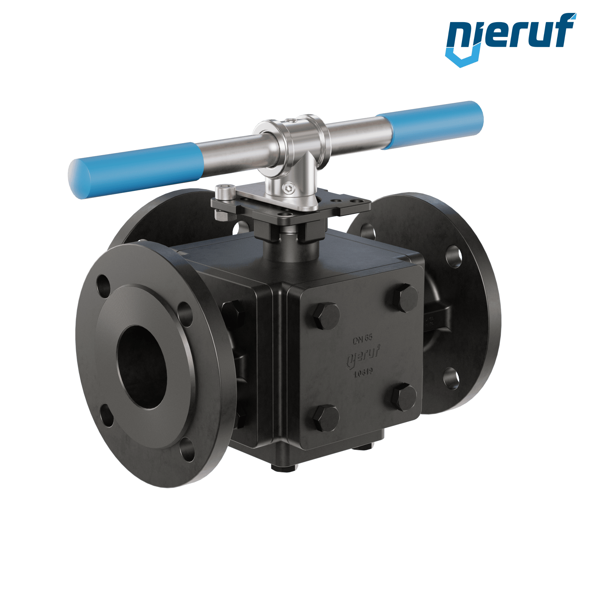 3 drożny kołnierzowy zawór kulowy DN65 PN16 FK08, korpus ze staliwa 1.0619, kula ze staliwa 1.4308, uszczelka TFM 1600/PTFE z otworem T