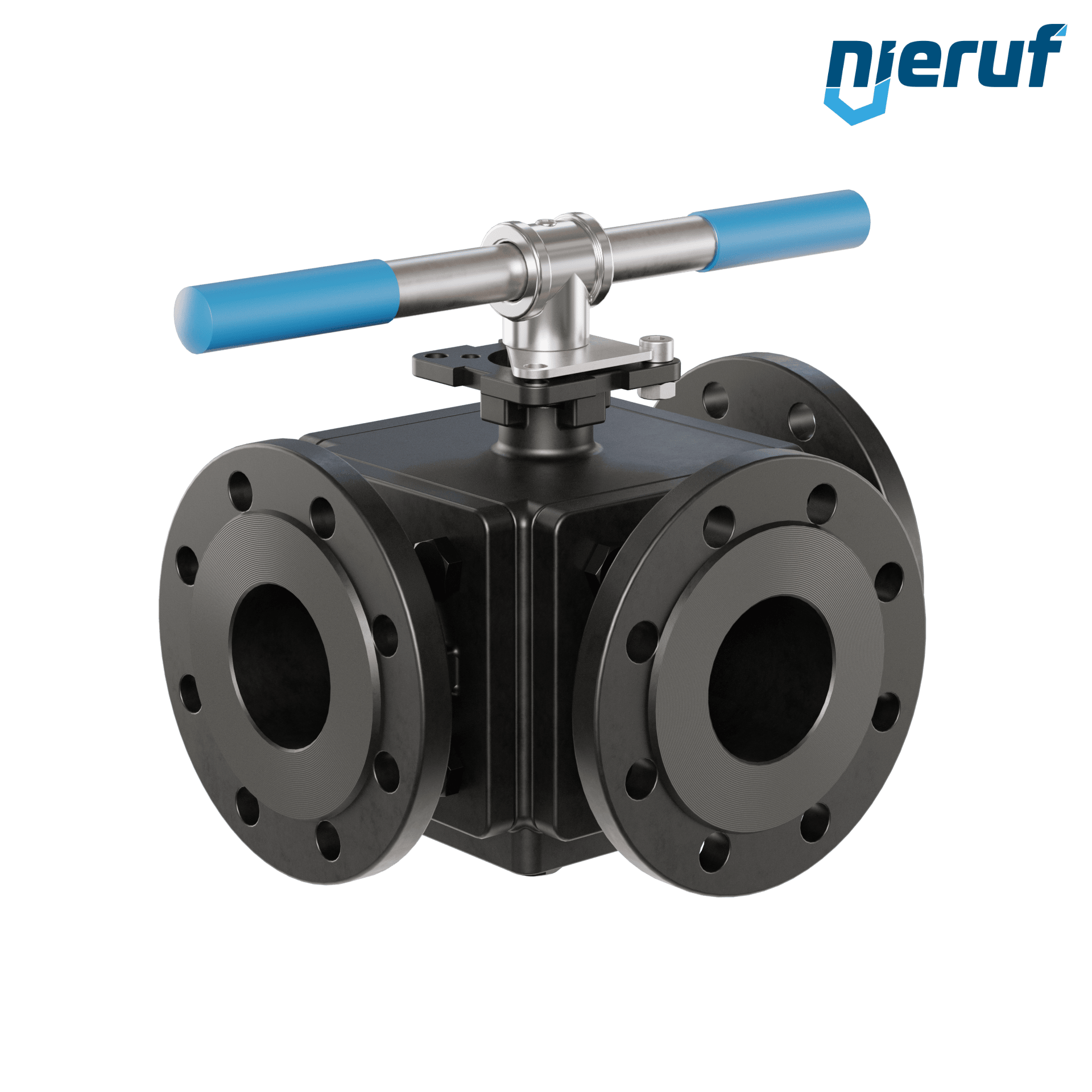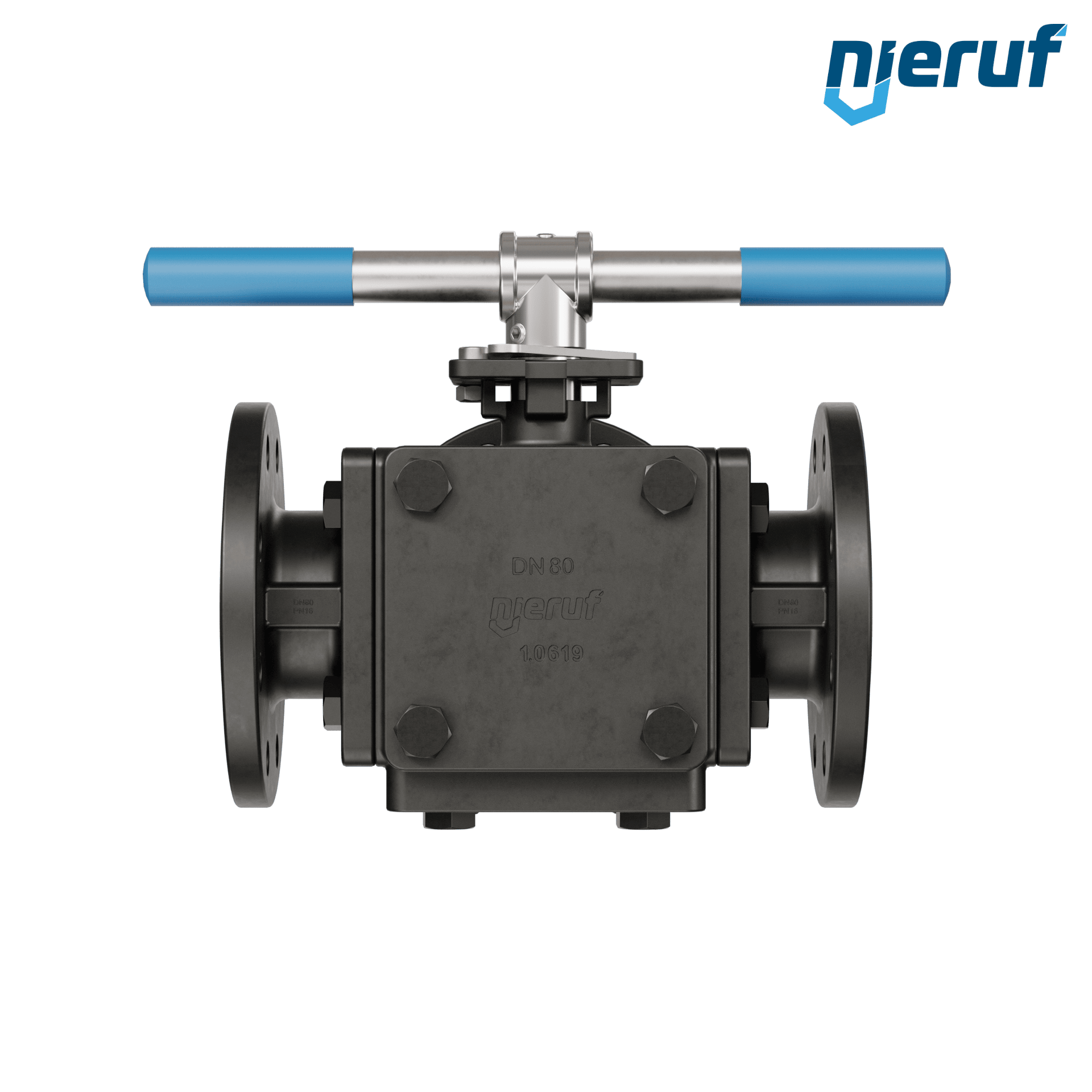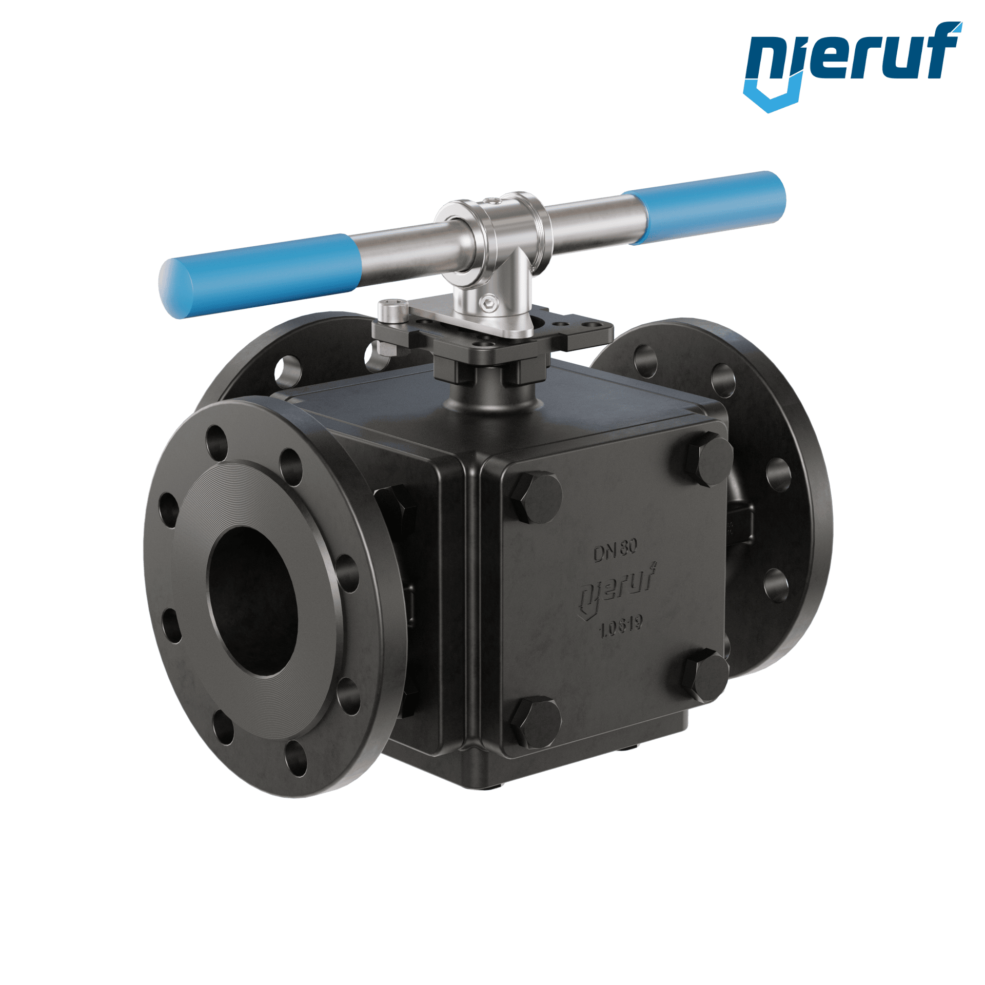 3 drożny kołnierzowy zawór kulowy DN80 PN16 FK08, korpus ze staliwa 1.0619, kula ze staliwa 1.4308, uszczelka TFM 1600/PTFE z otworem L