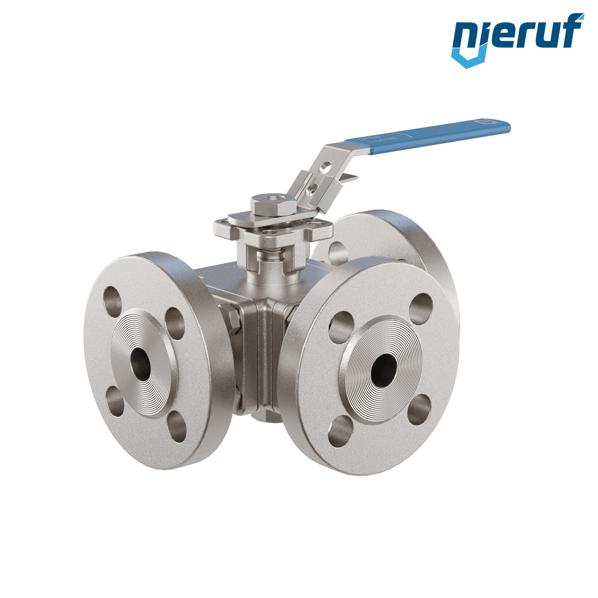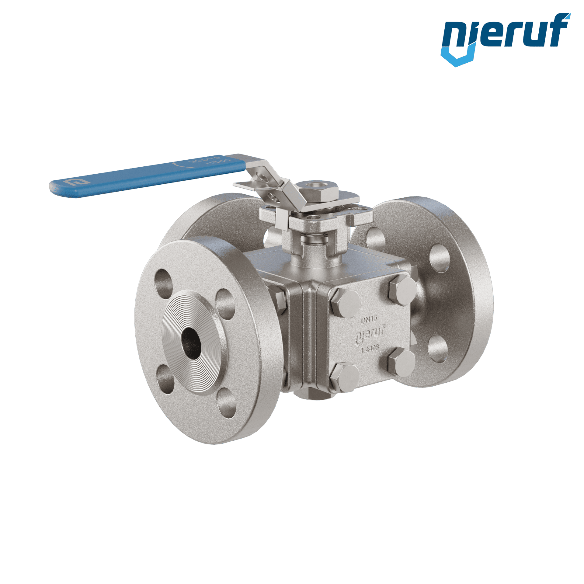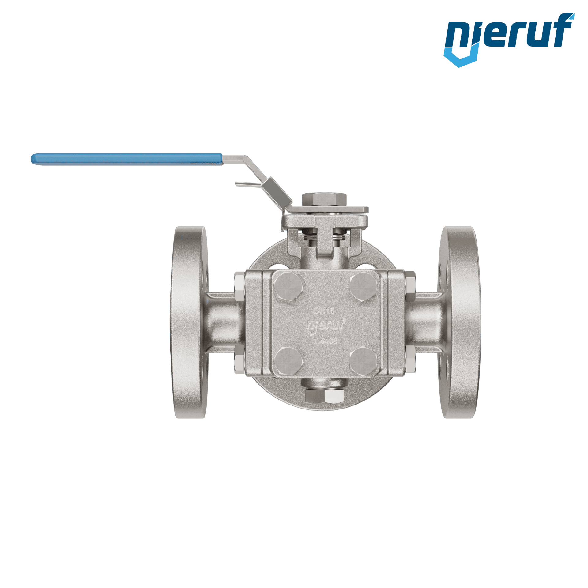 3 drożny kołnierzowy zawór kulowy DN15 PN16/40 FK09, korpus i kula ze stali nierdzewnej 1.4408, uszczelka TFM 1600/PTFE z otworem T