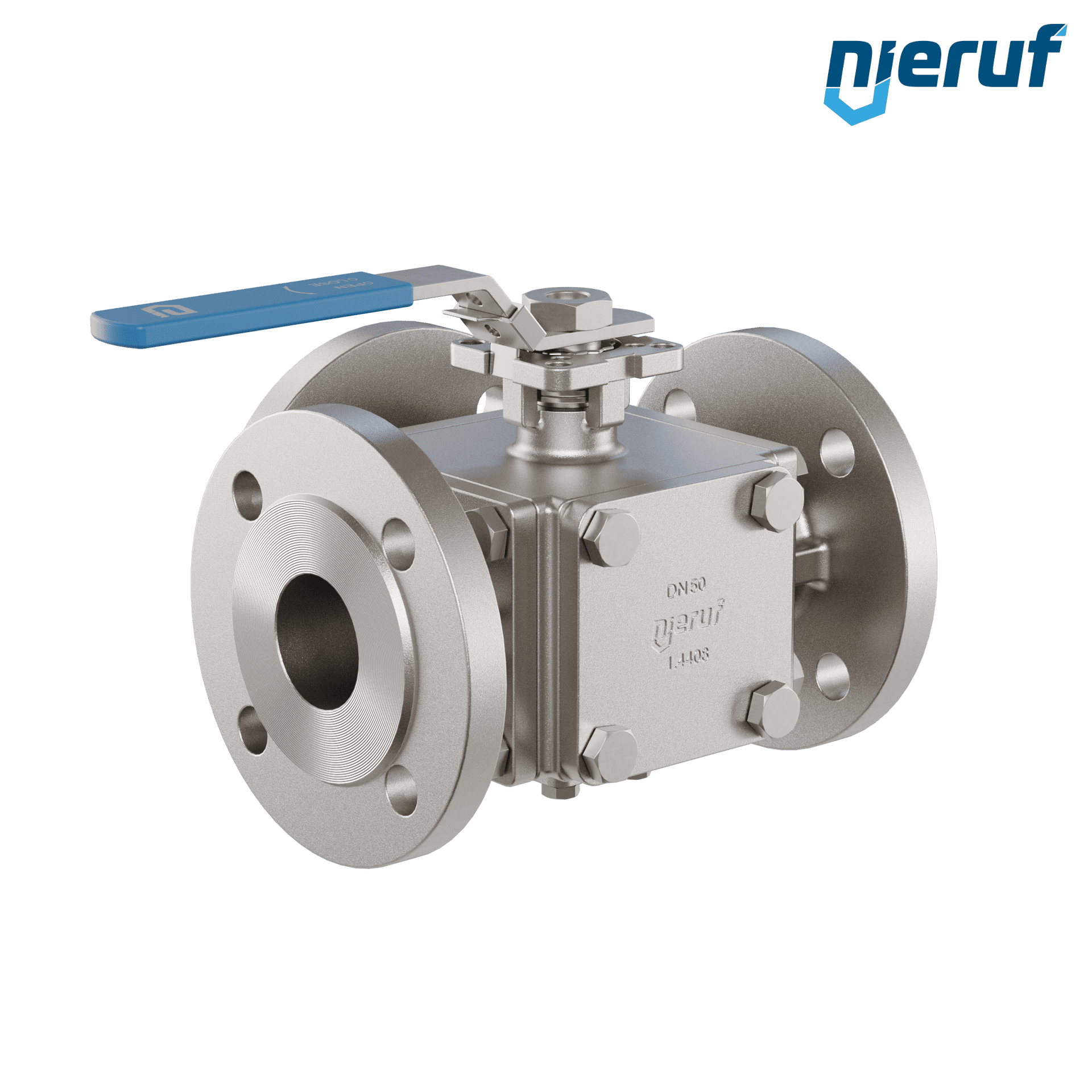 3 drożny kołnierzowy zawór kulowy DN50 PN16/40 FK09, korpus i kula ze stali nierdzewnej 1.4408, uszczelka TFM 1600/PTFE z otworem T