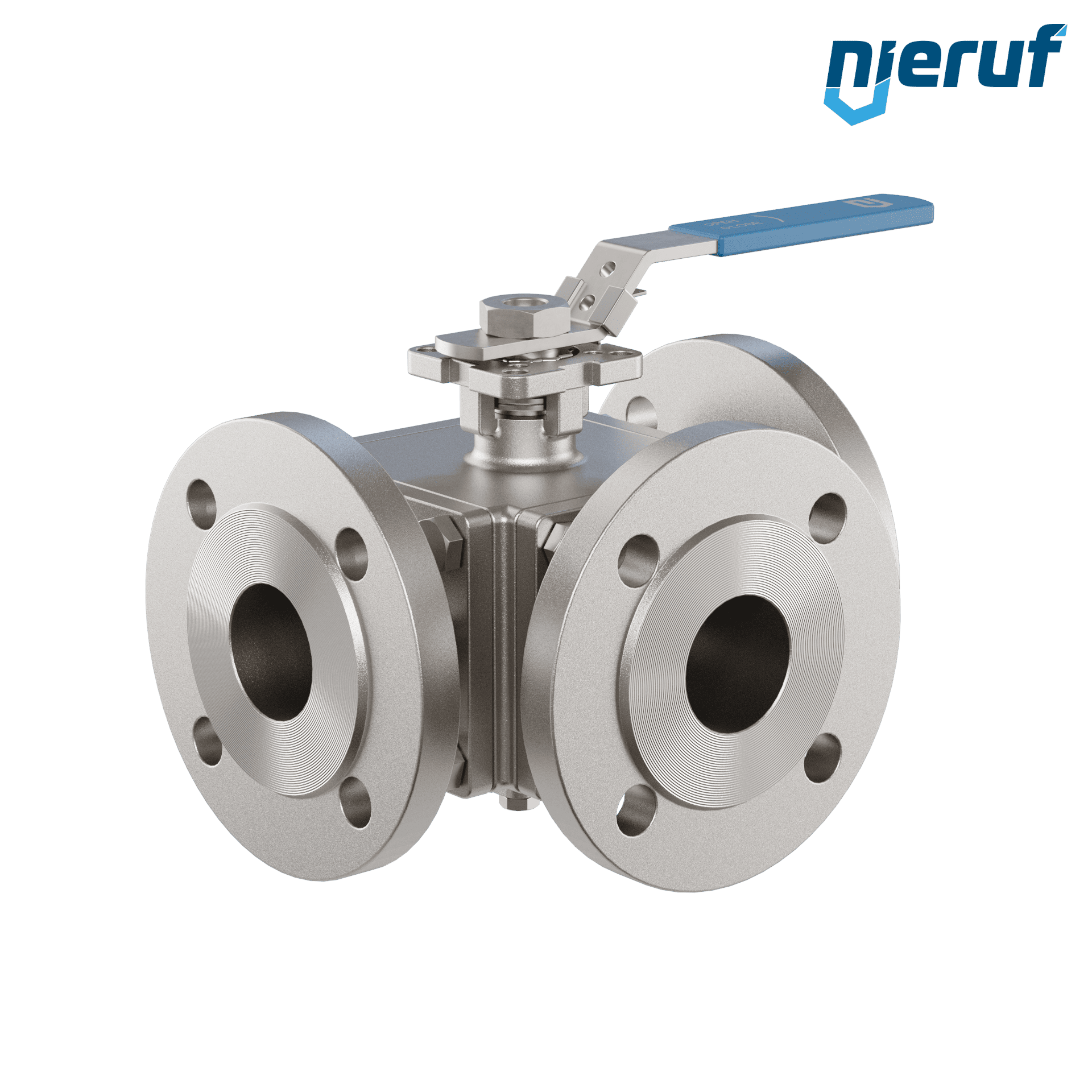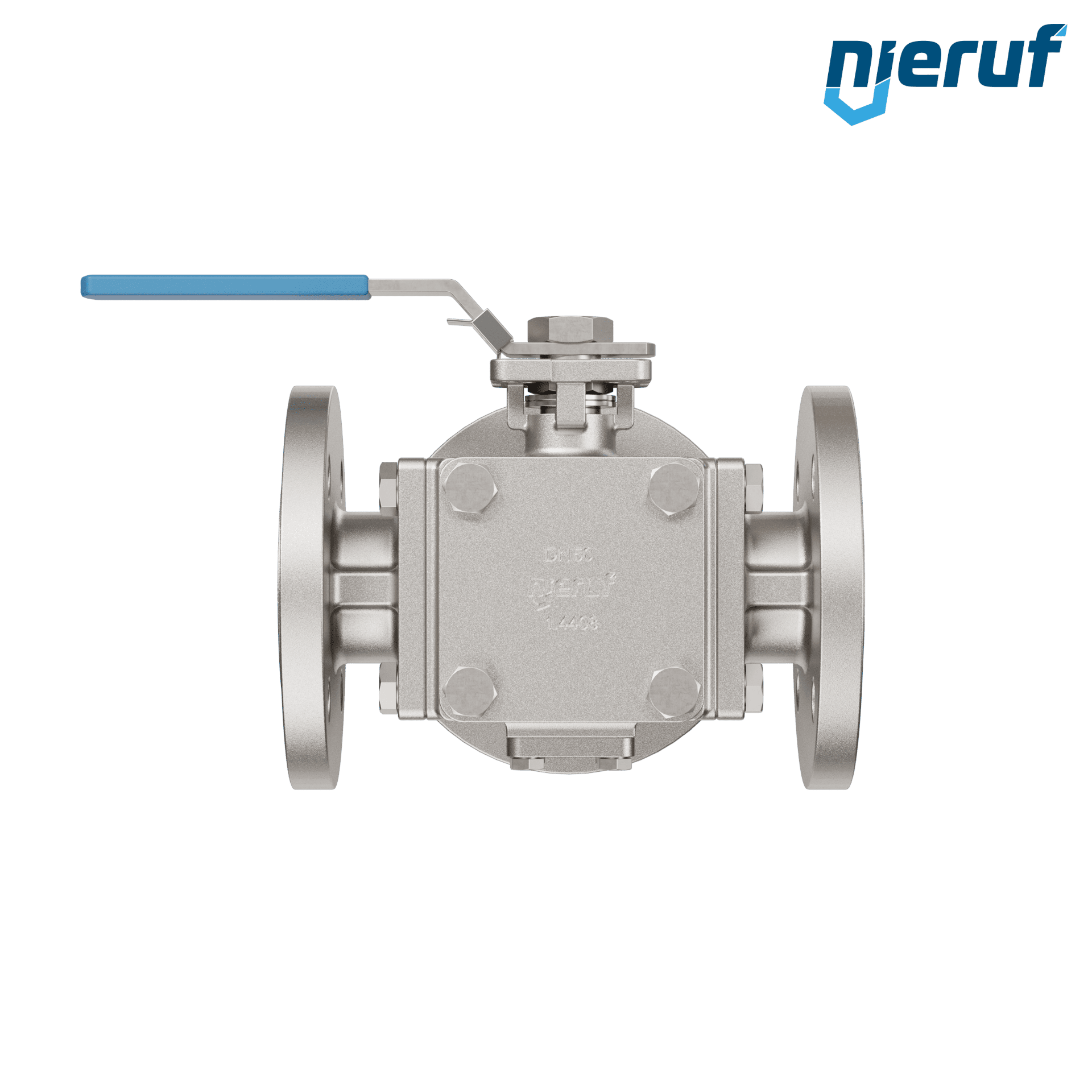 | Cechy charakterystyczne produktu | Ten wysokiej jakości 3-drożny zawór kulowy kołnierzowy wykonany ze stali nierdzewnej z ujemną zakładką i kołnierzem montażowym zgodnie z normą DIN ISO 5211 posiada następujące atesty: PED 97/23/EG, kategoria 3 moduł H, TA-Luft 2002. Ten zawór kulowy posiada otwór T (T=3) |