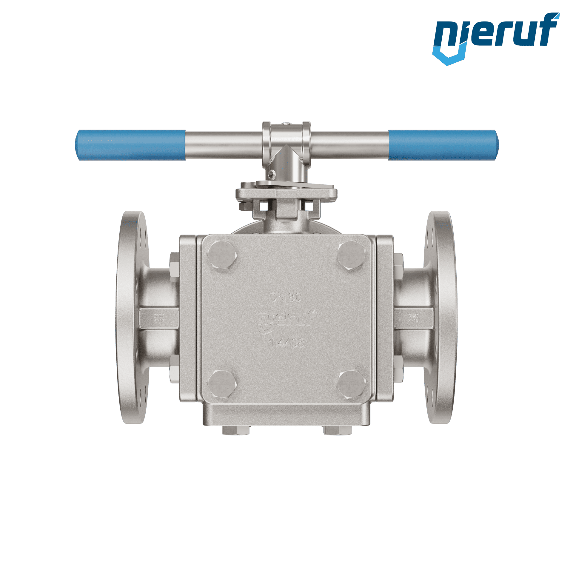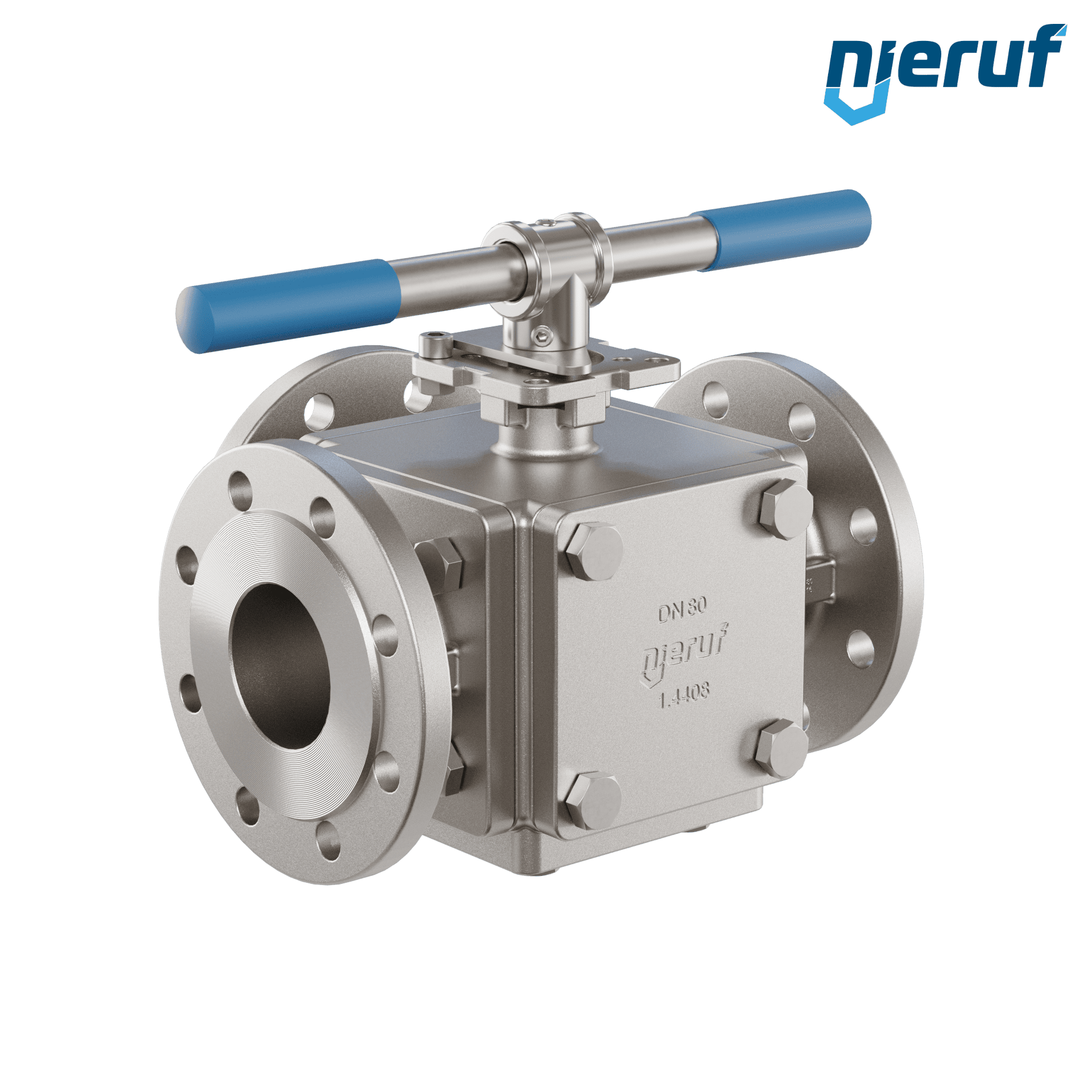 3 drożny kołnierzowy zawór kulowy DN80 PN16 FK09, korpus i kula ze stali nierdzewnej 1.4408, uszczelka TFM 1600/PTFE z otworem T