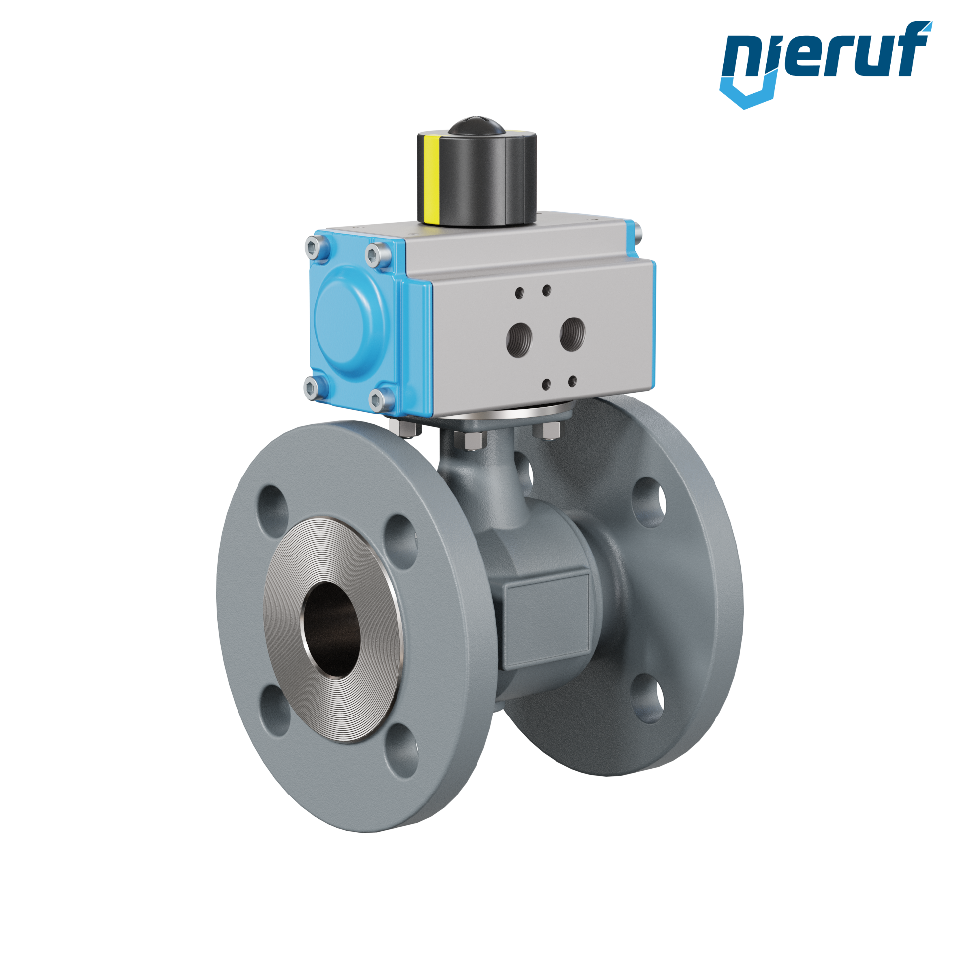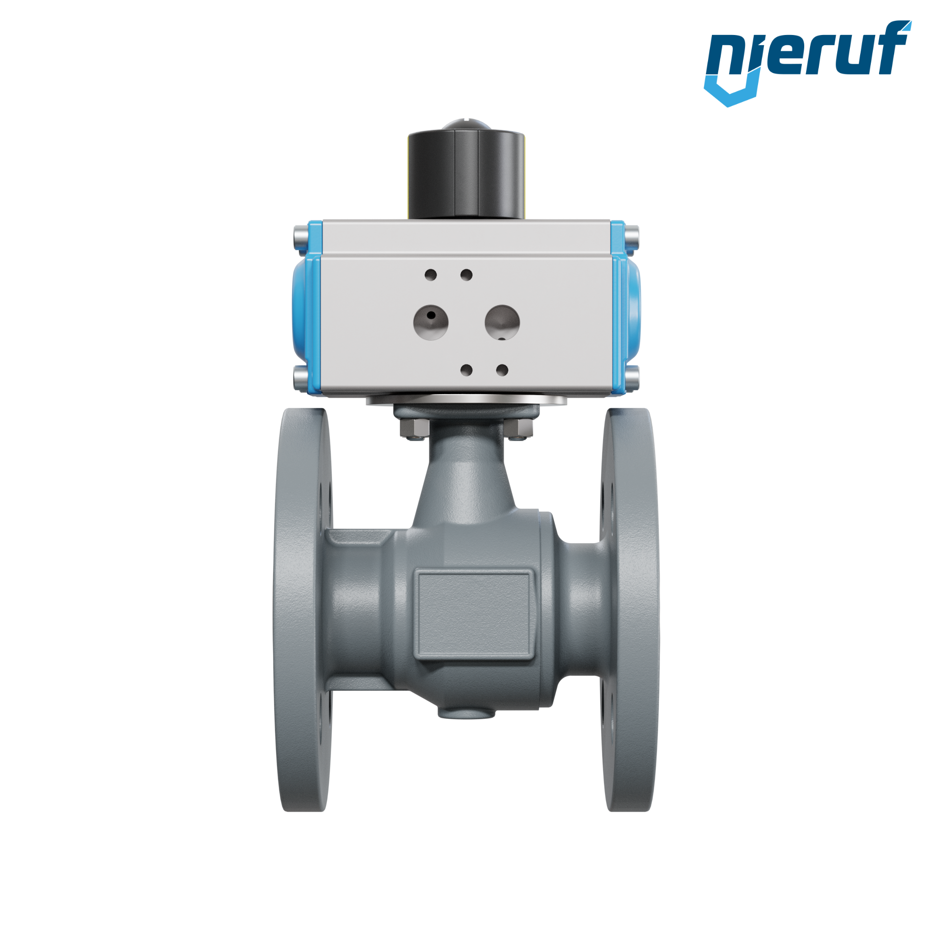 | Cechy charakterystyczne produktu | W przypadku tego wysokiej jakości automatycznego kołnierzowego zaworu kulowego wykonanego z żeliwa sferoidalnego z pneumatycznym siłownikiem obrotowym (GD = dwustronnego działania) możliwy jest bezpośredni montaż kołnierzowy zaworów elektromagnetycznych zgodnie ze standardami Namur. Medium sterującym dla siłownika pneumatycznego jest przefiltrowane sprężone powietrze. |