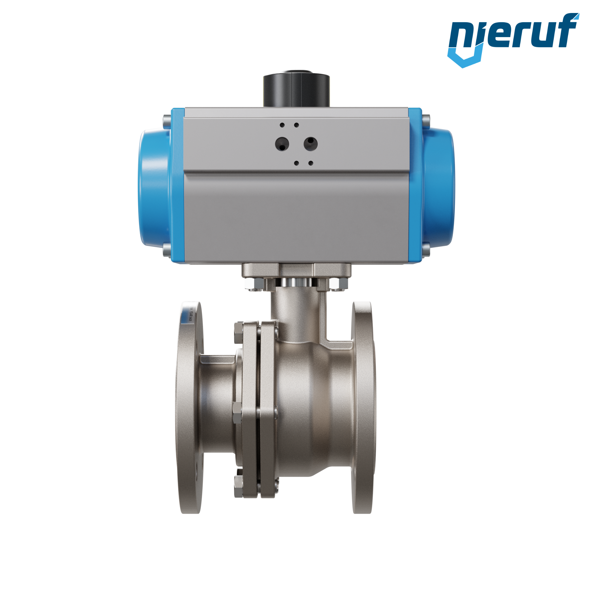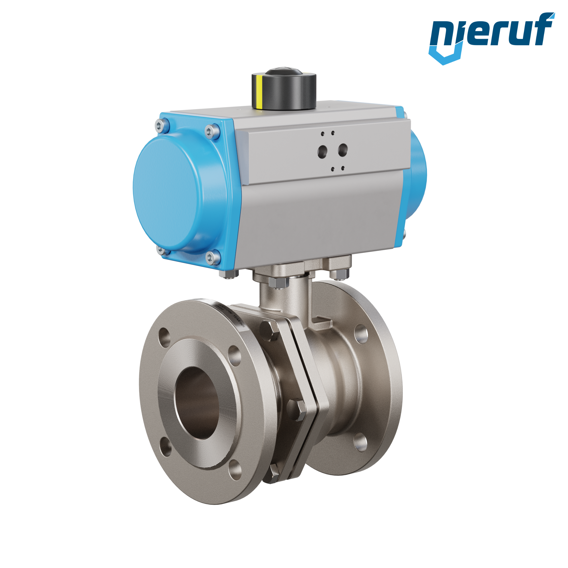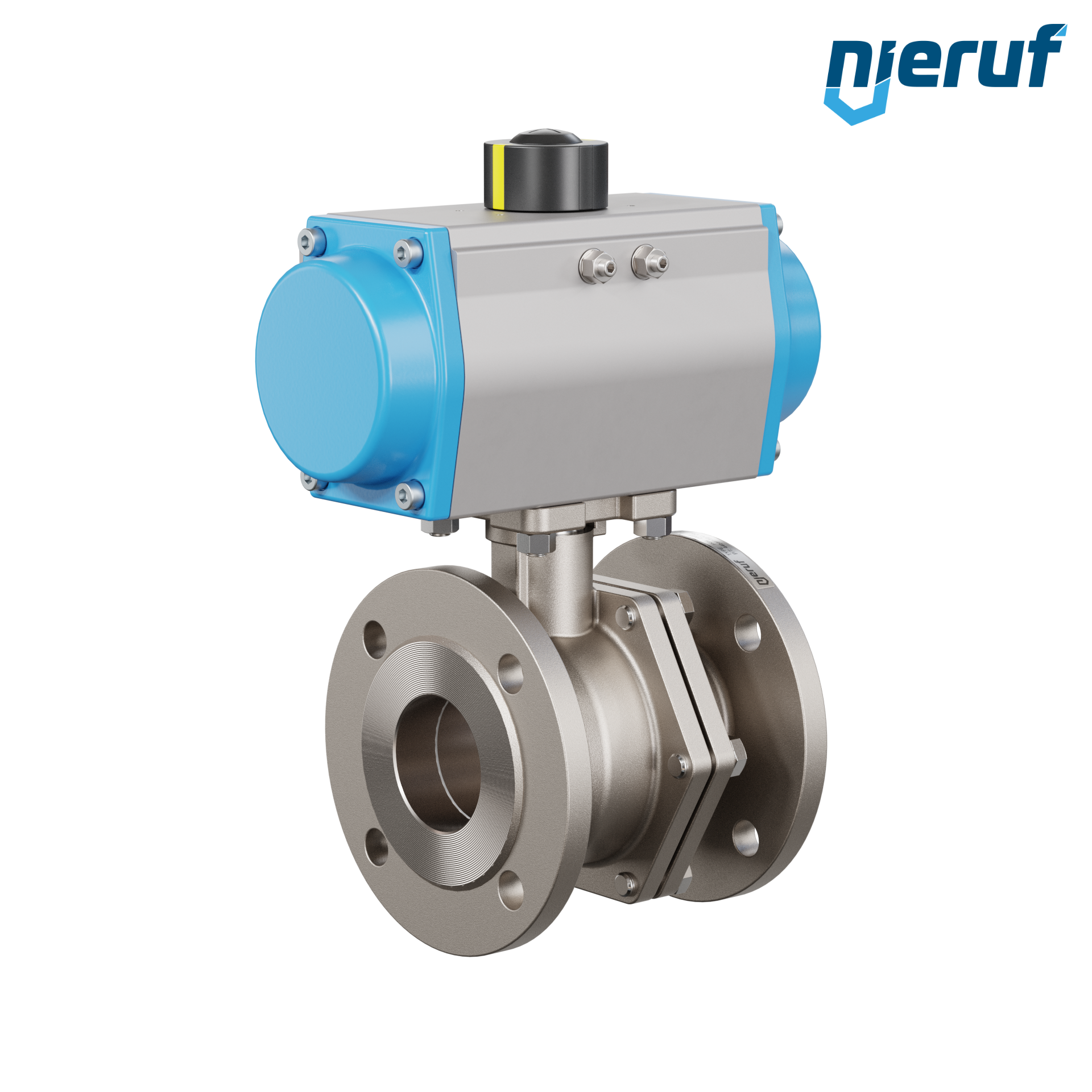 Ten wysokiej jakości automatyczny zawór kulowy kołnierzowy ze stali nierdzewnej z pneumatycznym siłownikiem obrotowym (GD = dwustronnego działania) nie wymaga mostka ani sterownika. Siłownik jest montowany bezpośrednio na zaworze kulowym.