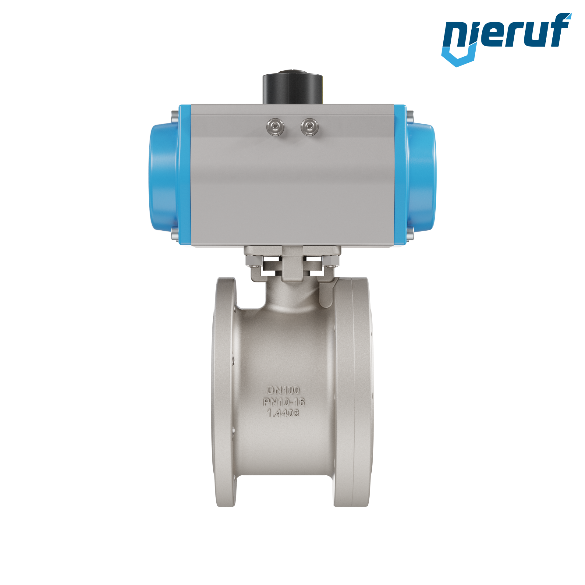 Kompaktowy zawór kulowy kołnierzowy DN100 stal nierdzewna 1.4408 PK07 pneumatyczny siłownik obrotowy GD110 wykonany z aluminium (funkcja: GD = dwustronnego działania)