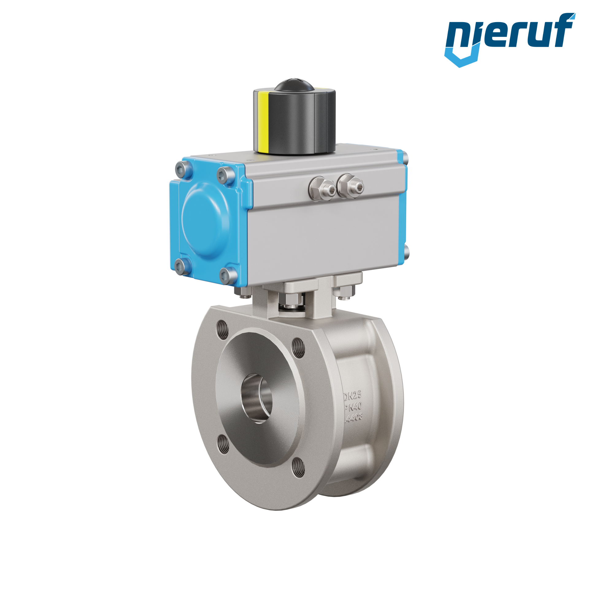 Kompaktowy zawór kulowy kołnierzowy DN25 stal nierdzewna 1.4408 PK07 pneumatyczny siłownik obrotowy GD48 wykonany z aluminium (funkcja: GD = dwustronnego działania)