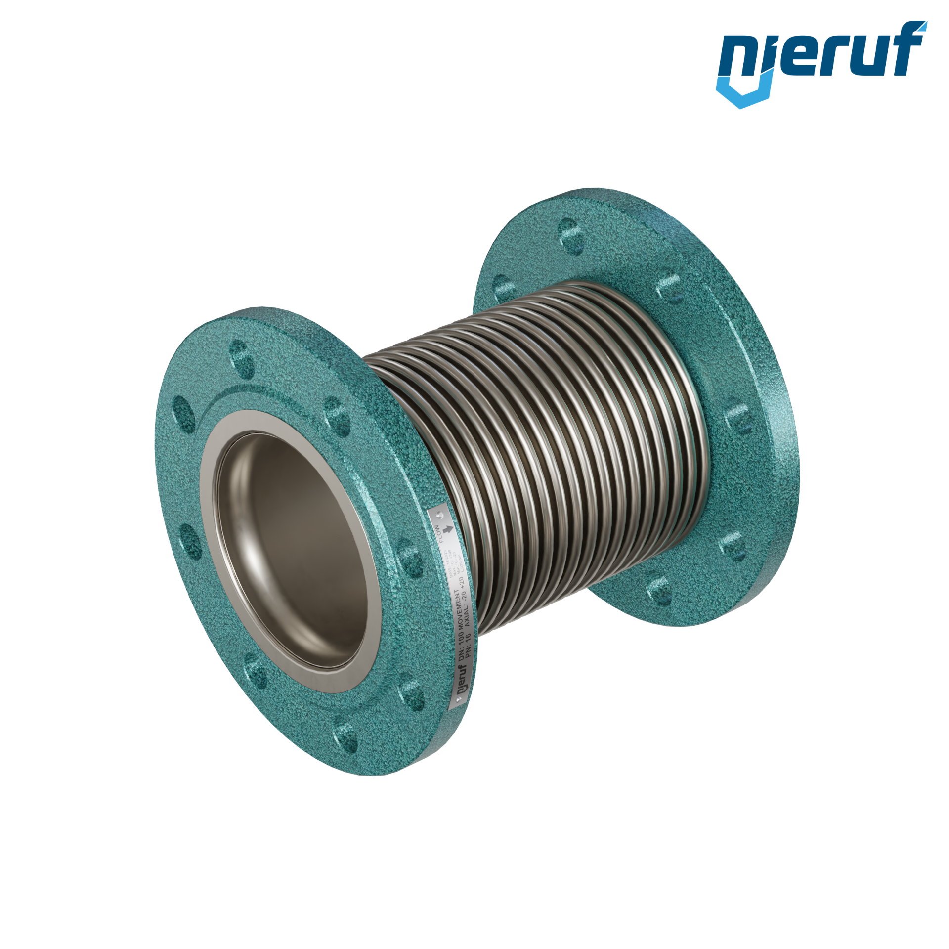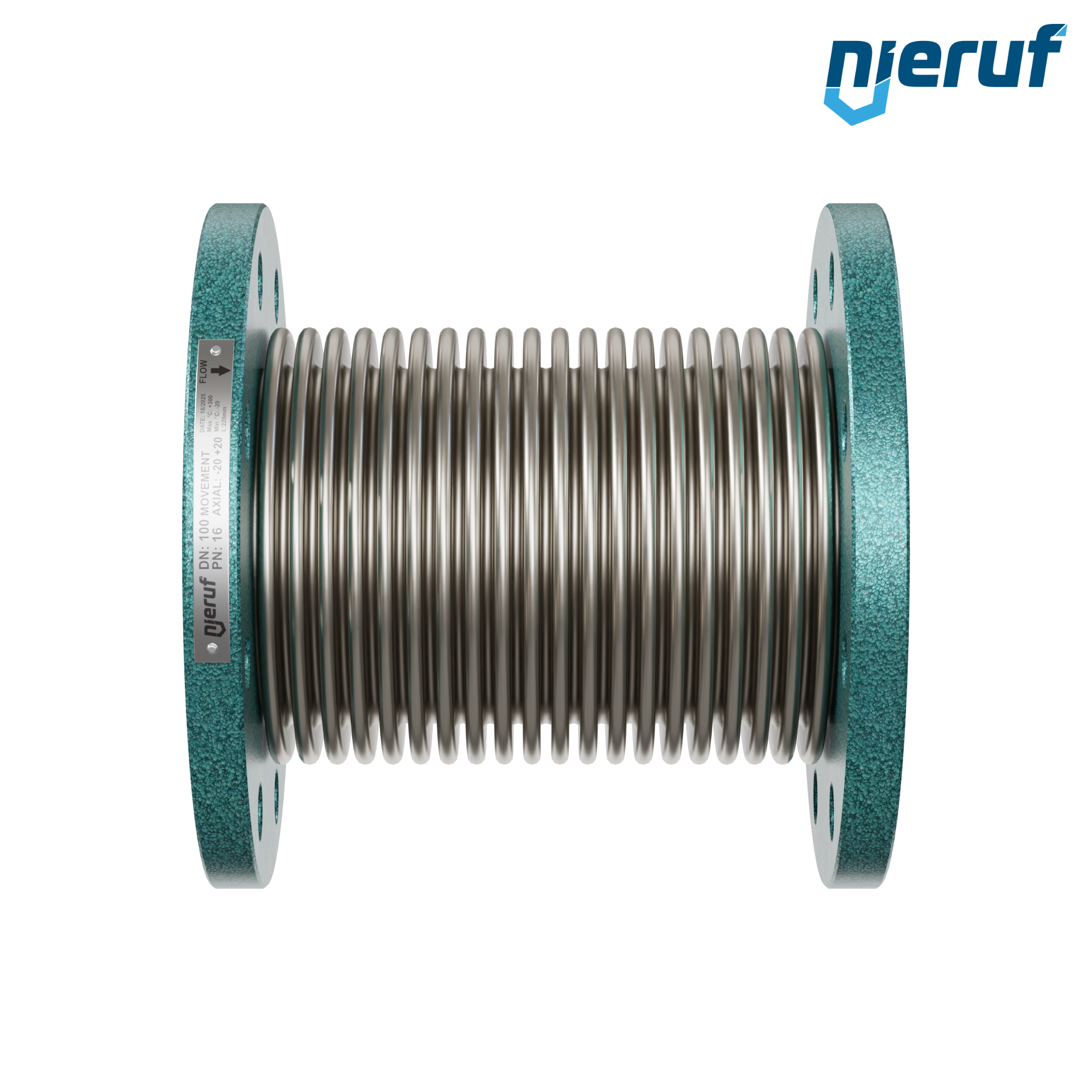 | Cechy charakterystyczne produktu | Kompensator osiowy z mieszkiem ze stali nierdzewnej i stalowymi kołnierzami do użytku w wysokich temperaturach i trudnych warunkach. |