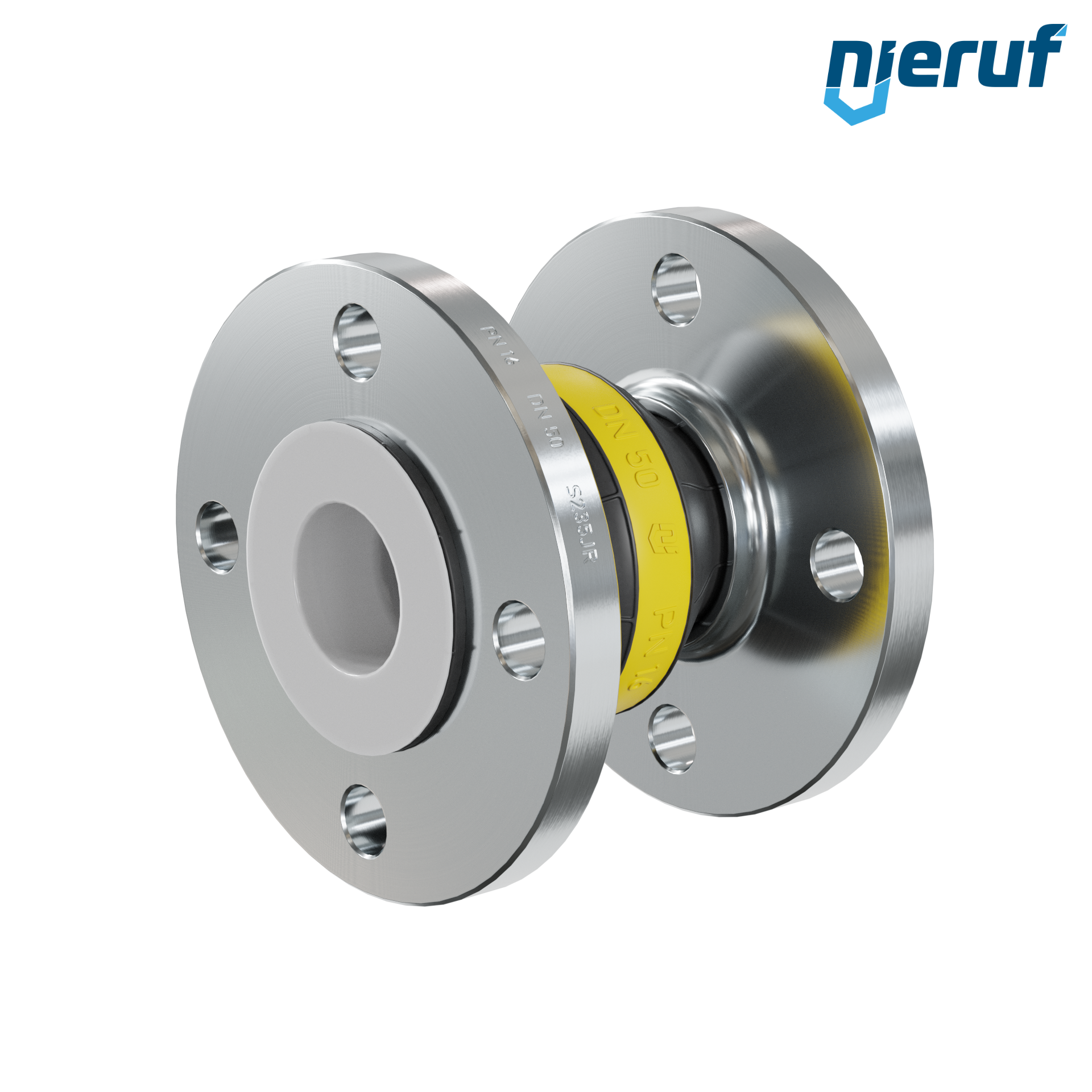 | Cechy charakterystyczne produktu | Ten wysokiej jakości kompensator gumowy z uszczelką NBR i stalowymi kołnierzami posiada dopuszczenie FDA. Ponadto ten kompensator jest wyposażony w wykładzinę PTFE, dzięki czemu ma wysoką odporność chemiczną ze względu na gładką powierzchnię wewnętrzną. |