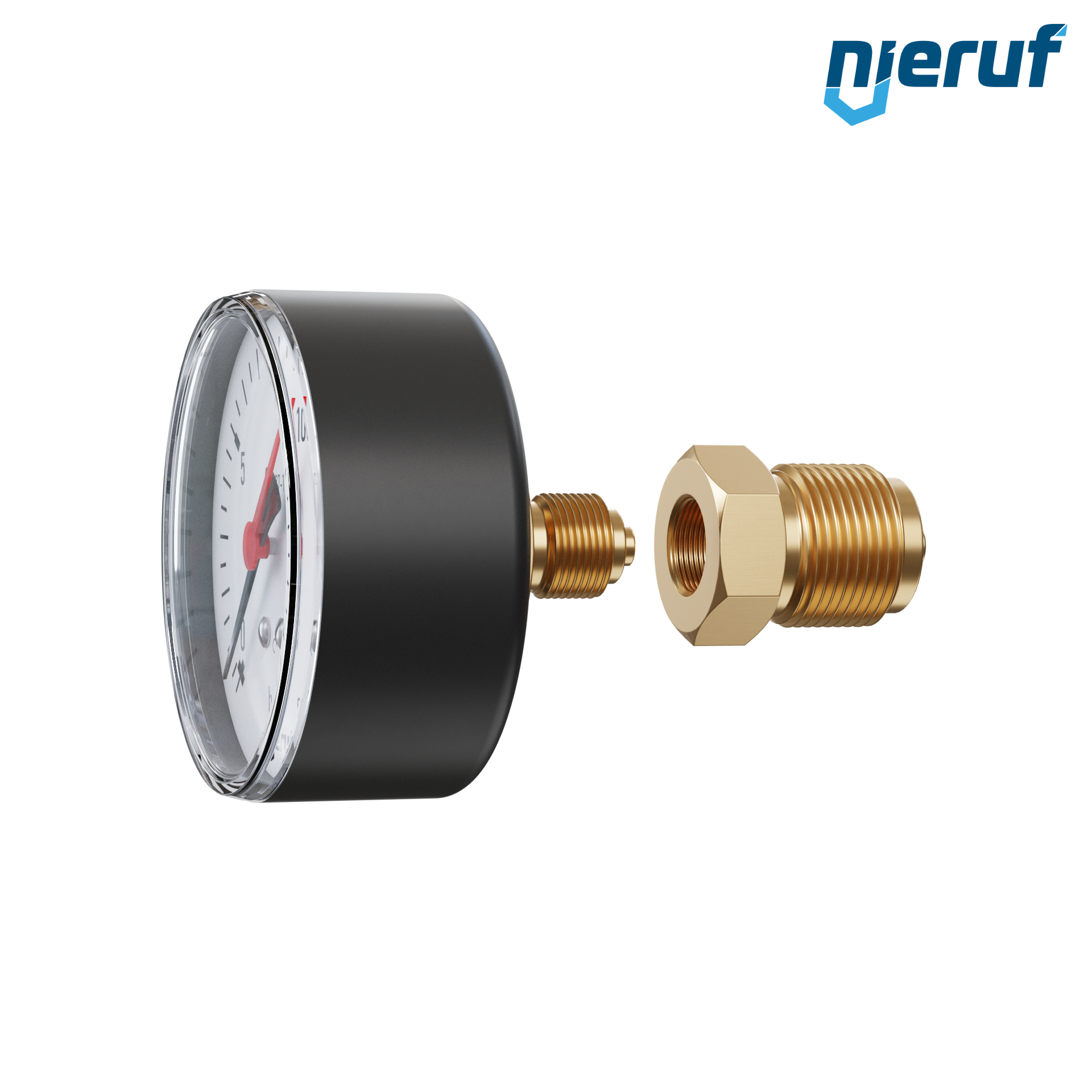 Zakres dostawy obejmuje manometr osiowy z 1/4" cala i element przejściowy z 1/4" cala na 1/2" cala.