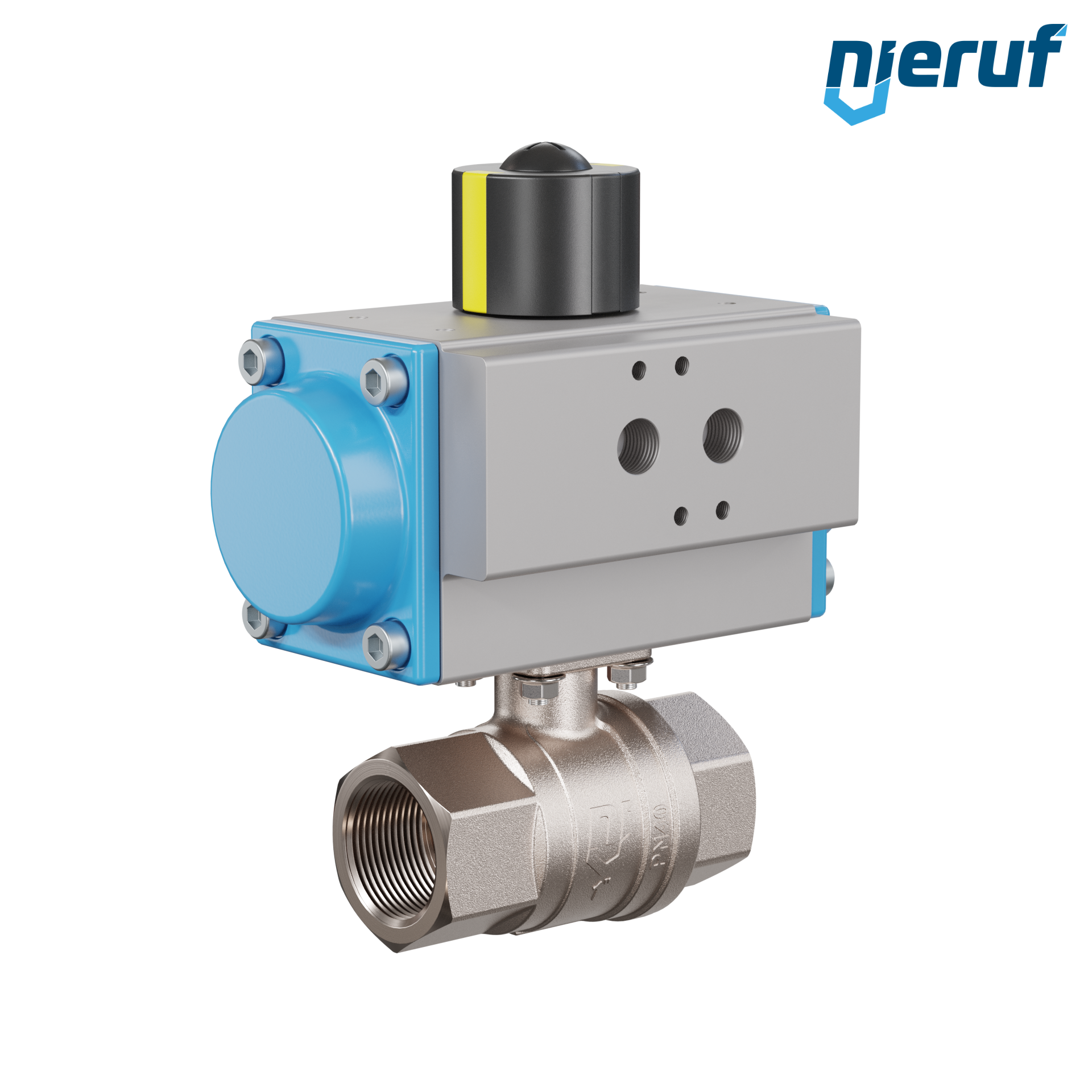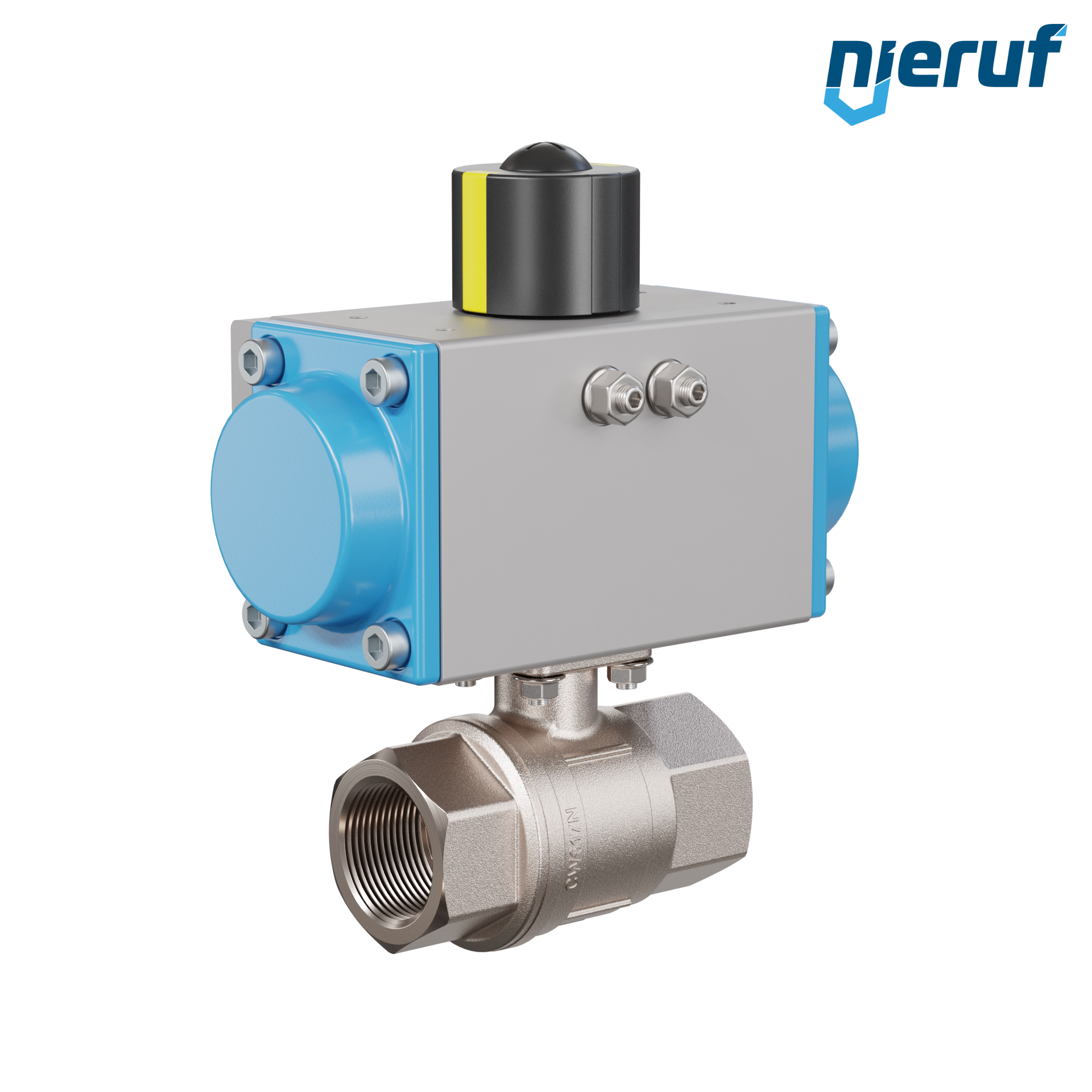 Ten wysokiej jakości automatyczny zawór kulowy mufowy z mosiądzu z pneumatycznym siłownikiem obrotowym (GS = jednostronnego działania) nie wymaga mostka ani sterownika. Medium sterującym dla siłownika pneumatycznego jest przefiltrowane sprężone powietrze.