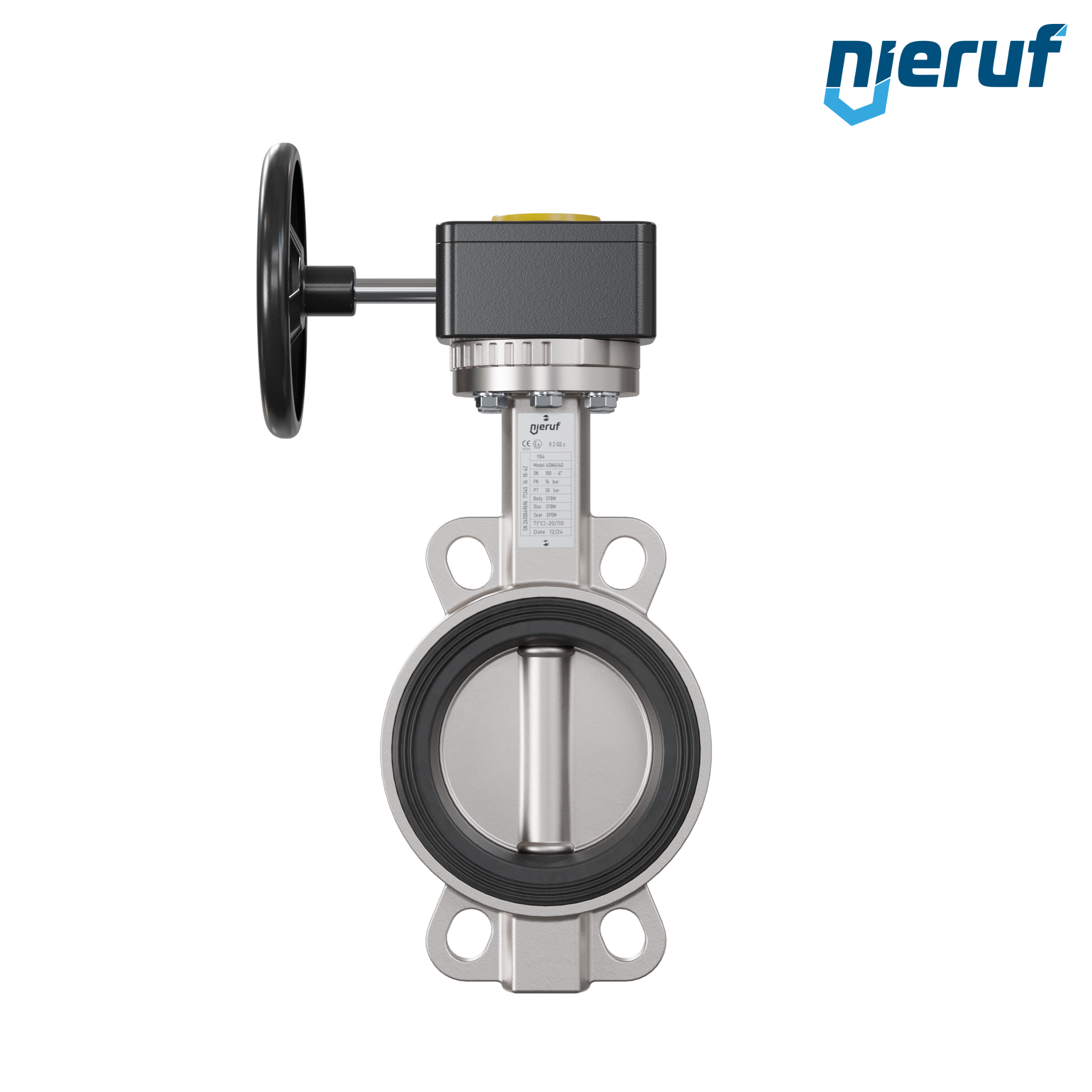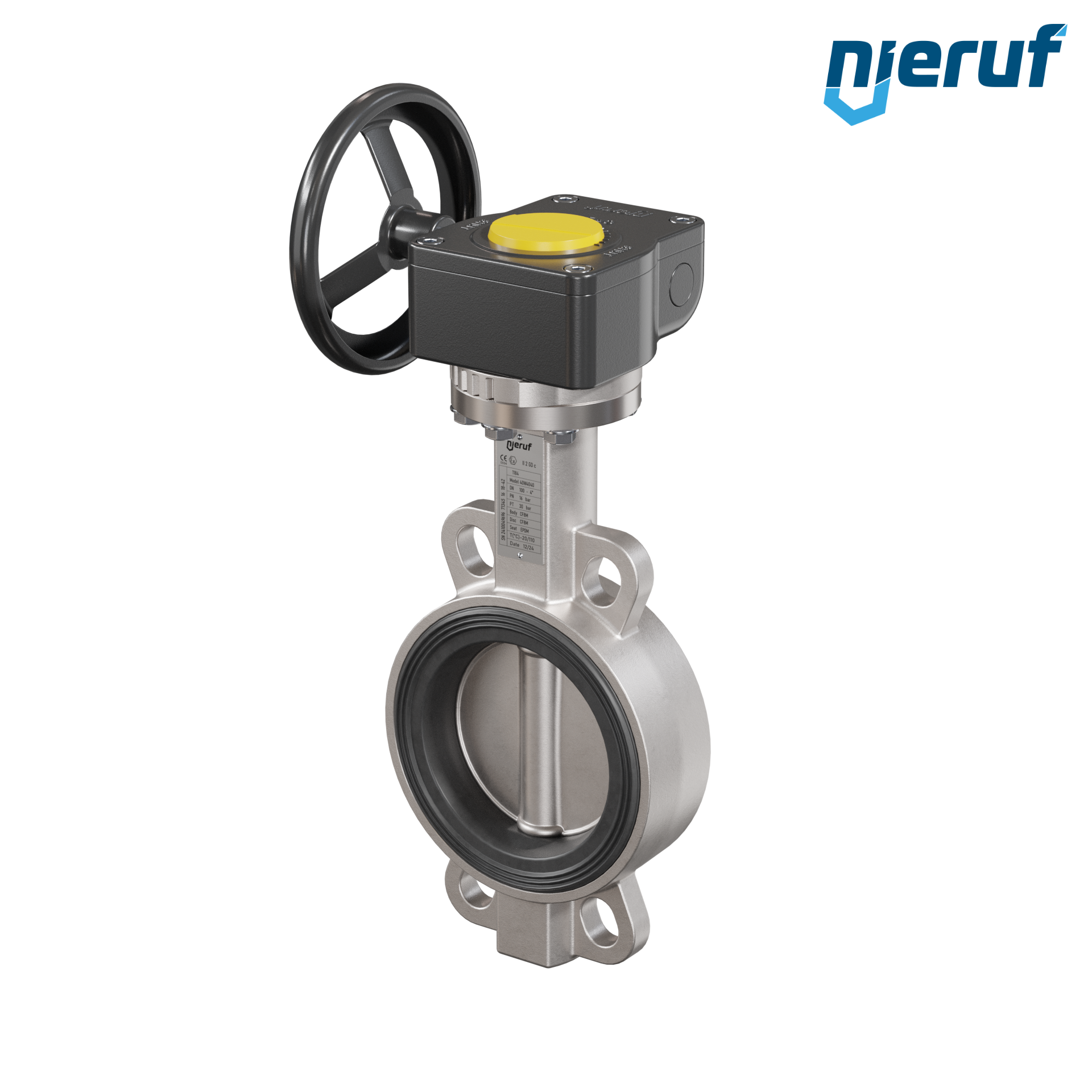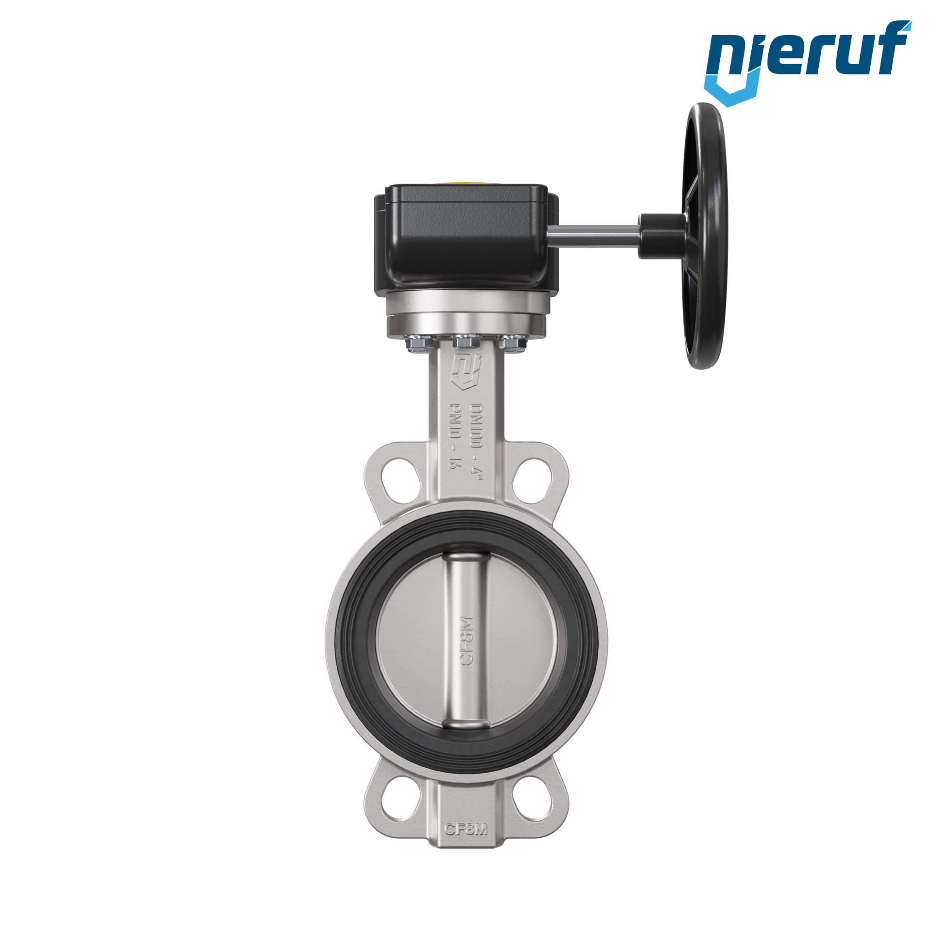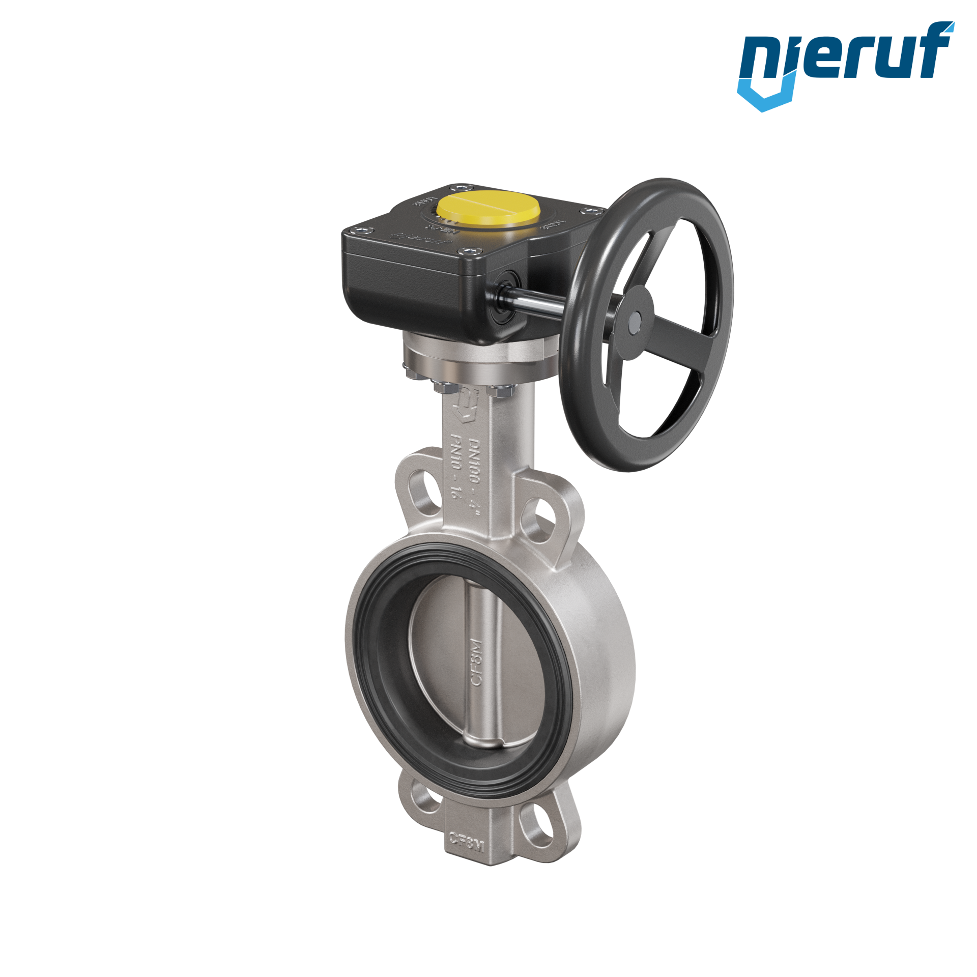 Przepustnica DN100 PN16 z otworami centrującymi, korpus i klapa ze stali nierdzewnej 1.4408, uszczelka z EPDM, z przekładnią