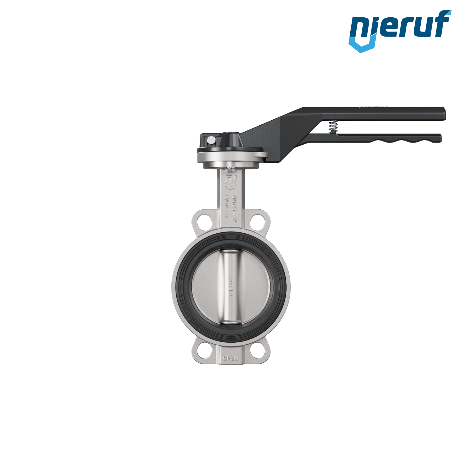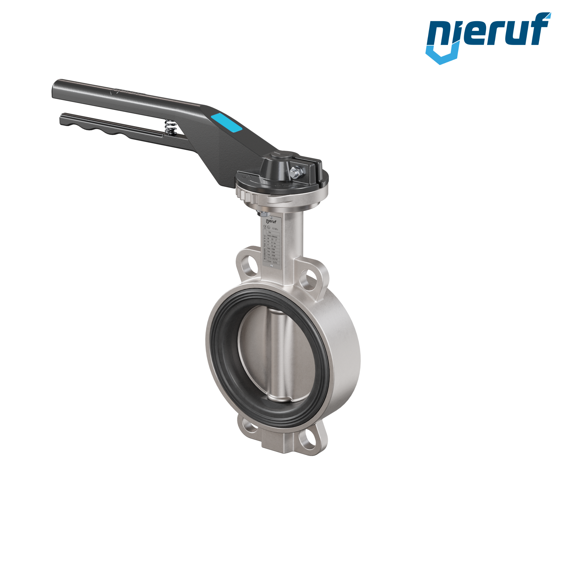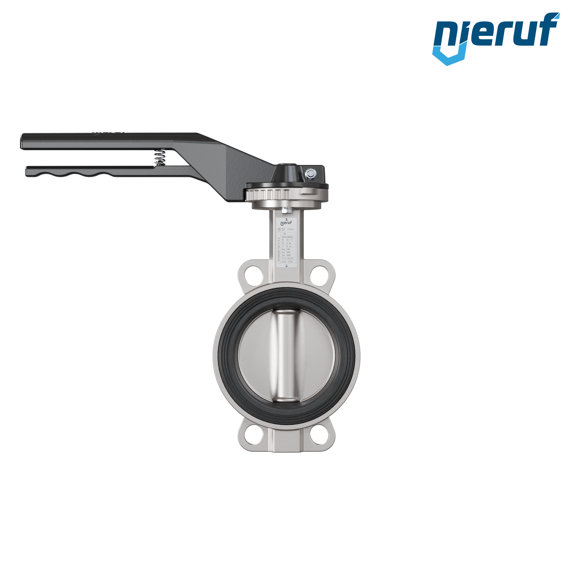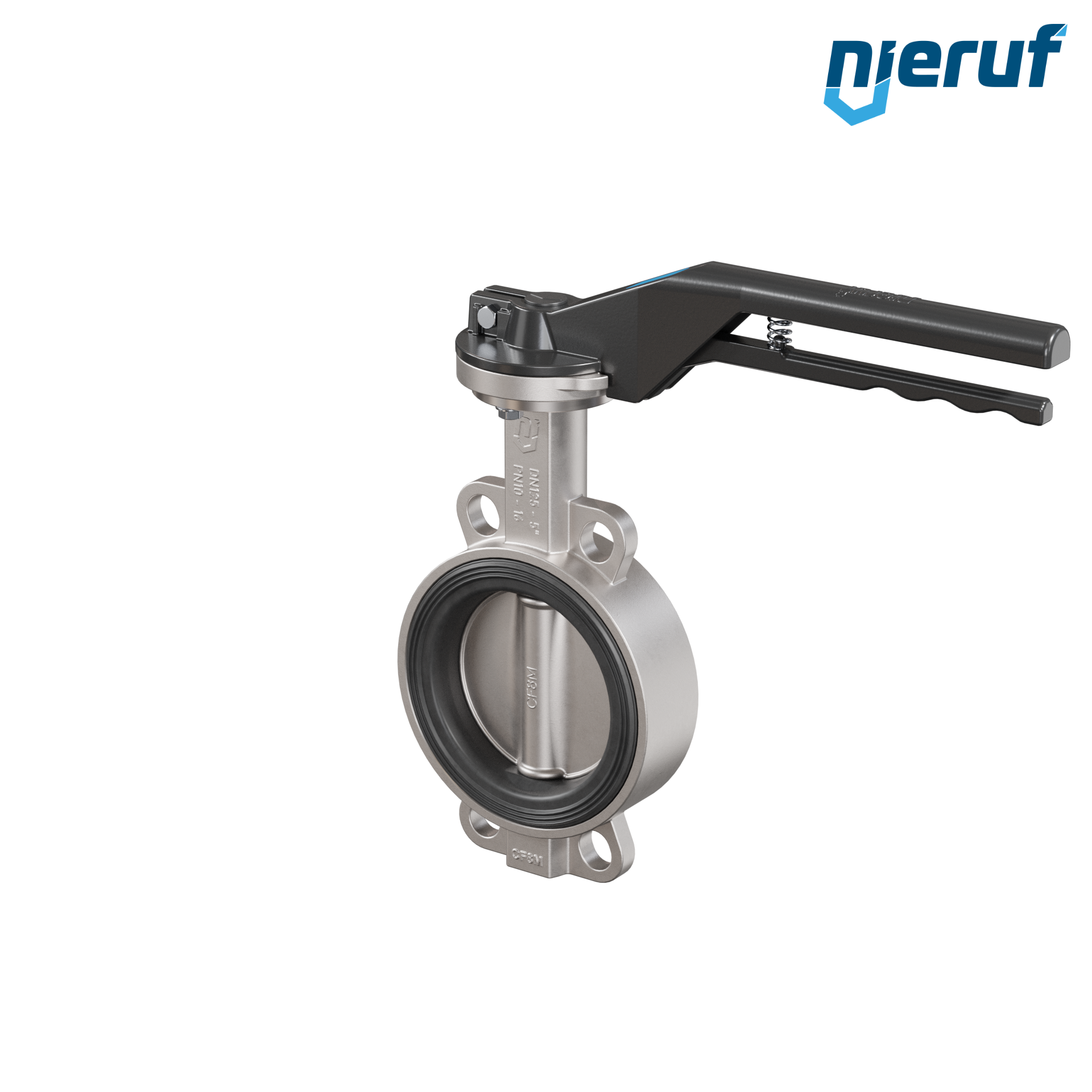 Przepustnica DN125 PN16 z otworami centrującymi, korpus i klapa ze stali nierdzewnej 1.4408, uszczelka z EPDM, z dźwignią ręczną