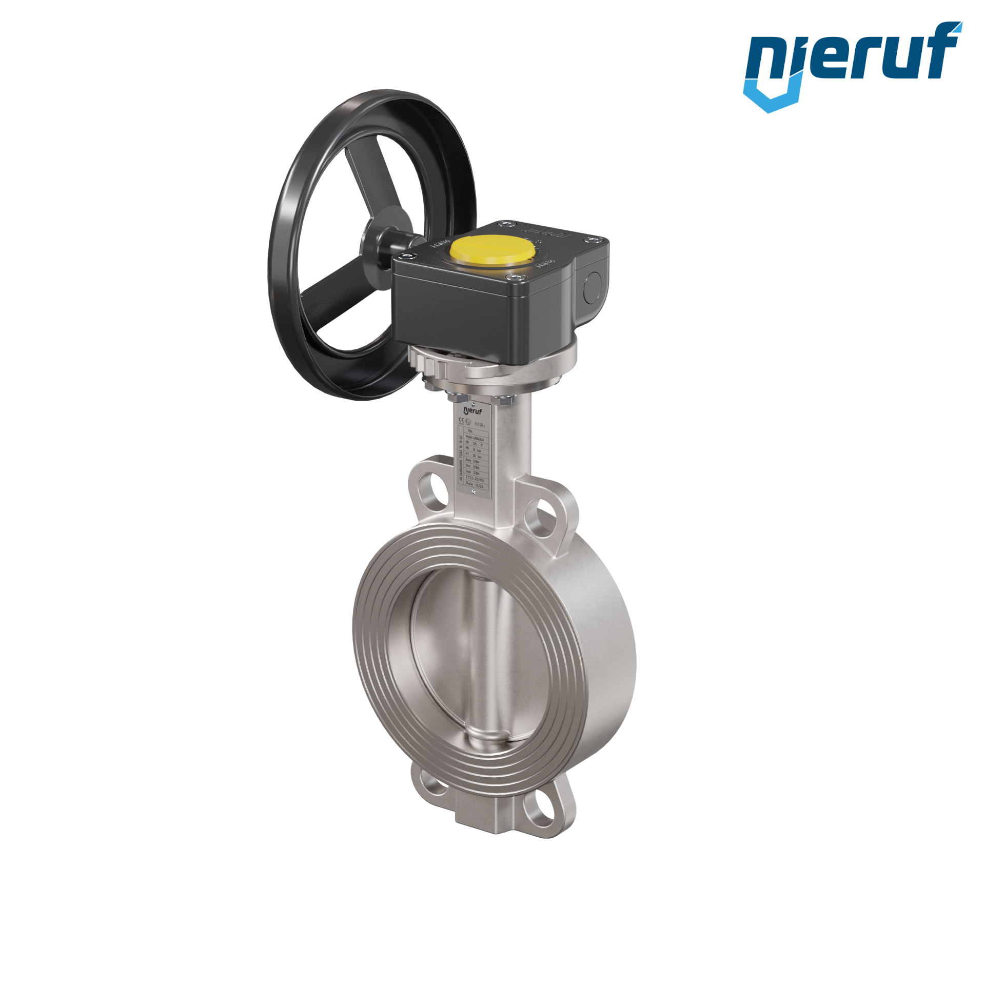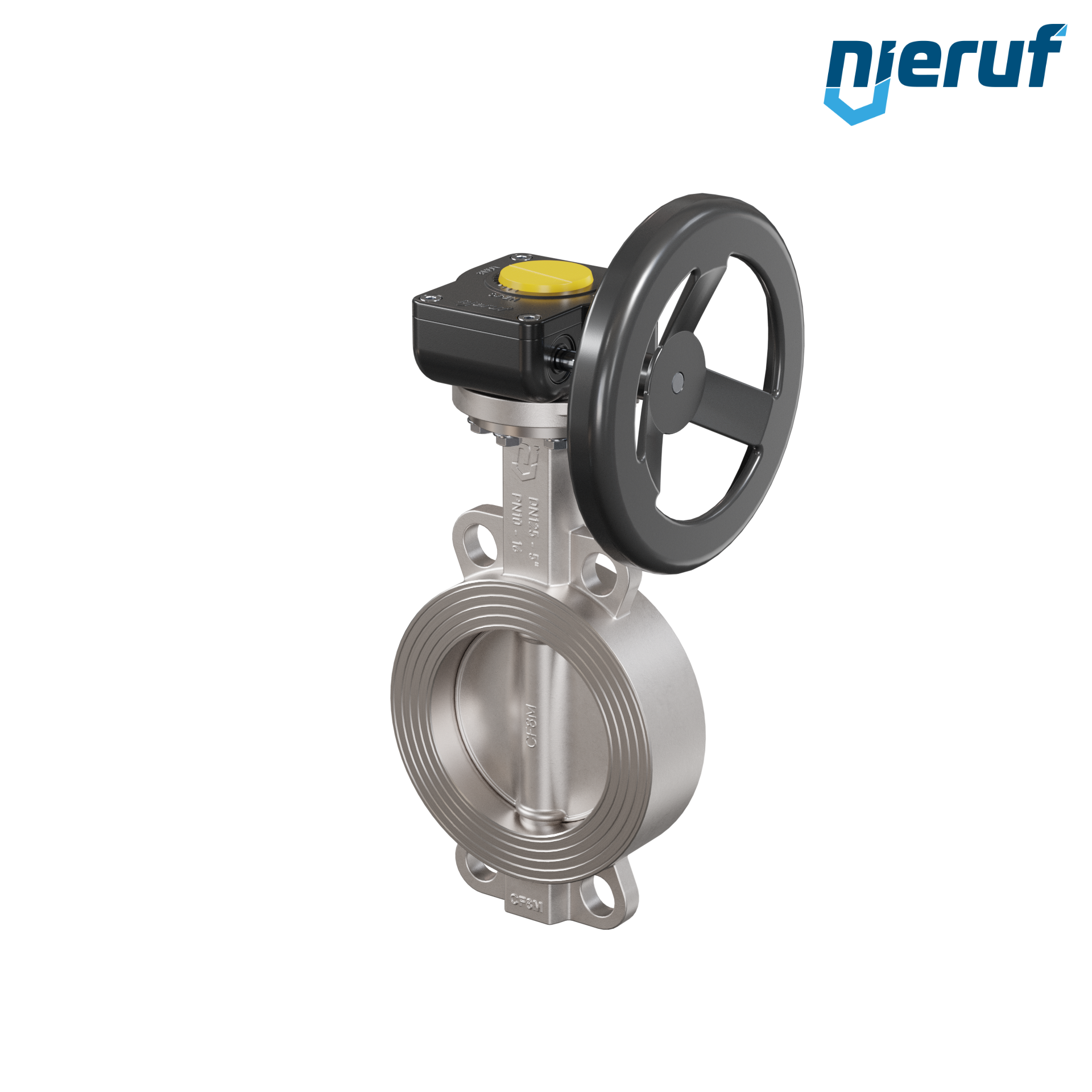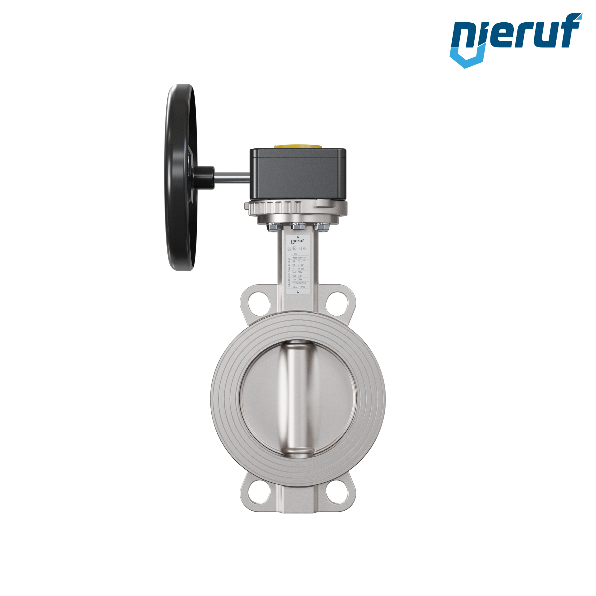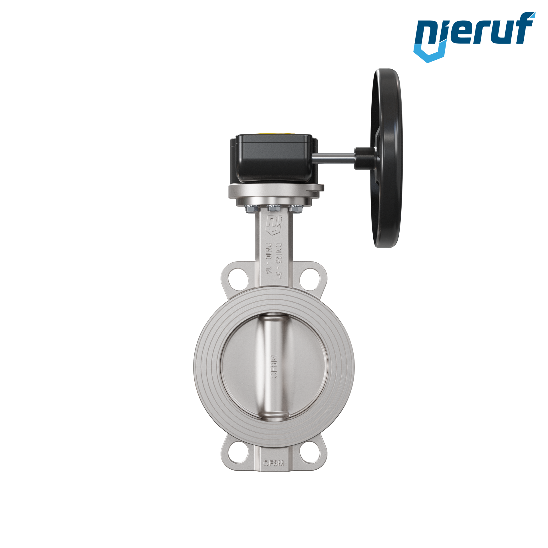 Przepustnica DN125 PN16 z otworami centrującymi, korpus i klapa ze stali nierdzewnej 1.4408, uszczelka z metalową, z przekładnią
