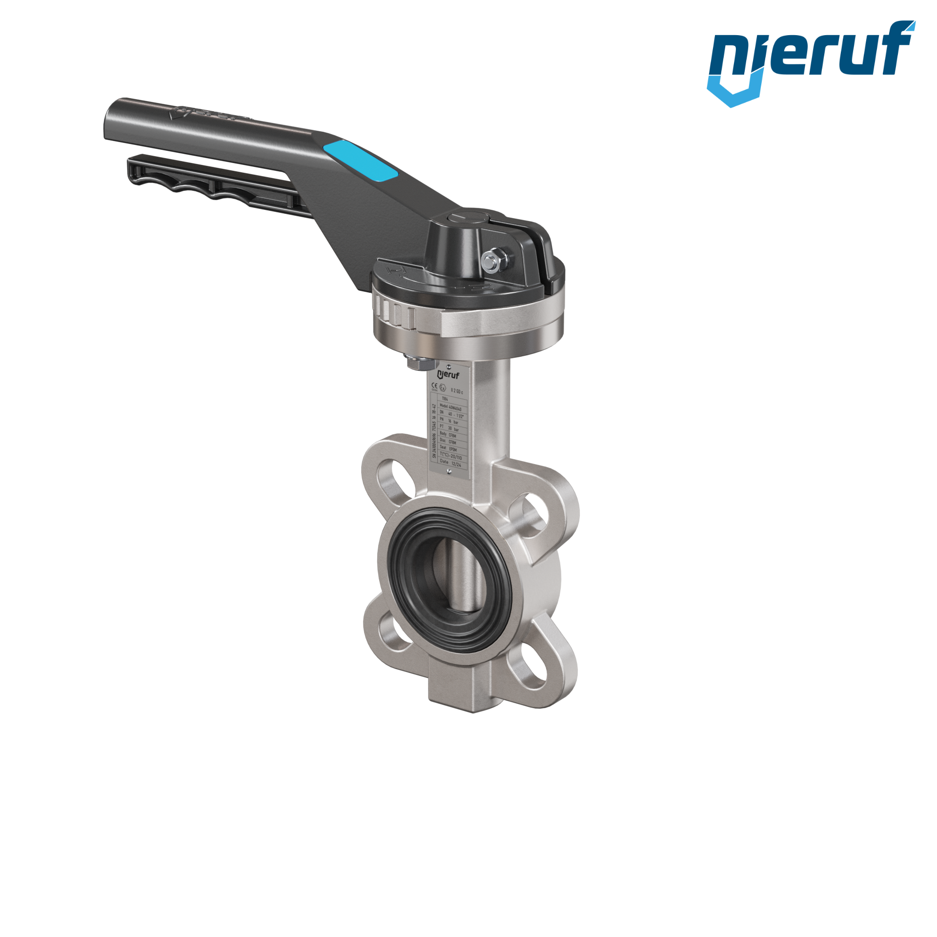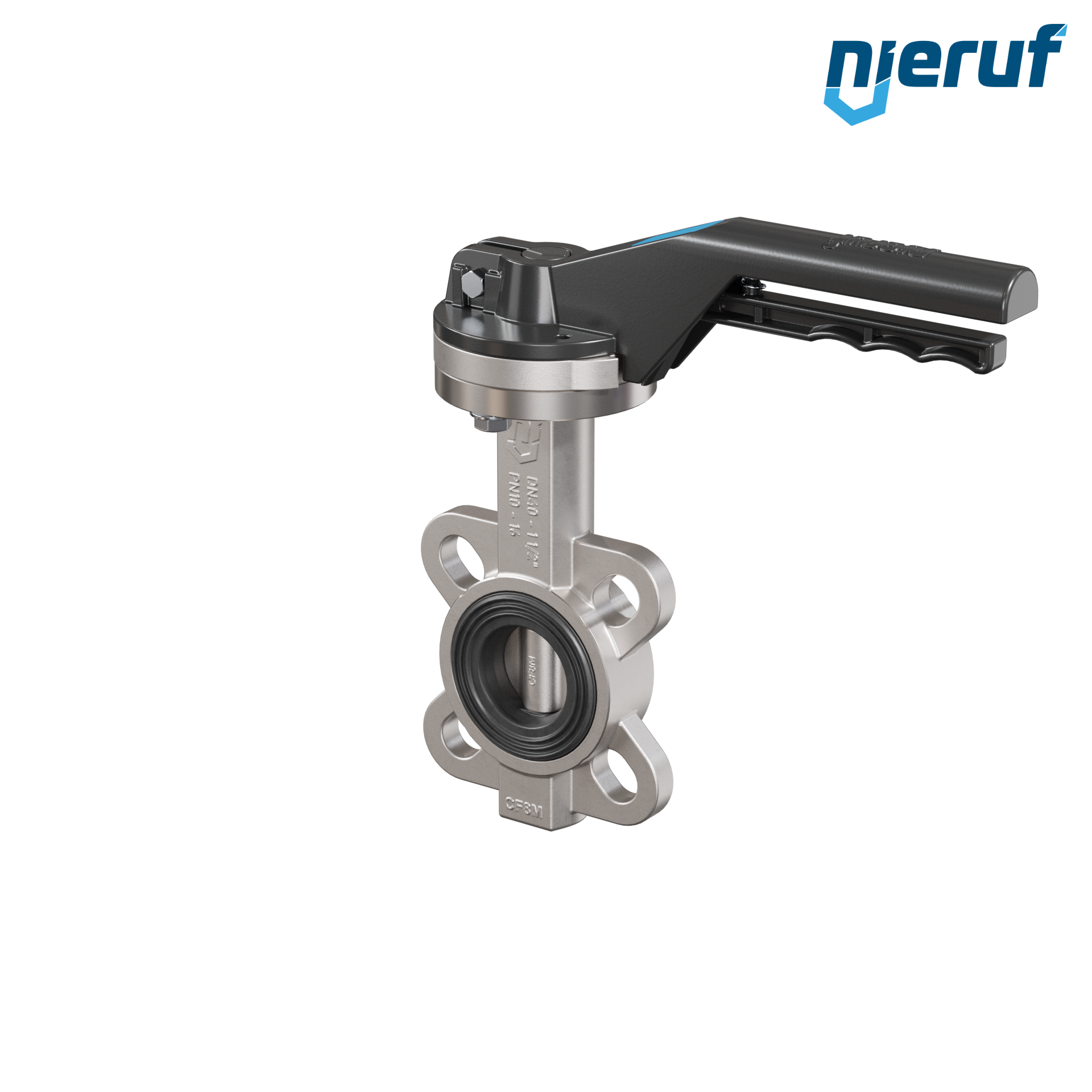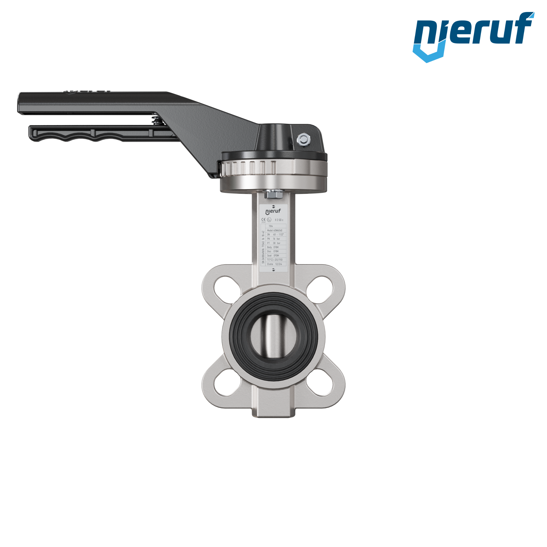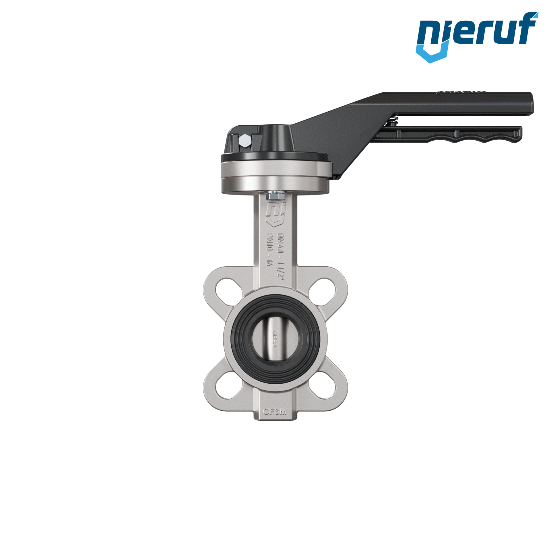 Przepustnica DN40 PN16 z otworami centrującymi, korpus i klapa ze stali nierdzewnej 1.4408, uszczelka z EPDM, z dźwignią ręczną