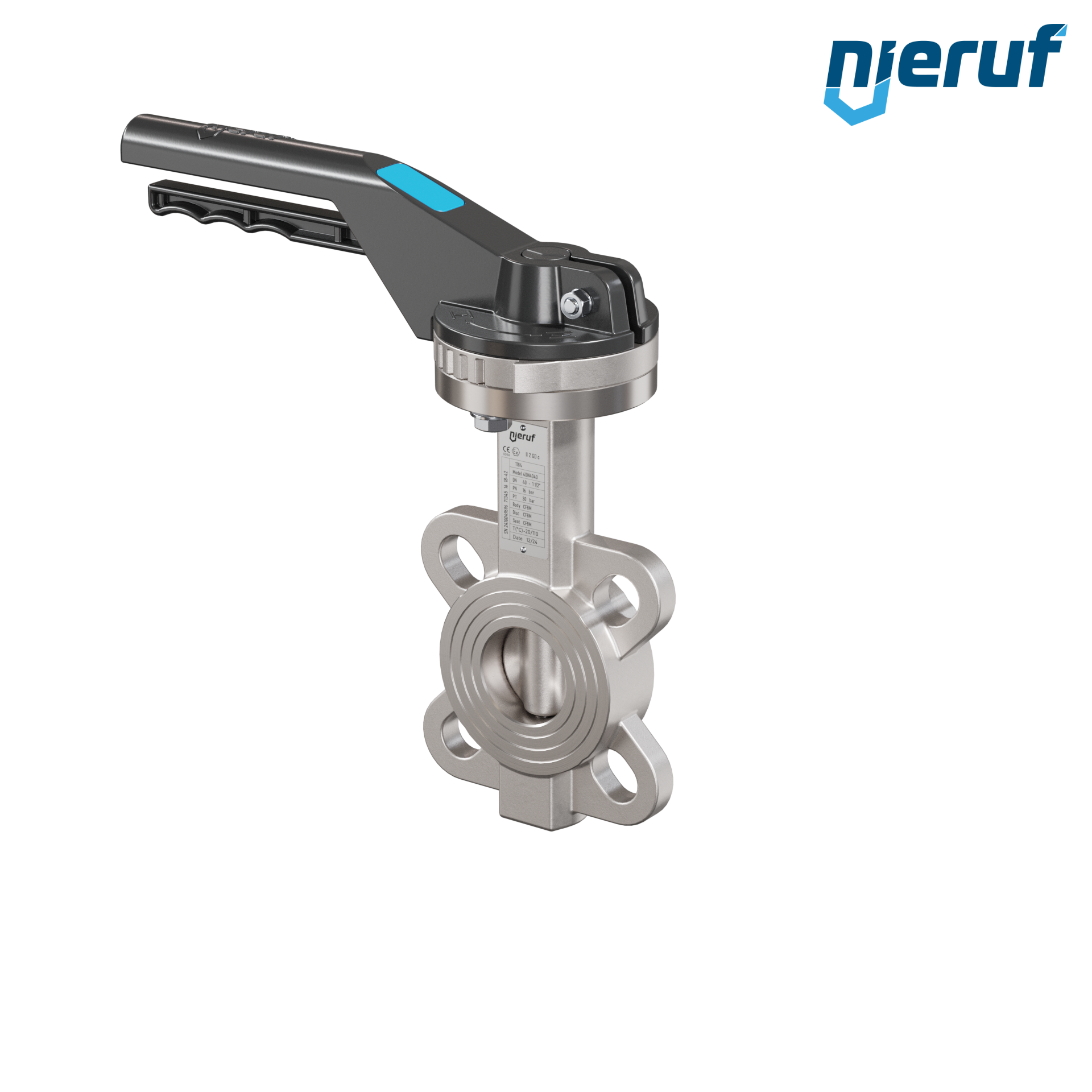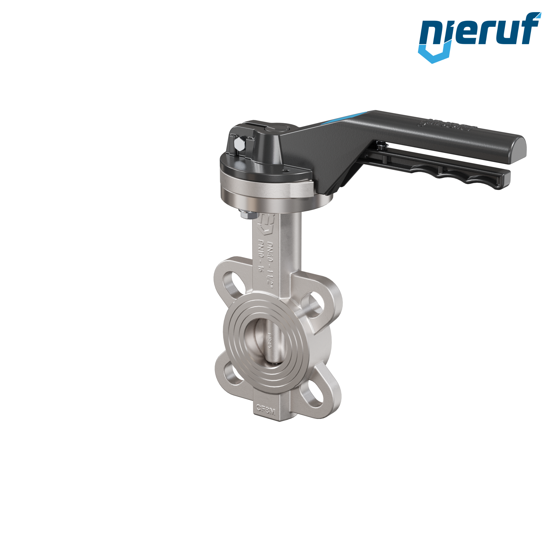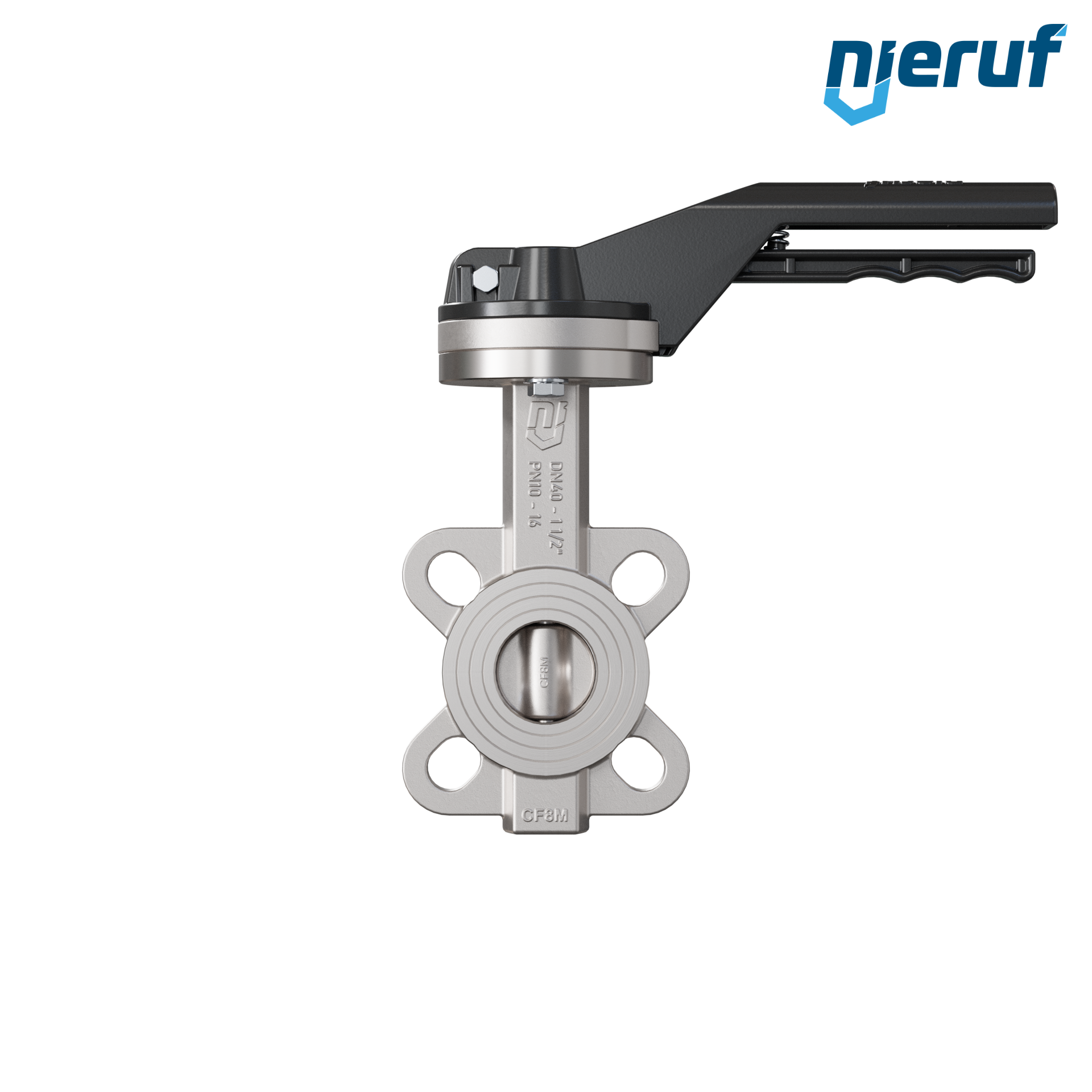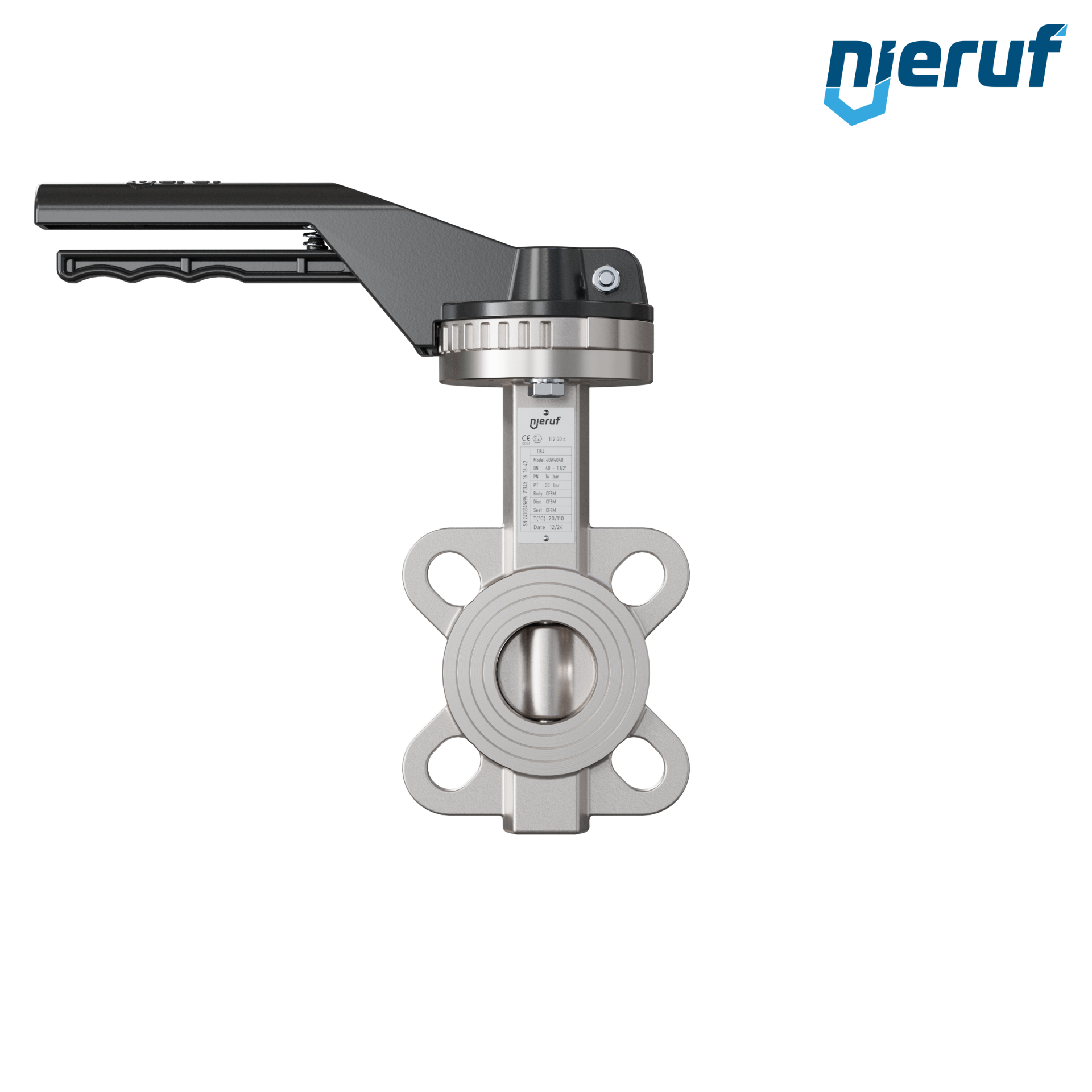 Przepustnica DN40 PN16 z otworami centrującymi, korpus i klapa ze stali nierdzewnej 1.4408, uszczelka z metalową, z dźwignią ręczną