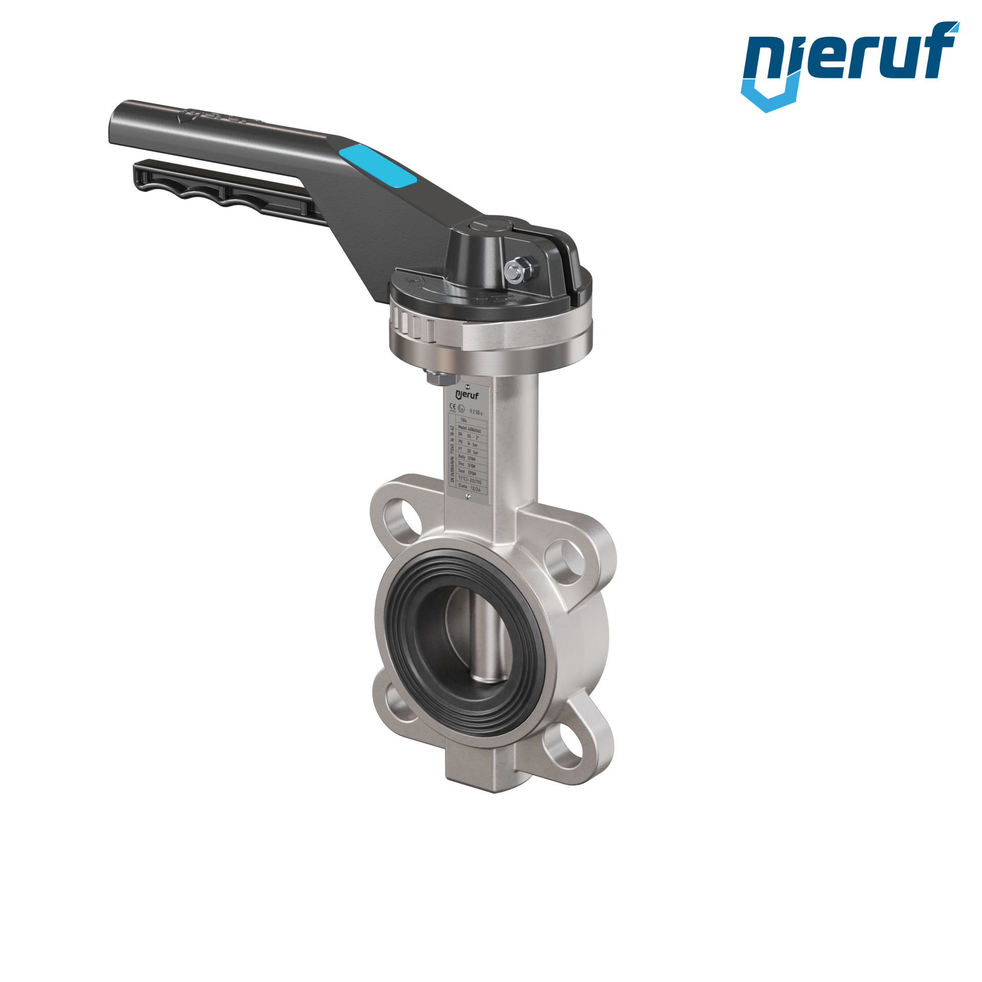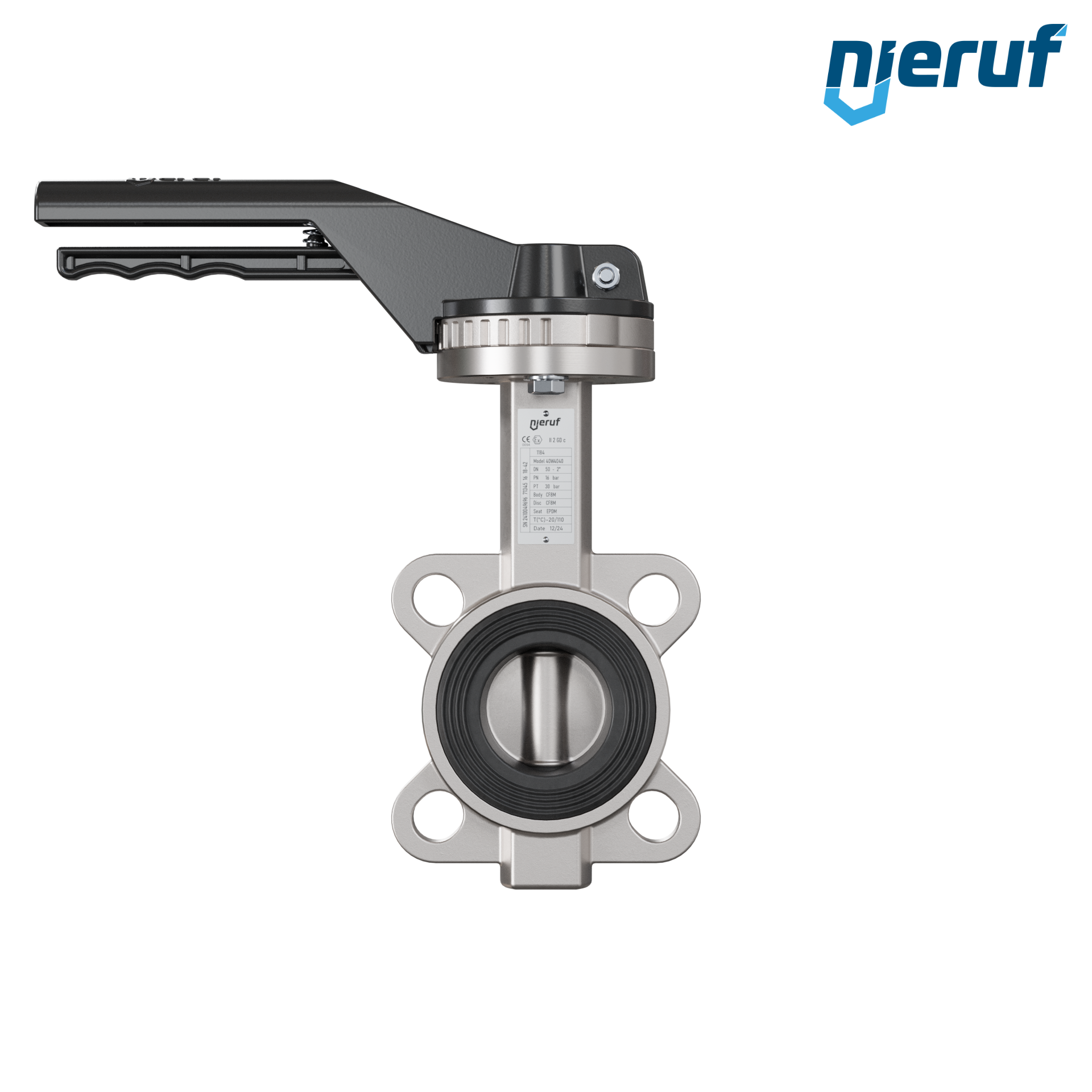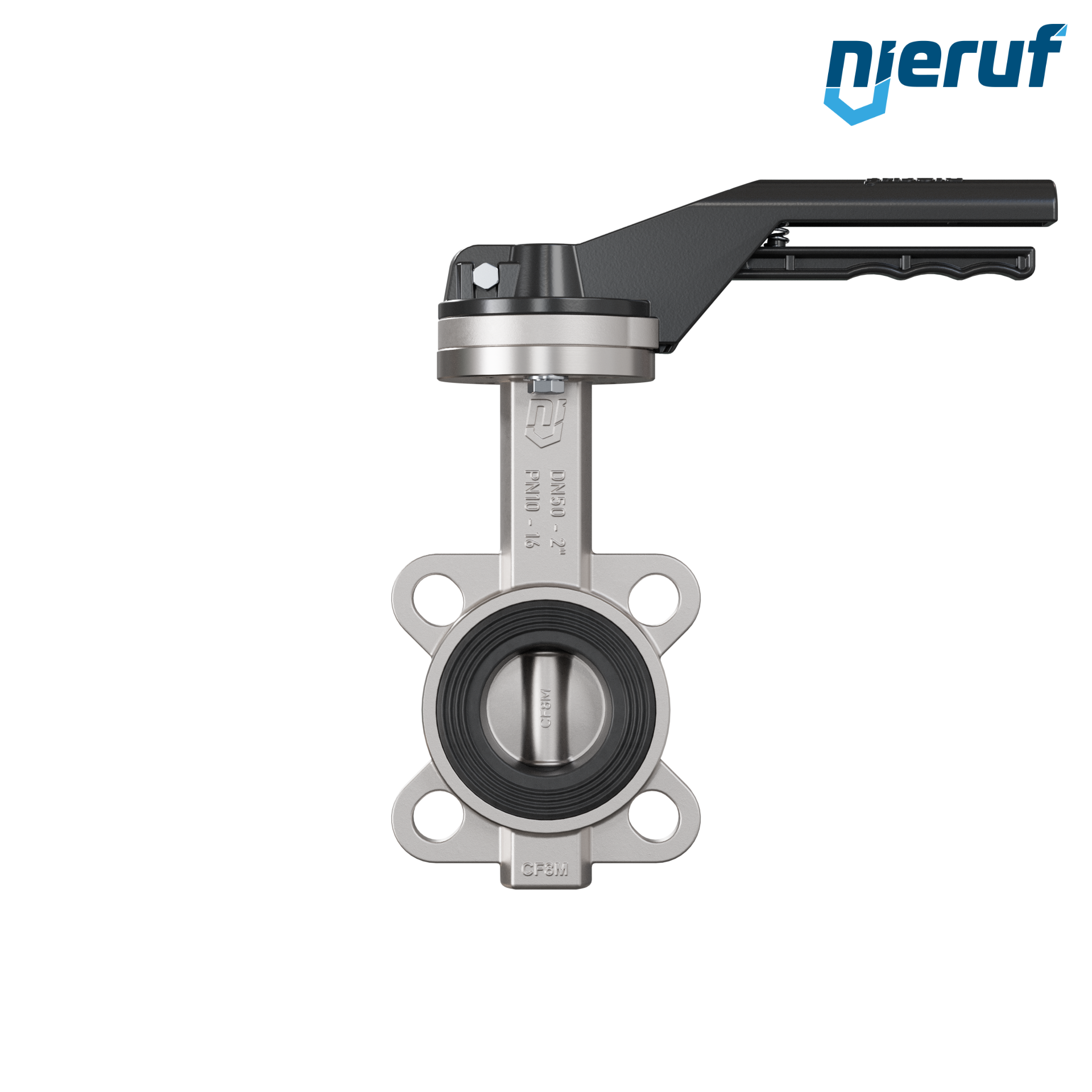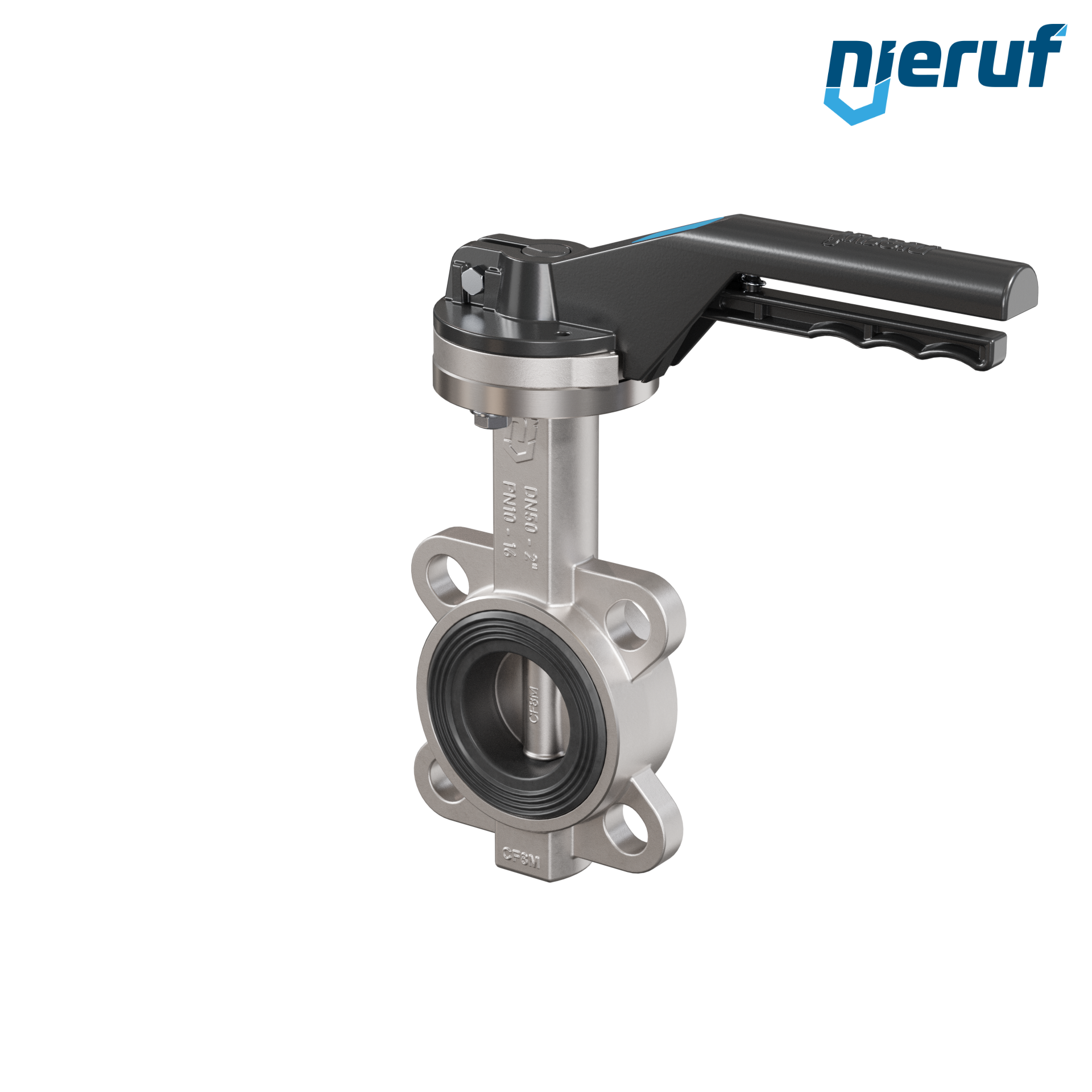 Przepustnica DN50 PN16 z otworami centrującymi, korpus i klapa ze stali nierdzewnej 1.4408, uszczelka z EPDM, z dźwignią ręczną