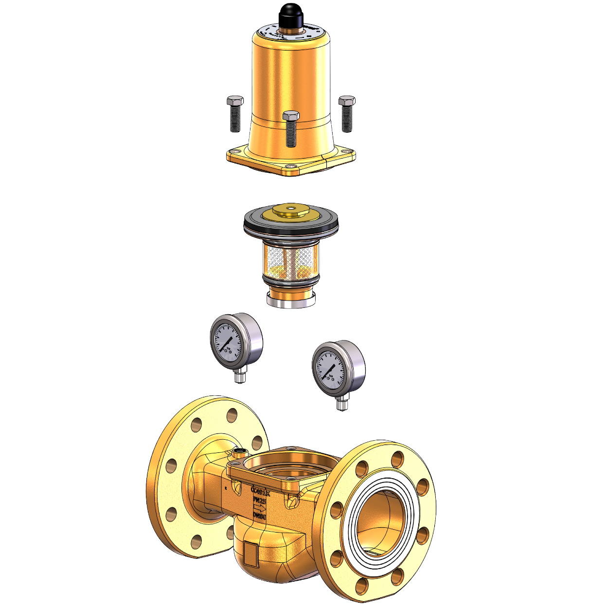 Cechy charakterystyczne produktu | Wysokiej jakości, odporna na wysoką temperaturę membrana z elastomeru z wkładką z tkaniny. Regulacja ciśnienia za pomocą niewznoszącego się wrzeciona. |