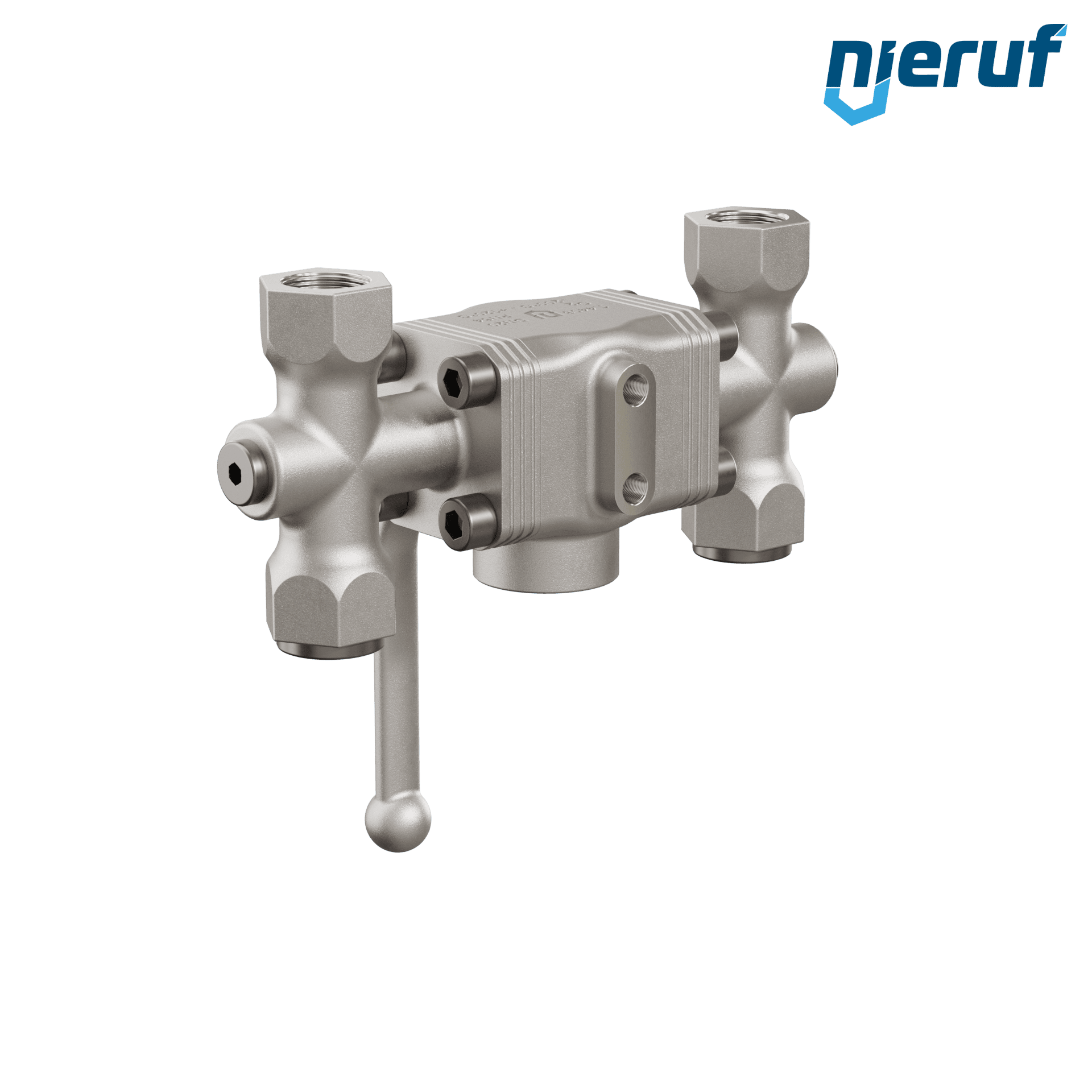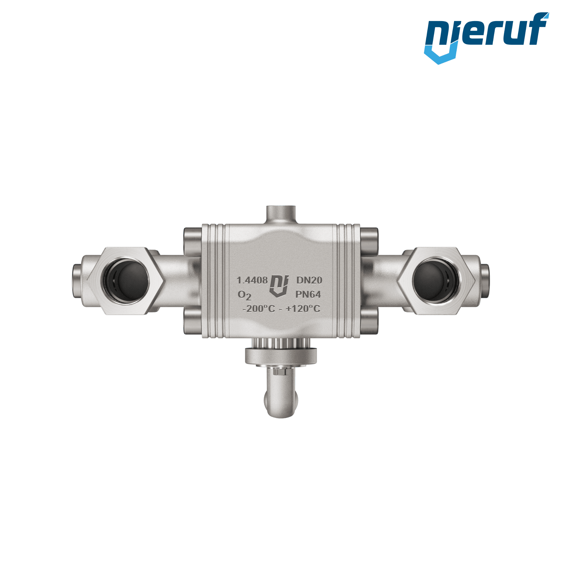 Rozdzielczy zawór kulowy z przyłączem gwintowanym ze stali nierdzewnej do montażu dwóch zaworów bezpieczeństwa do ochrony zbiorników do przechowywania skroplonych gazów kriogenicznych. Z otworem typu L.
