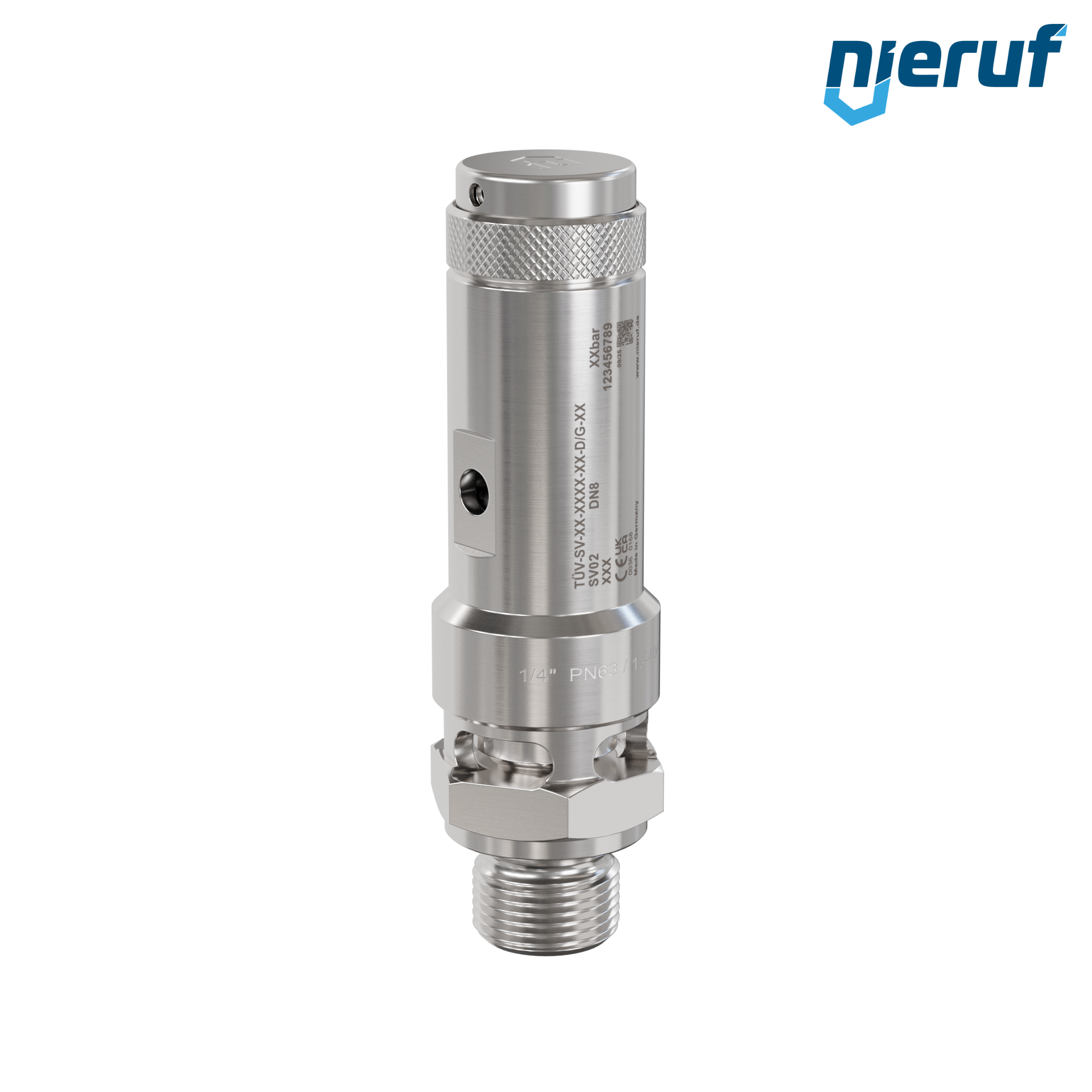 Zawór bezpieczeństwa 1/4" GZ typ SV02 swobodny wydmuch do sprężonego powietrza i pneumatyki, ze stali nierdzewnej uszczelnienie FKM , zakres ciśnienia 0,2 - 25,0 bar - wyższe ciśnienia możliwe w wersji PTFE