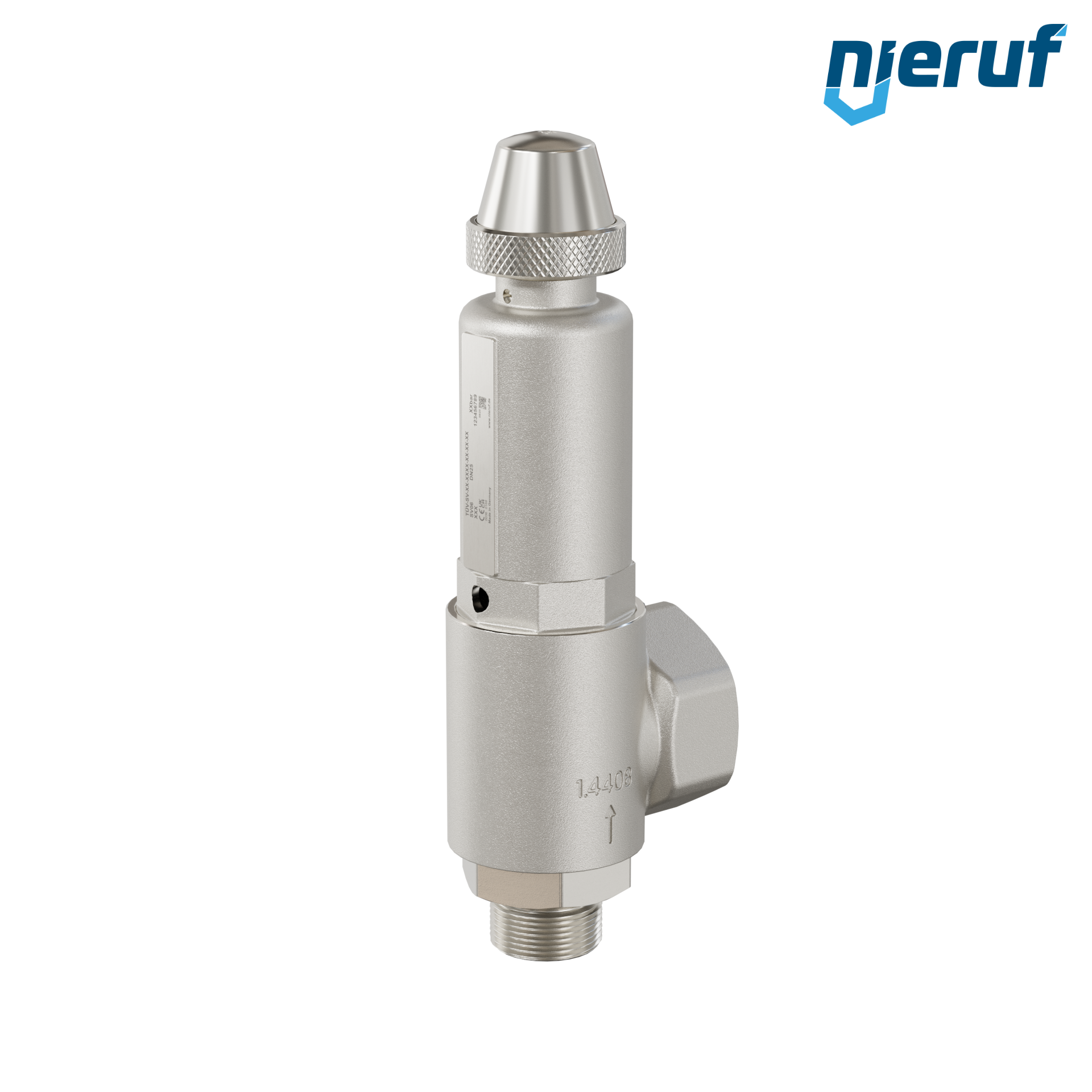 Kątowy zawór bezpieczeństwa z mieszkiem do płynnych mediów 1" GZ x 1 1/2" GW ze stali nierdzewnej typ SV06 gwint zewnętrzny BSP-P PTFE z obrotowy mechanizm podnoszący