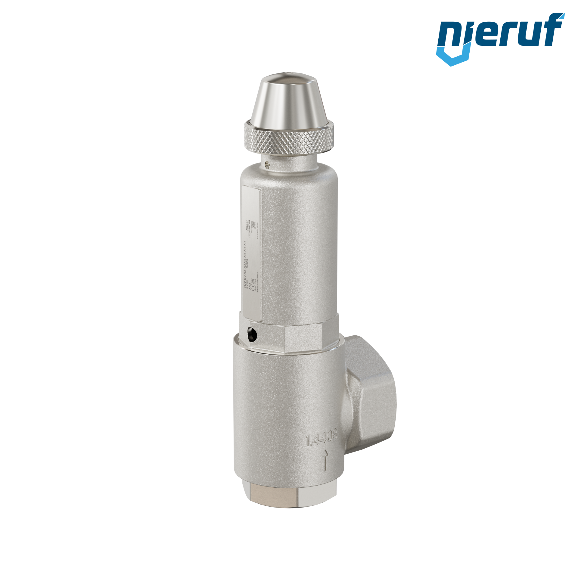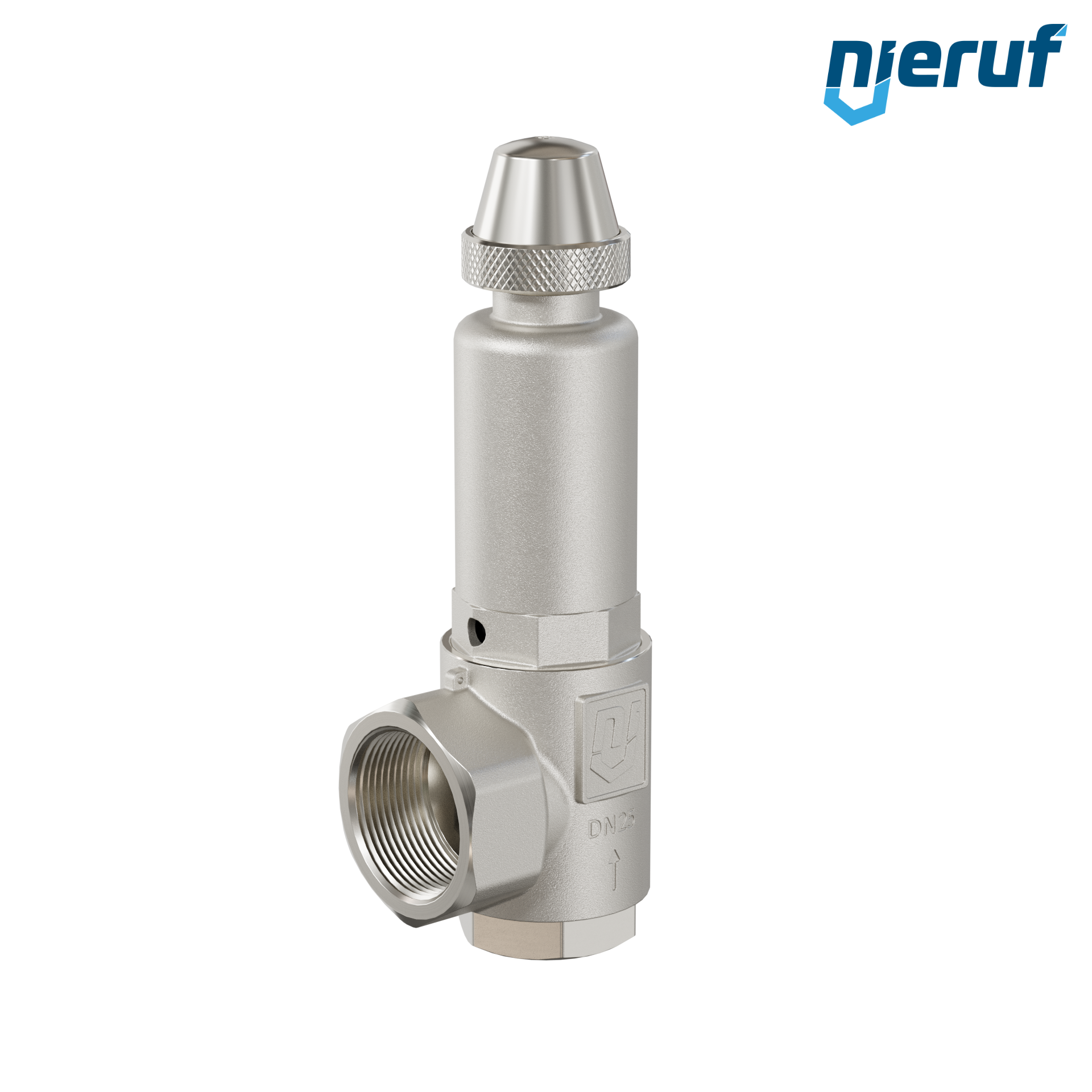 Kątowy zawór bezpieczeństwa płynne media 1" x 1 1/2" GW z mieszkiem ze stali nierdzewnej typ SV06 Gwint wewnętrzny BSP-P uszczelnienie EPDM z obrotowy mechanizm podnoszący