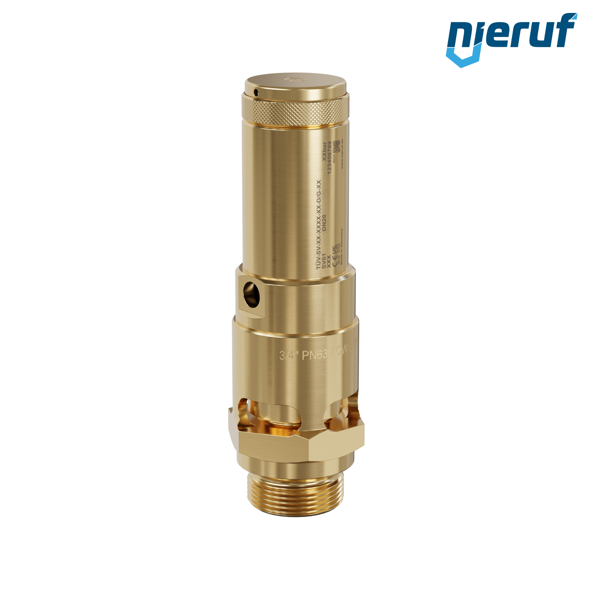 Mosiężny zawór bezpieczeństwa 3/4" GZ typ SV01 swobodny wydmuch do sprężonego powietrza i pneumatyki, uszczelnienie z FKM, zakres ciśnienia 0,2 - 25,0 bar - wyższe ciśnienia możliwe w wersji PTFE
