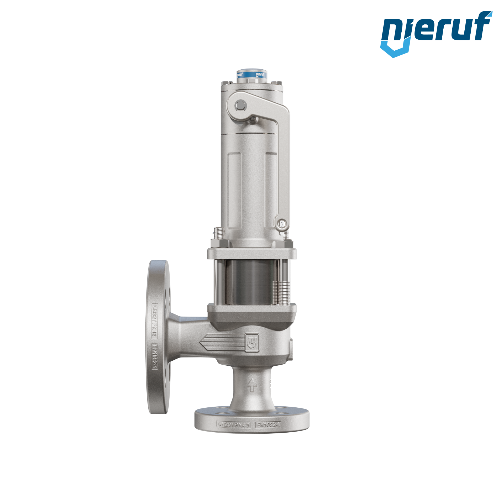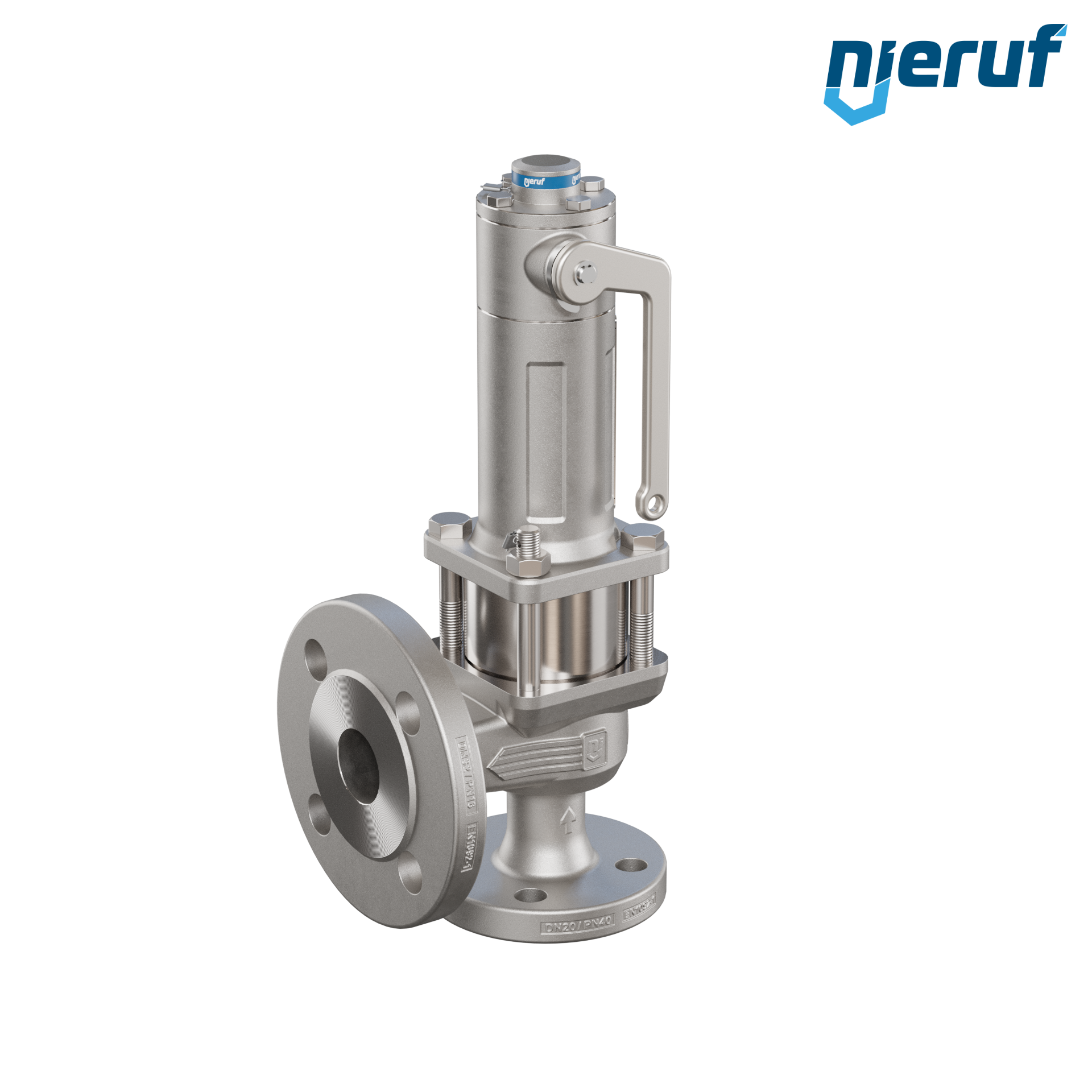 Kołnierzowy zawór bezpieczeństwa DN20/DN32 SF04 gazoszczelny z mieszkiem ze stali nierdzewnej 1.4408 uszczelnienie Metal zakres ciśnienia 0,8 - 40,0 bar z dźwignią podnoszącą