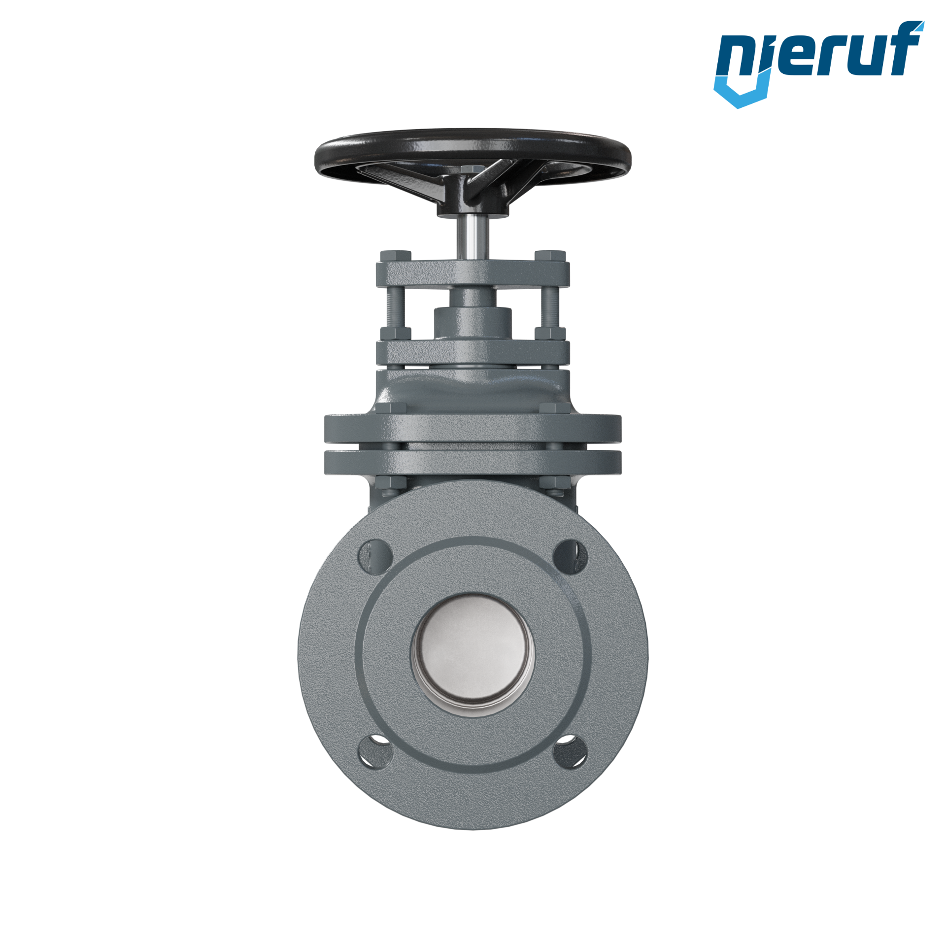 zasuwa płaskoklinowa z żeliwa szarego w formie przelotowej z przyłączem kołnierzowym i wewnętrznym wrzecionem oraz nierosnące koło ręczne.