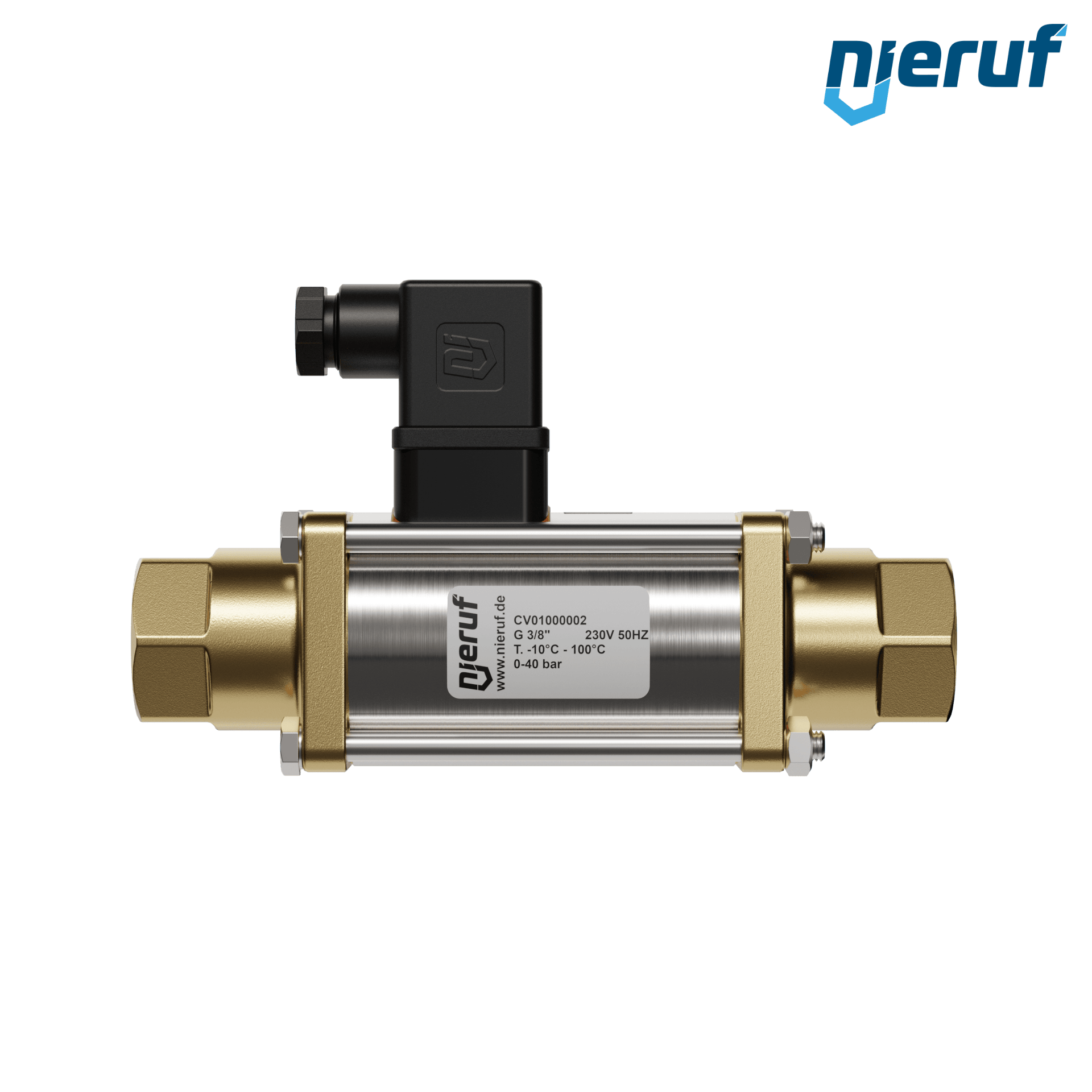 2/2 - drogowy zawór współosiowy 3/8" cala gwint wewnętrzny z mosiądzu, sterowany bezpośrednio do maks. 40 bar, NC - normalnie zamknięty, napięcie 230V AC